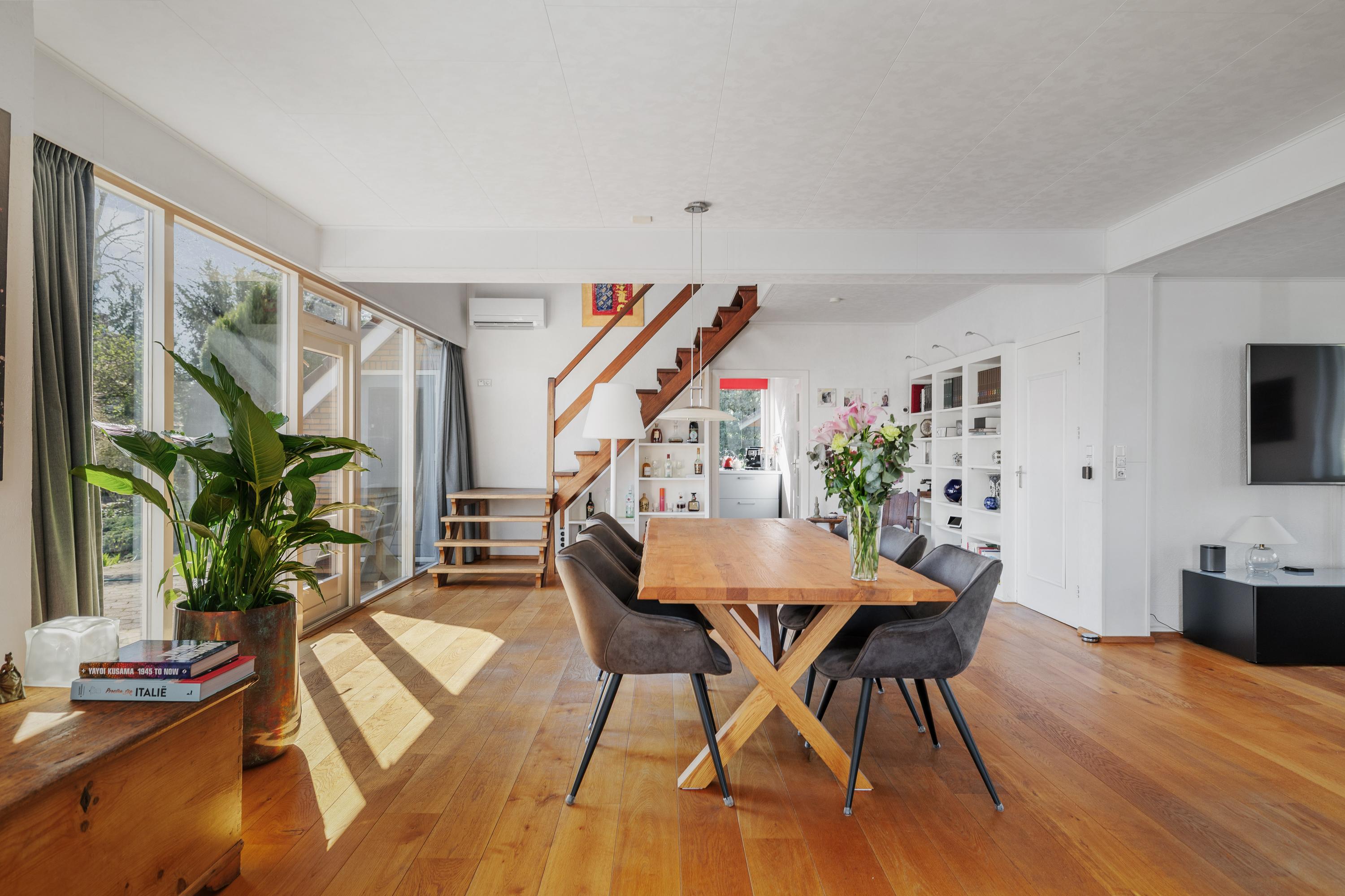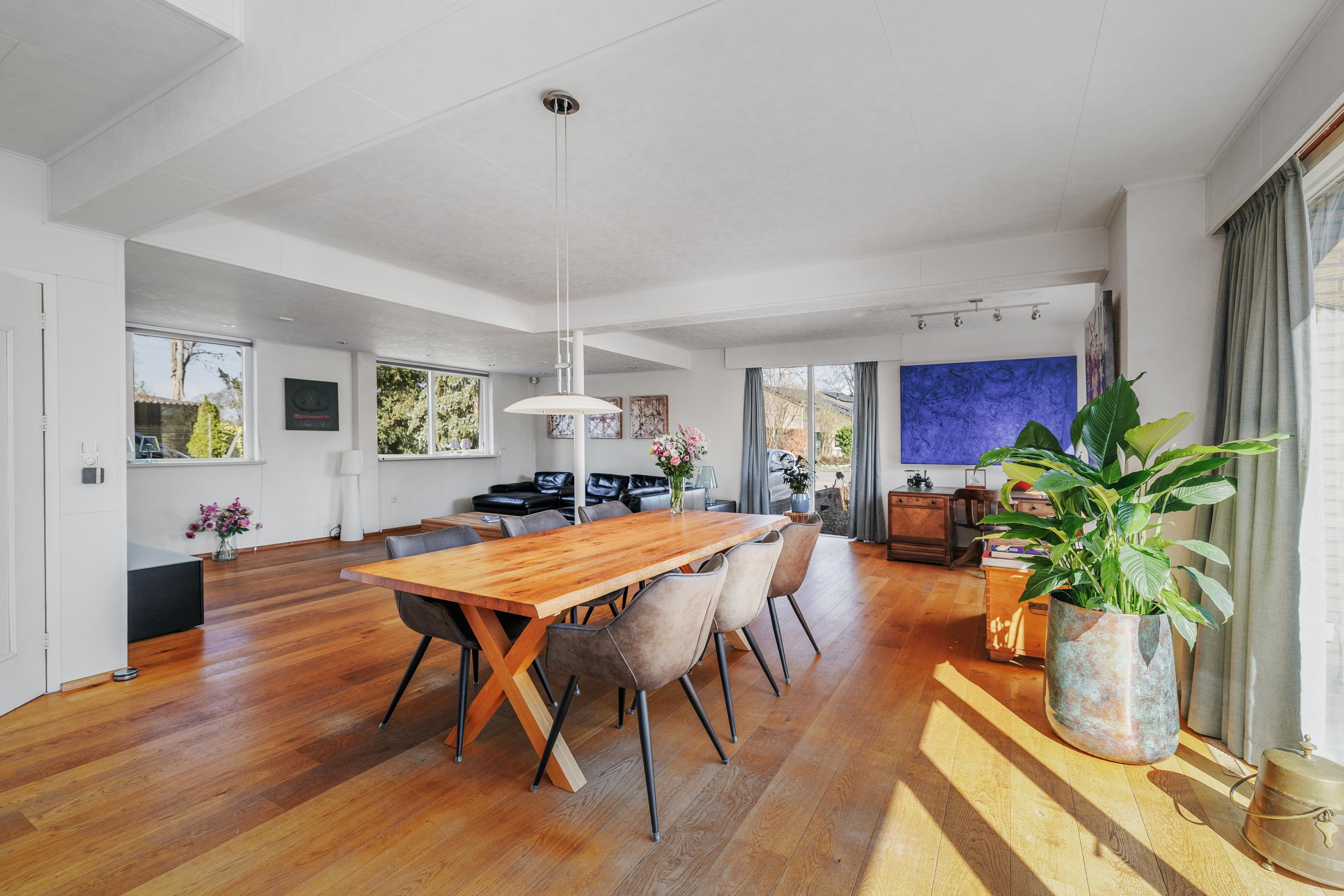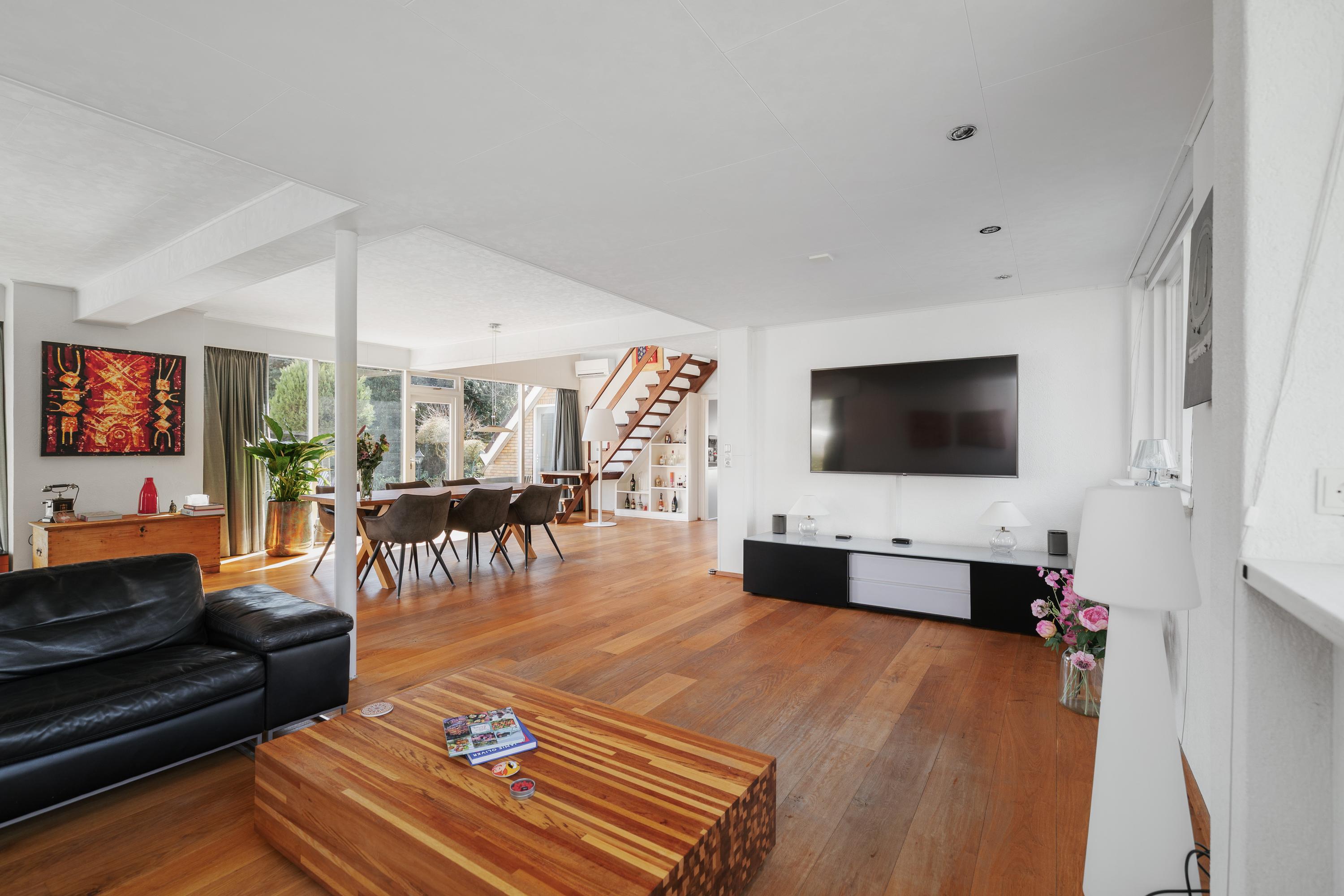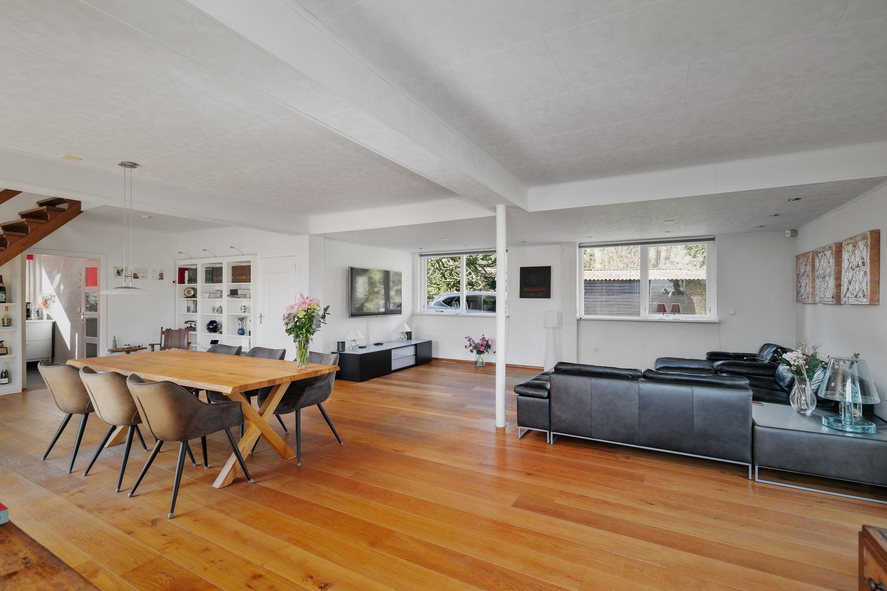 Bij binnenkomst valt direct de royale opzet van de woning op. De ruime woonkamer vormt het hart van het huis en biedt een prettige lichtinval en een fijne verbinding met de tuin. De indeling maakt het eenvoudig om verschillende woonfuncties te creëren: een comfortabele zithoek, een ruime eethoek en eventueel een werkplek.
