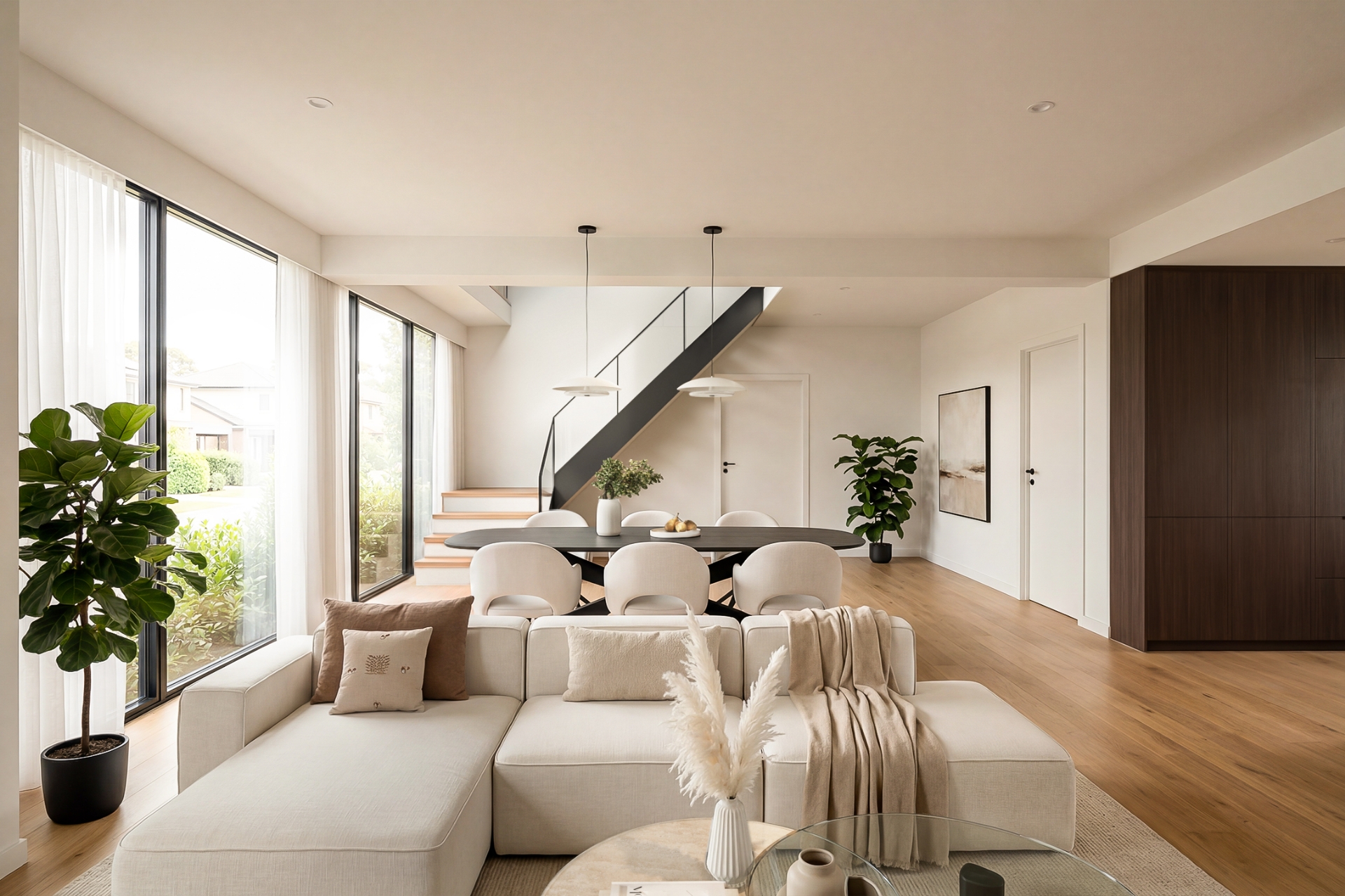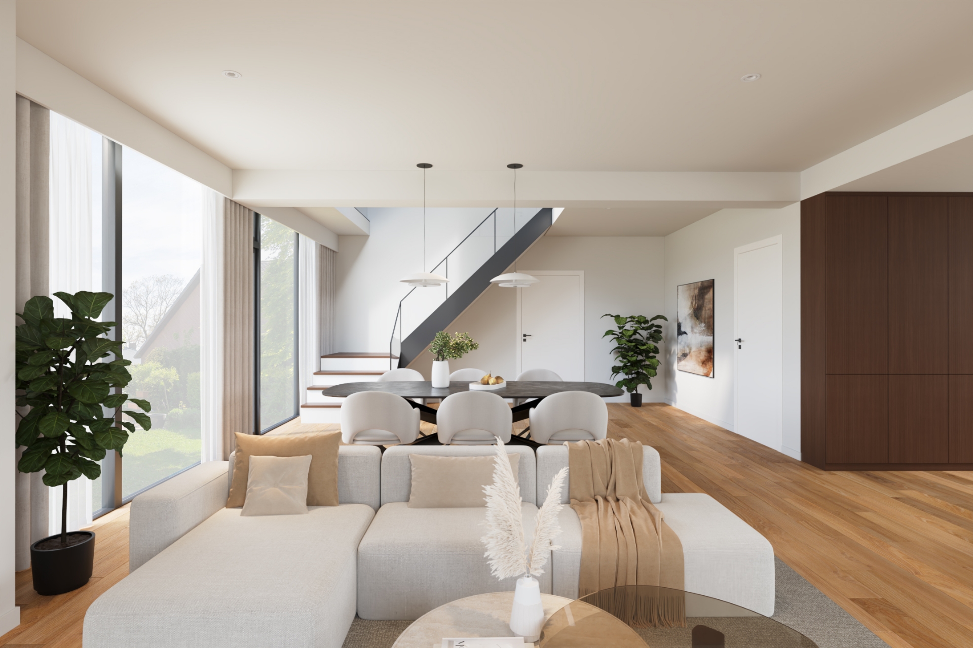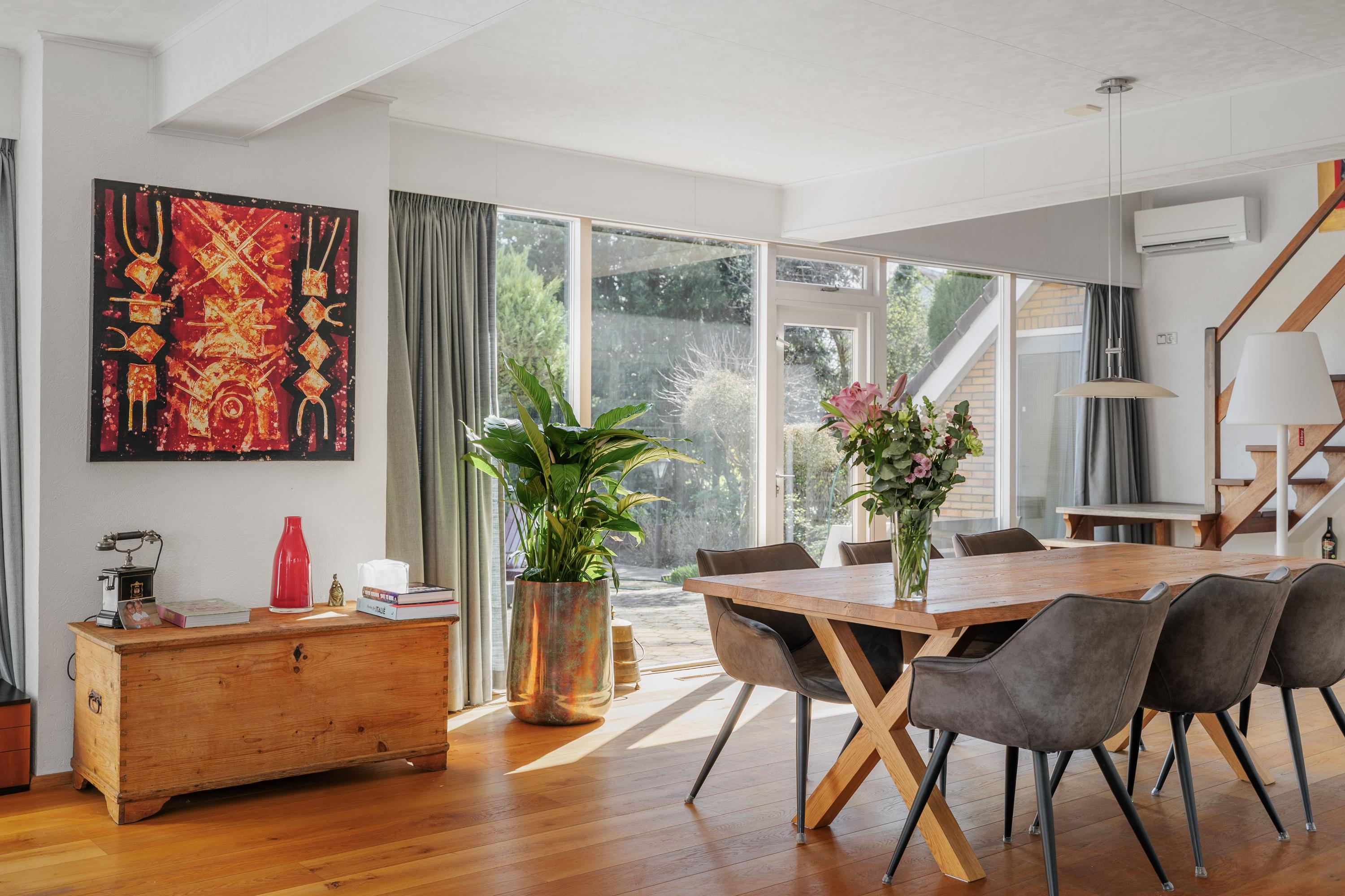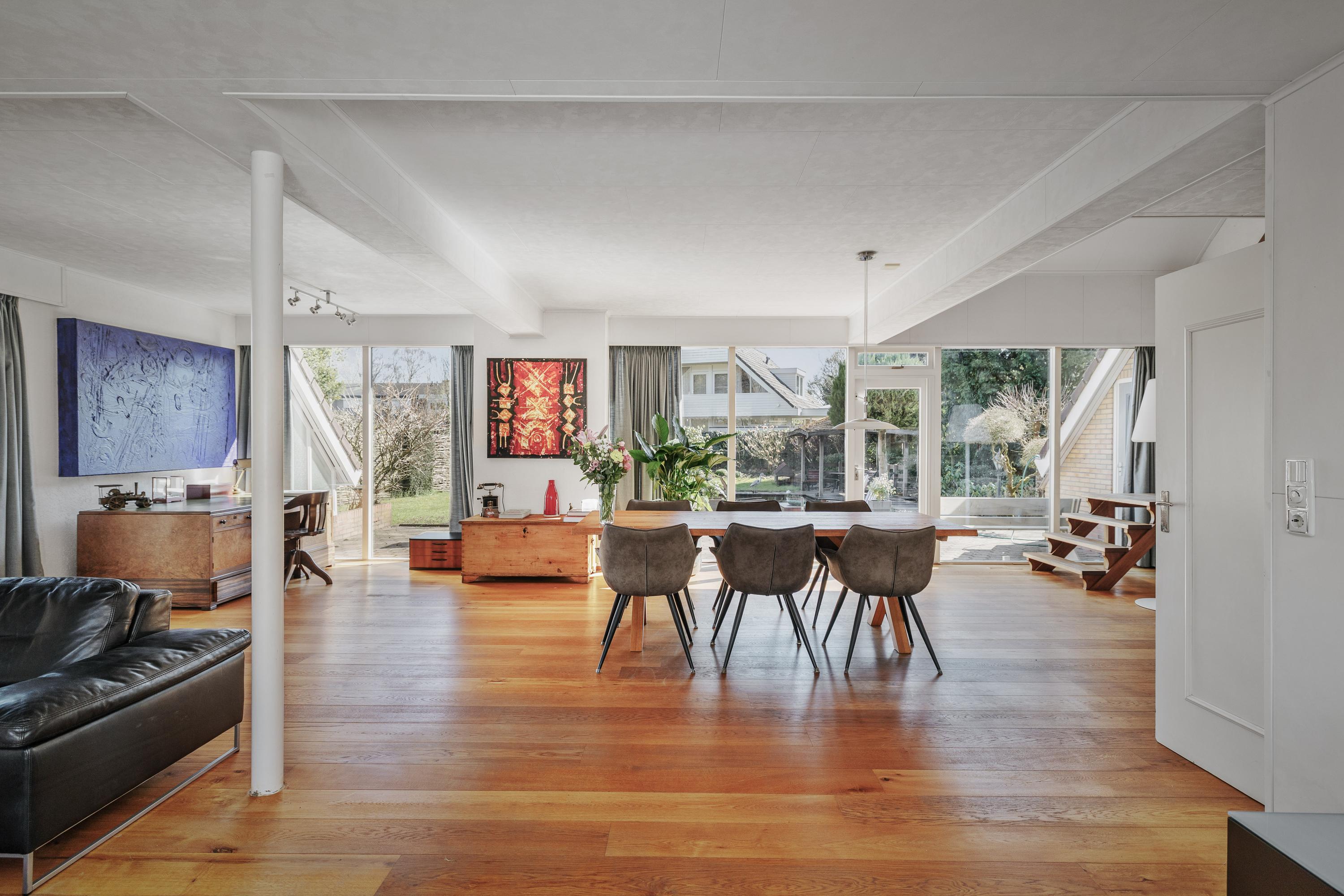 Bij binnenkomst valt direct de royale opzet van de woning op. De ruime woonkamer vormt het hart van het huis en biedt een prettige lichtinval en een fijne verbinding met de tuin. De indeling maakt het eenvoudig om verschillende woonfuncties te creëren: een comfortabele zithoek, een ruime eethoek en eventueel een werkplek.