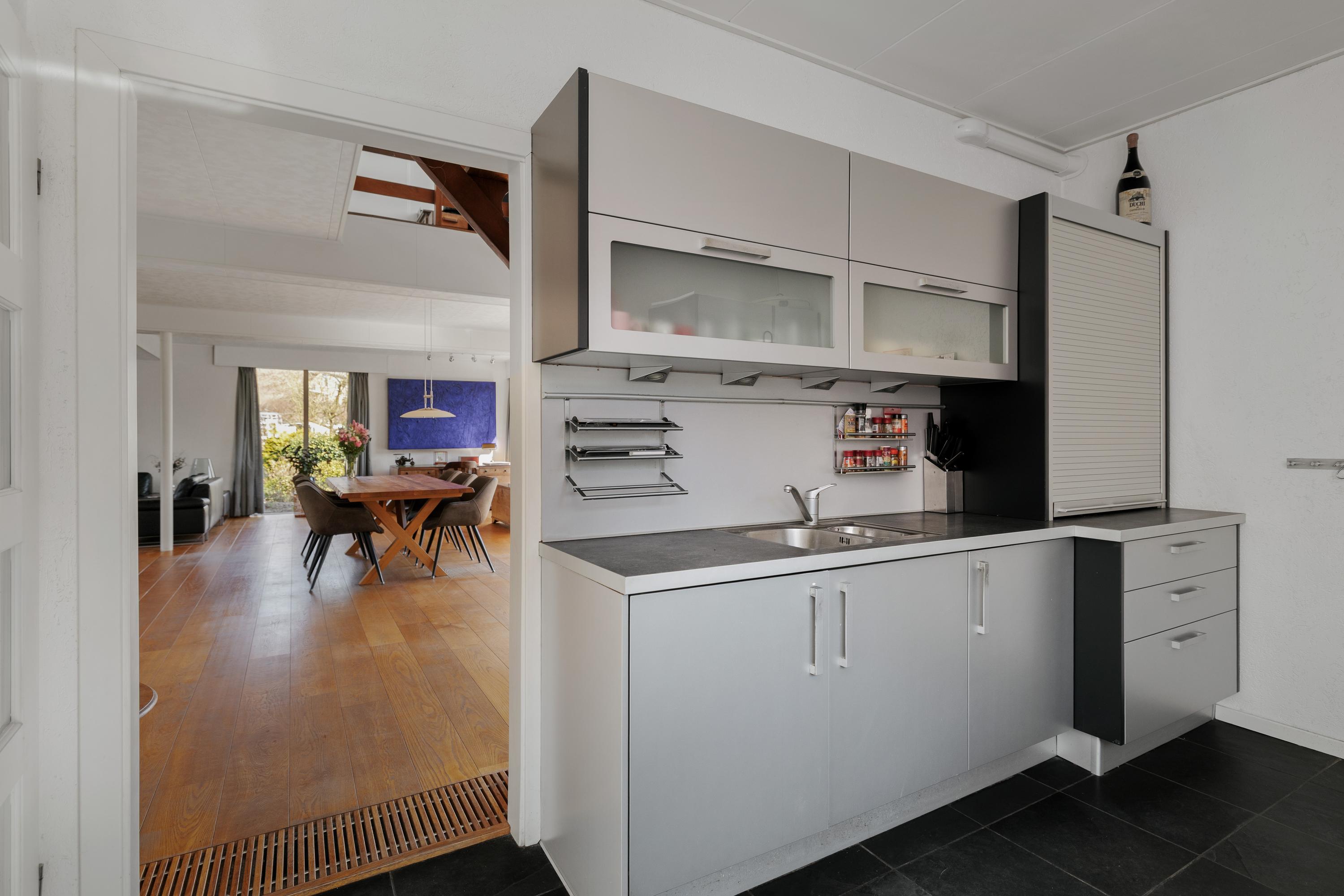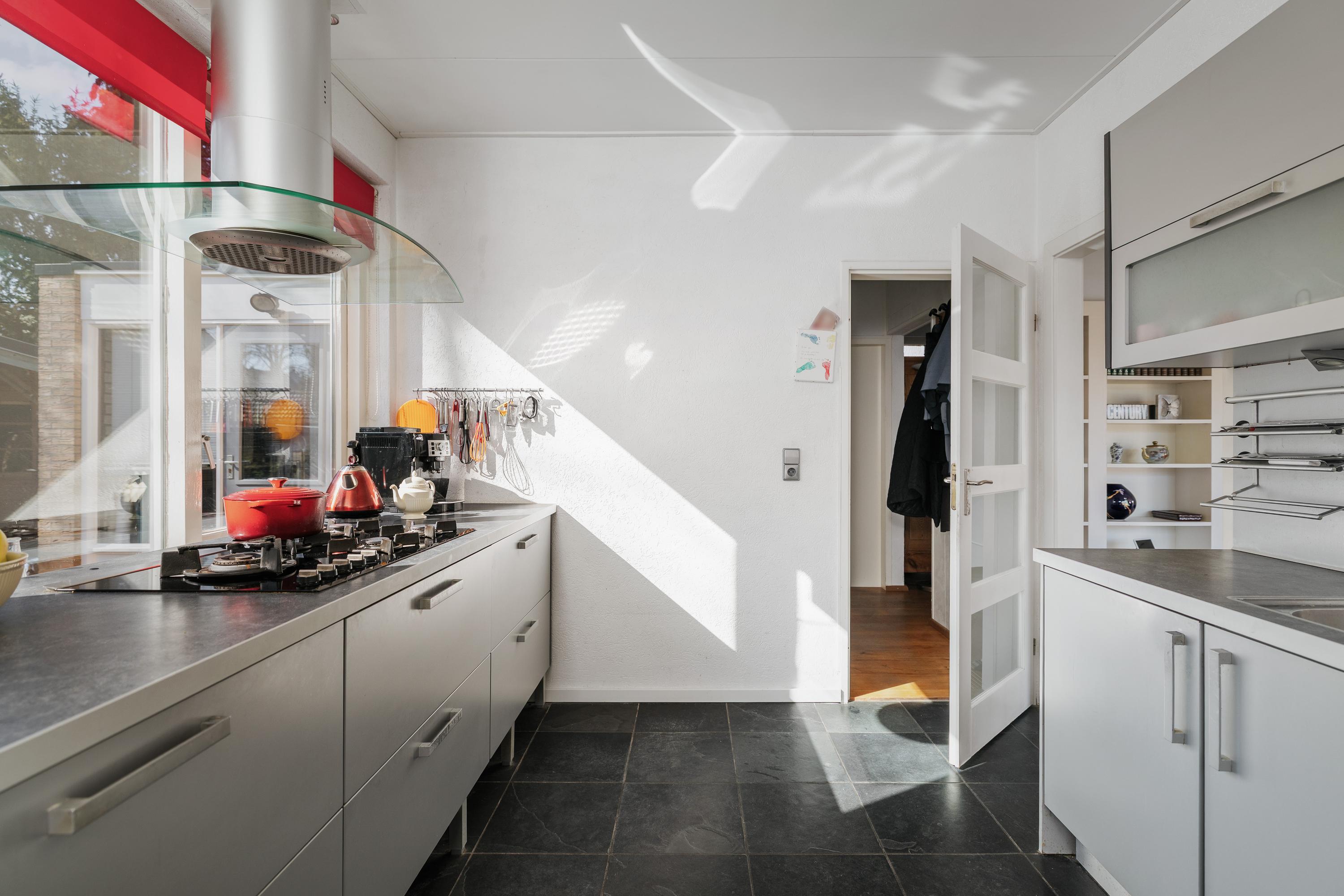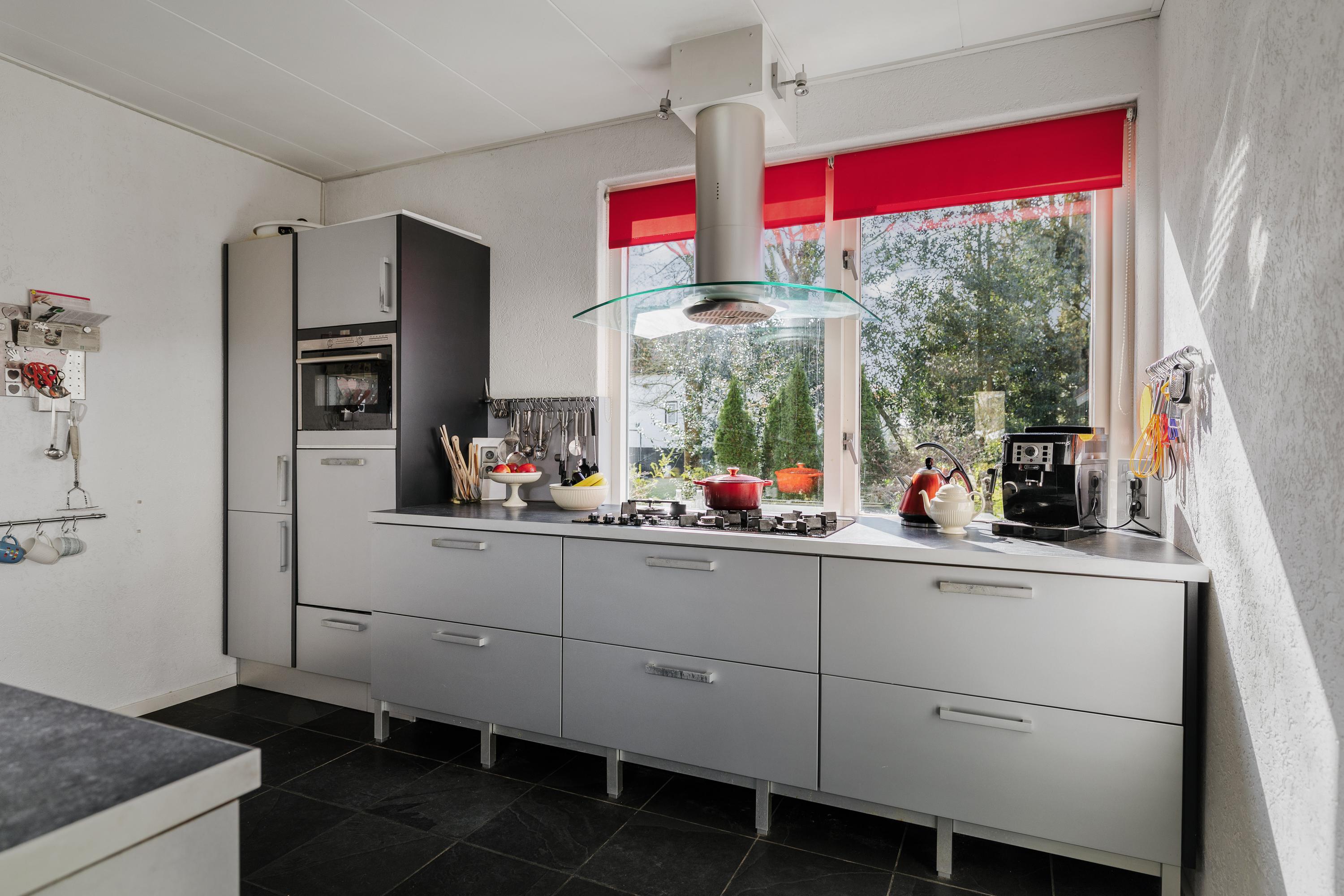 De keuken bevindt zich centraal in de woning en sluit praktisch aan op de woonruimte. Vanuit de woonkamer en keuken is er zicht op de tuin en het terras – ideaal voor lange zomeravonden of gezellige momenten met familie en vrienden.