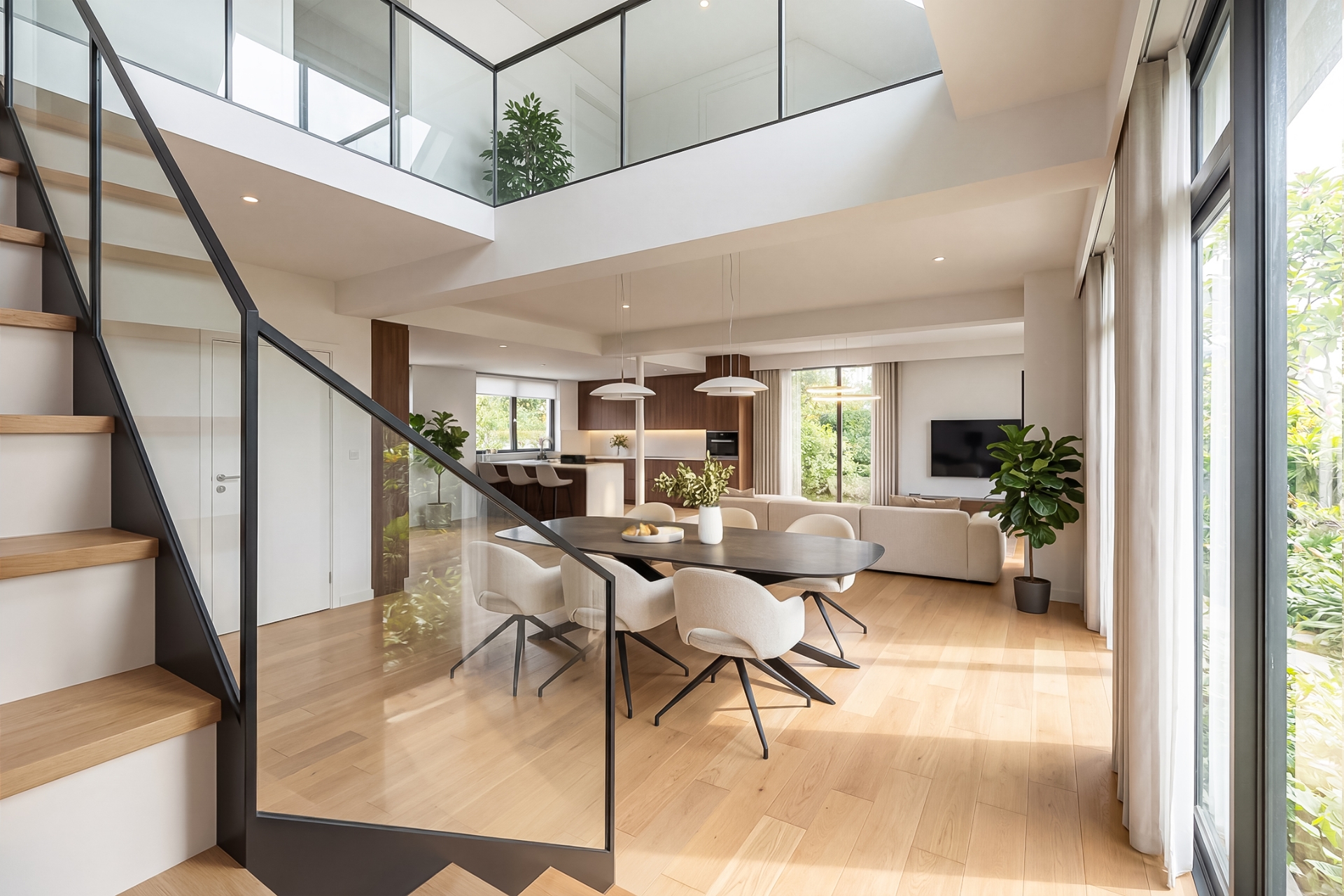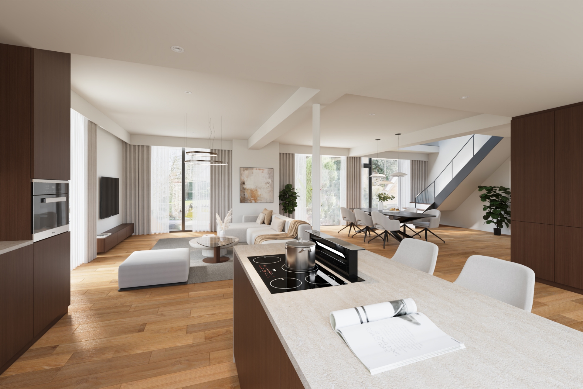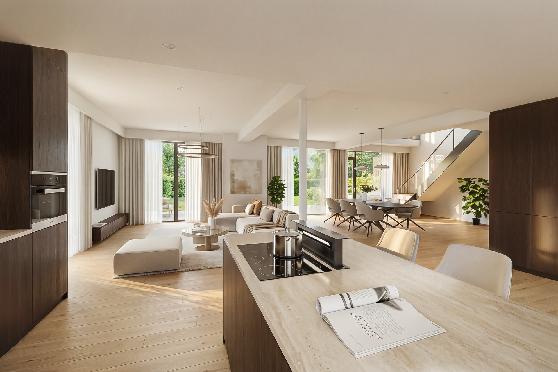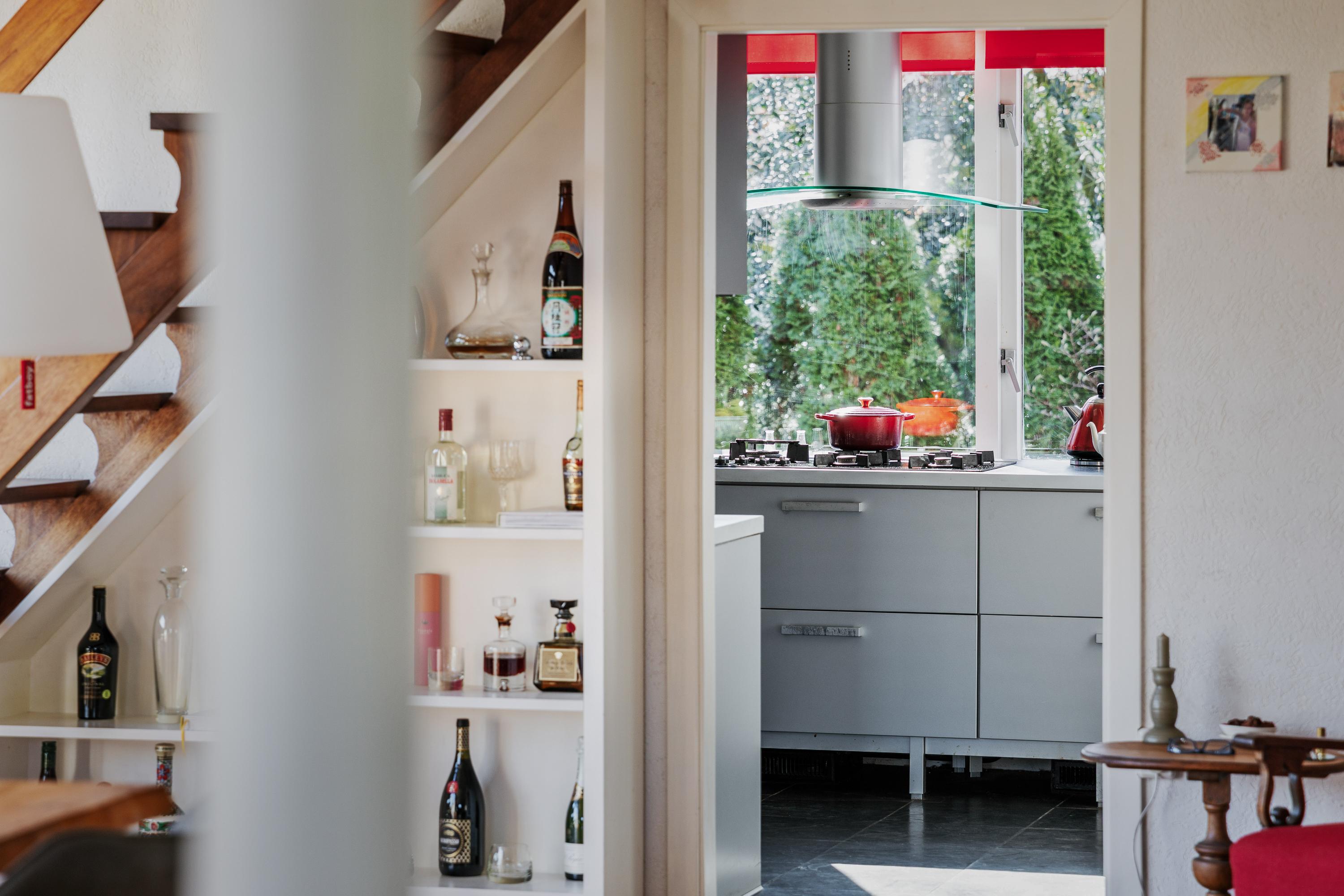 De keuken bevindt zich centraal in de woning en sluit praktisch aan op de woonruimte. Vanuit de woonkamer en keuken is er zicht op de tuin en het terras – ideaal voor lange zomeravonden of gezellige momenten met familie en vrienden.