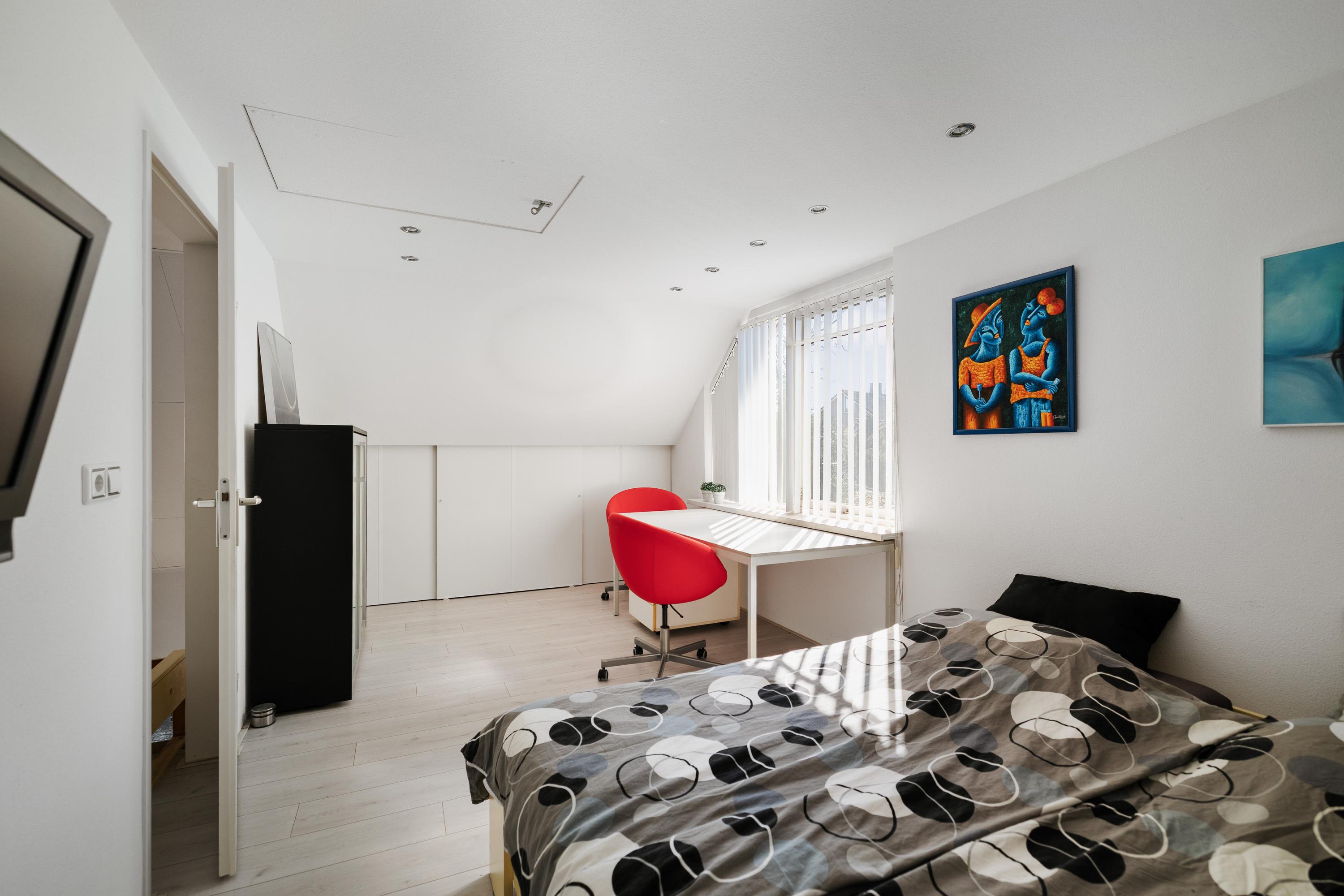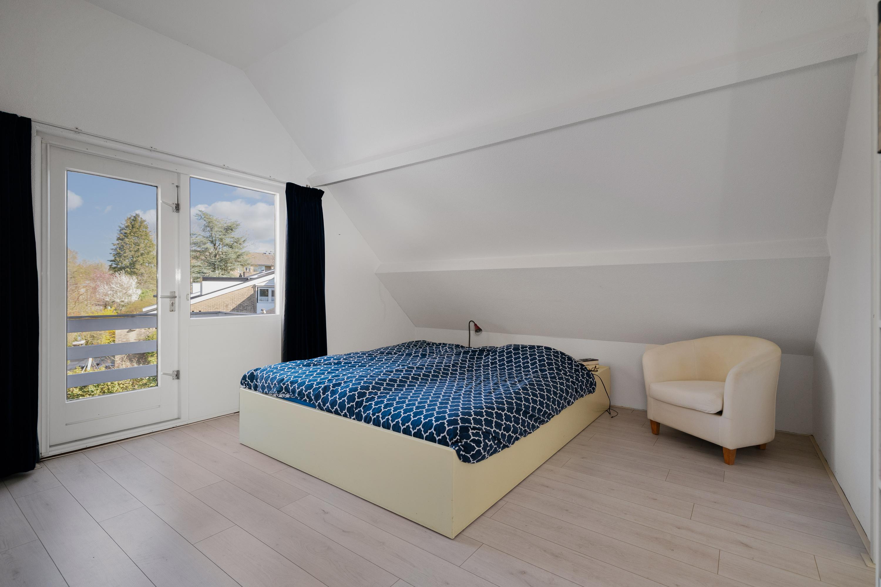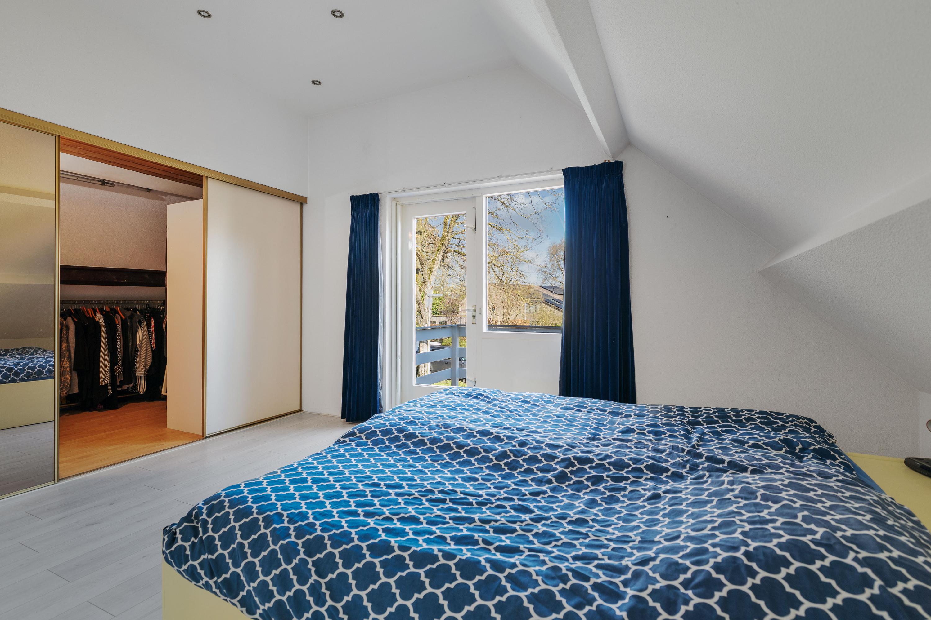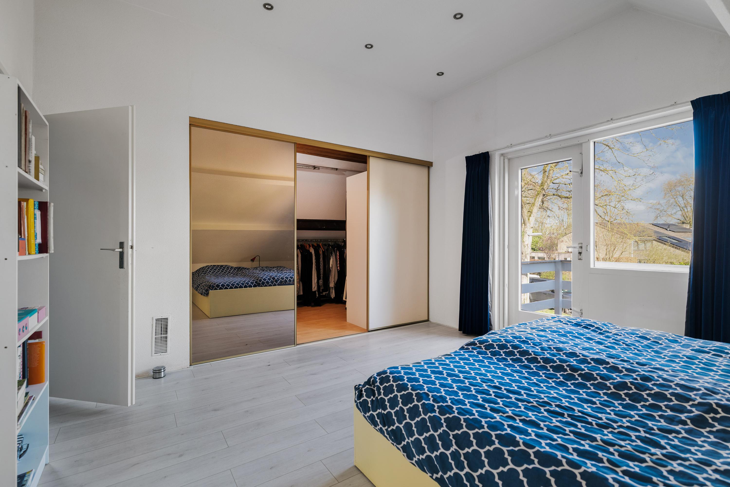 De woning beschikt daarnaast over meerdere slaapkamers, waaronder een royale hoofdslaapkamer met een inloopkast en toegang tot een balkon. De badkamer is centraal op de verdieping gelegen.