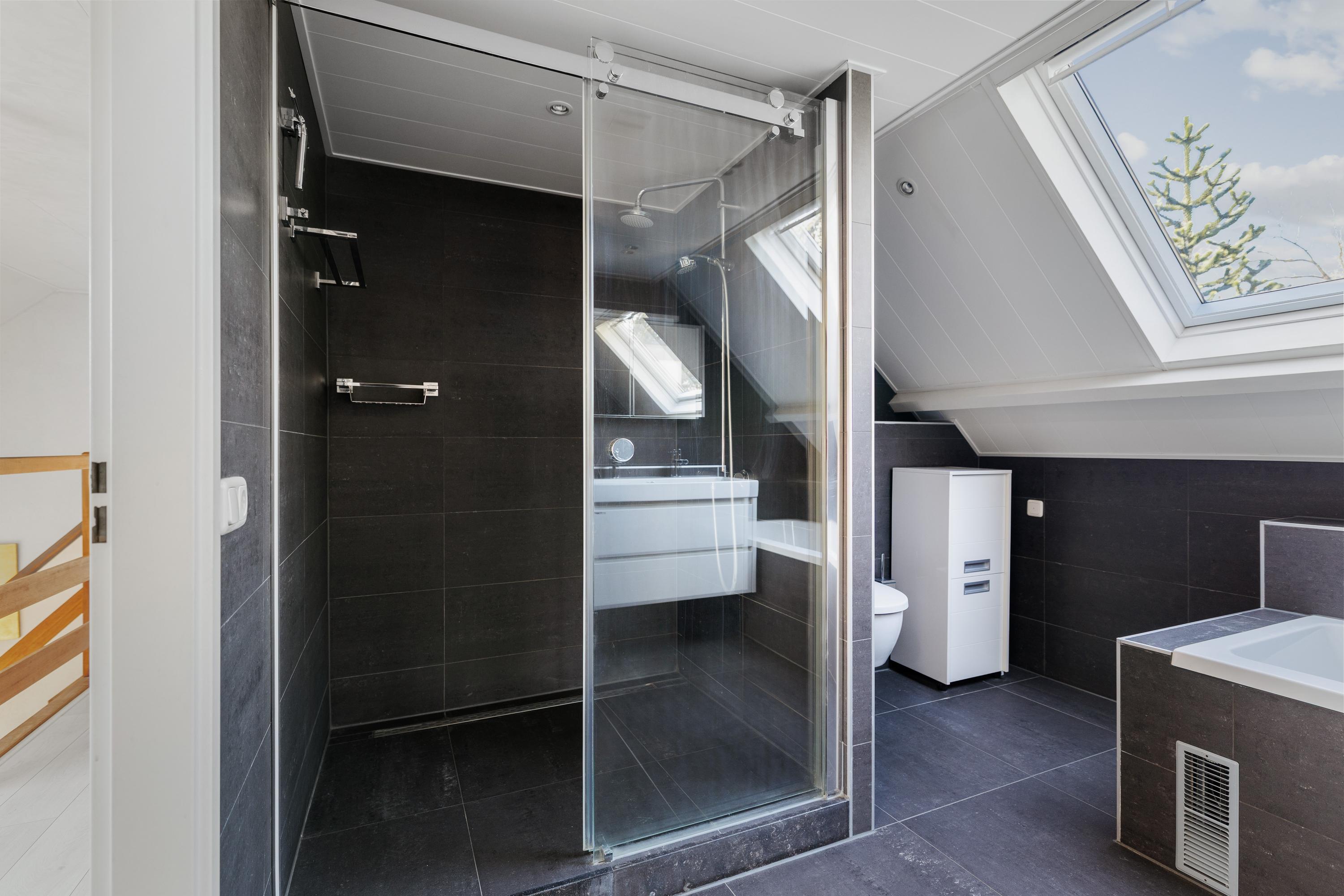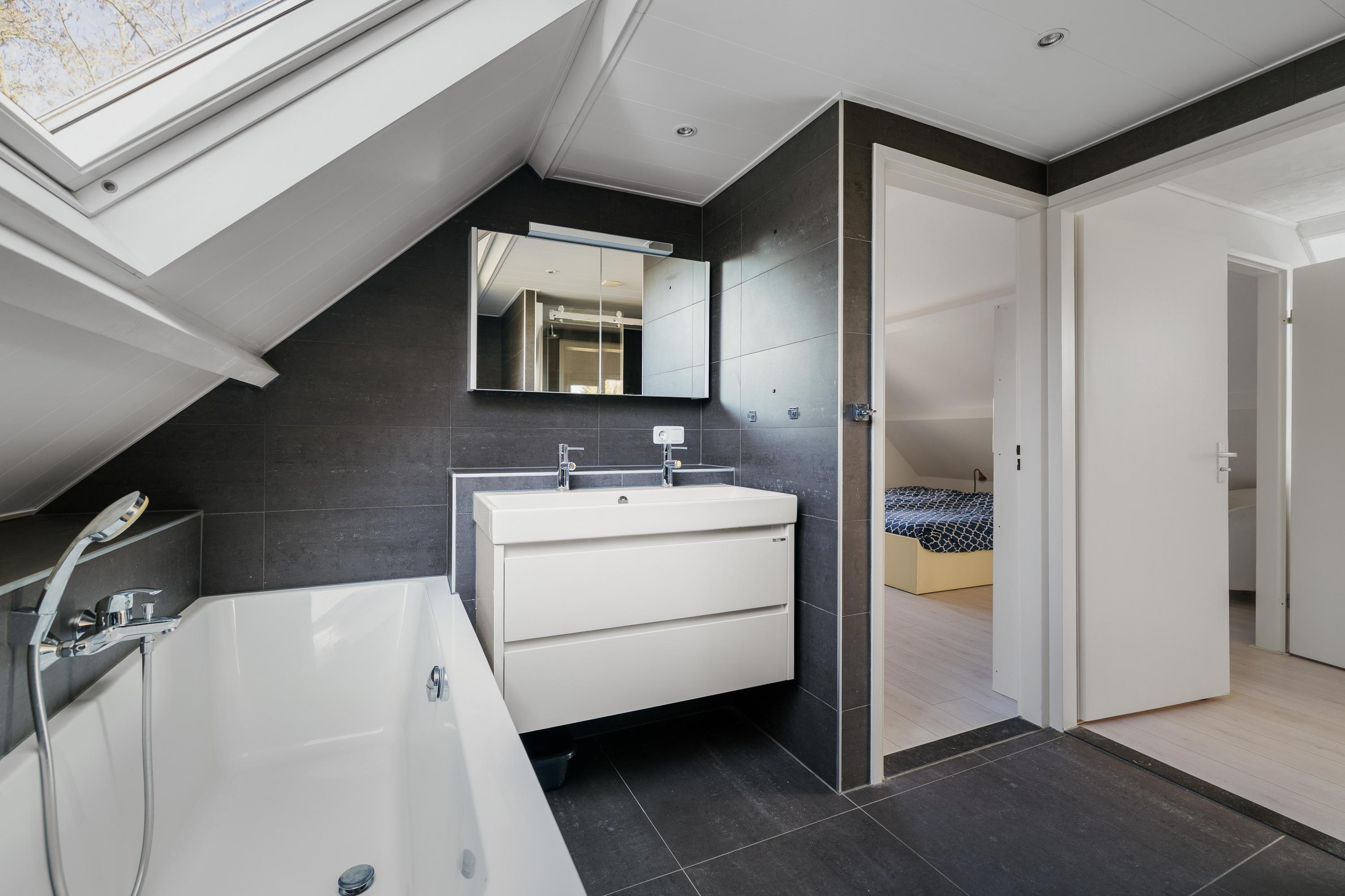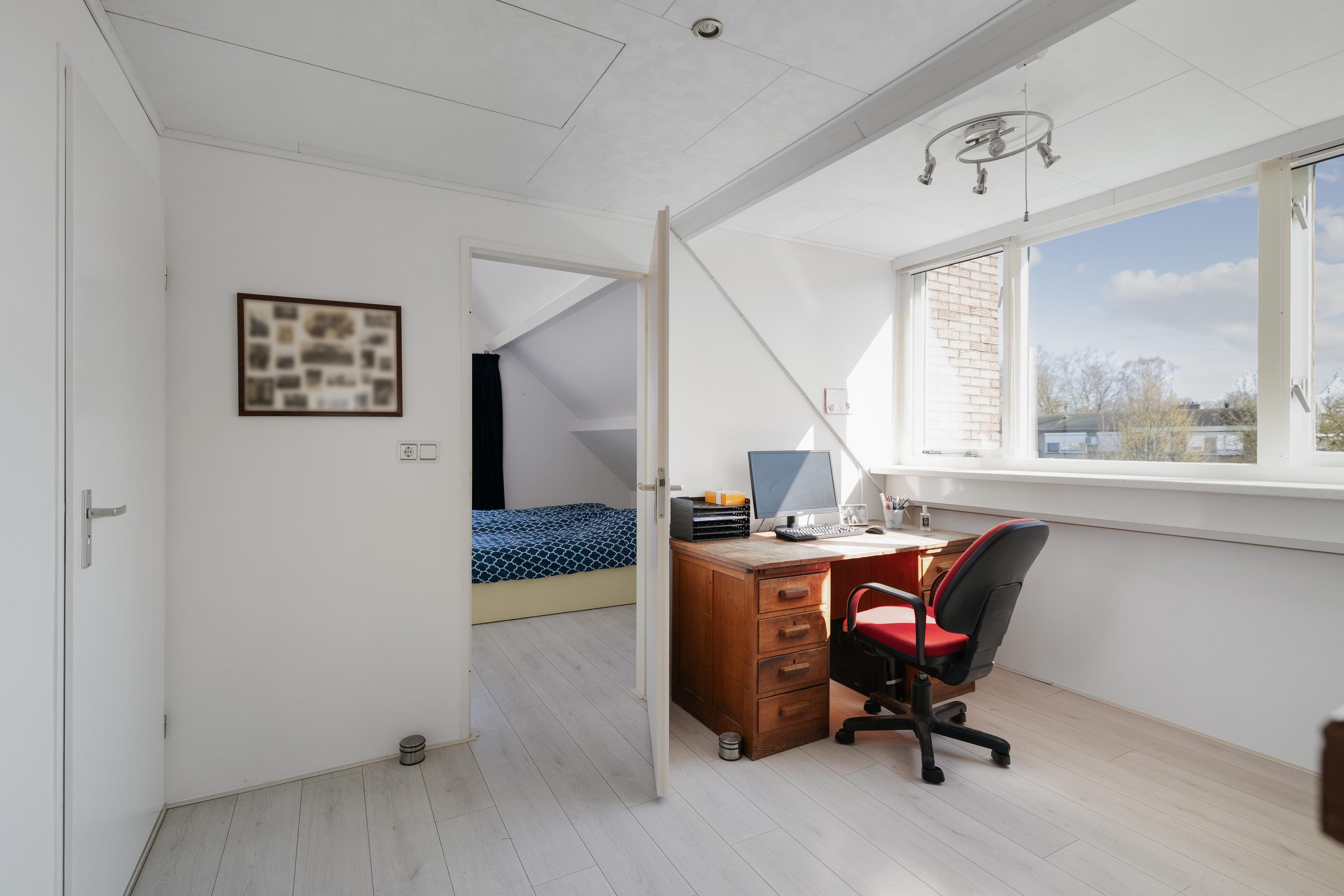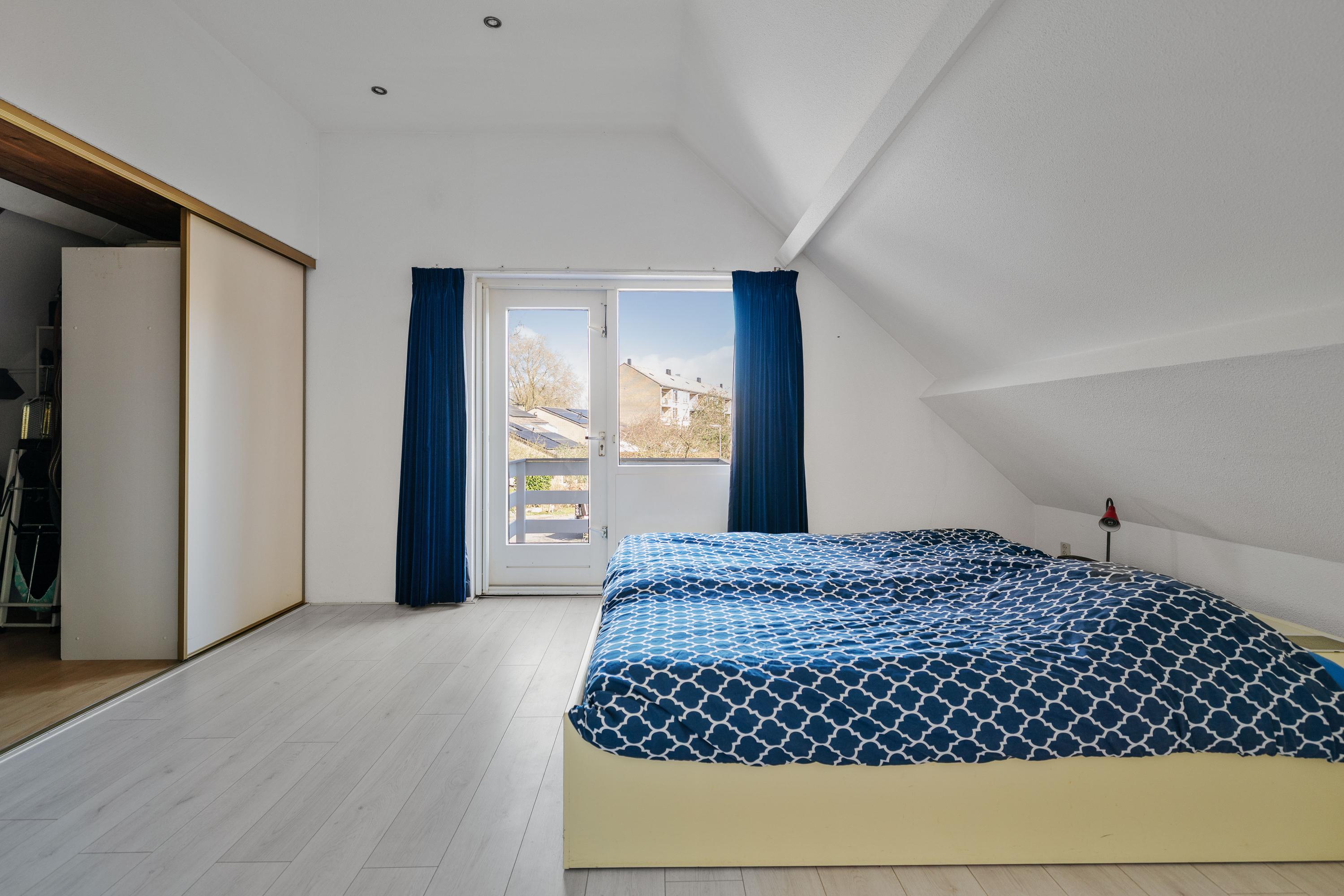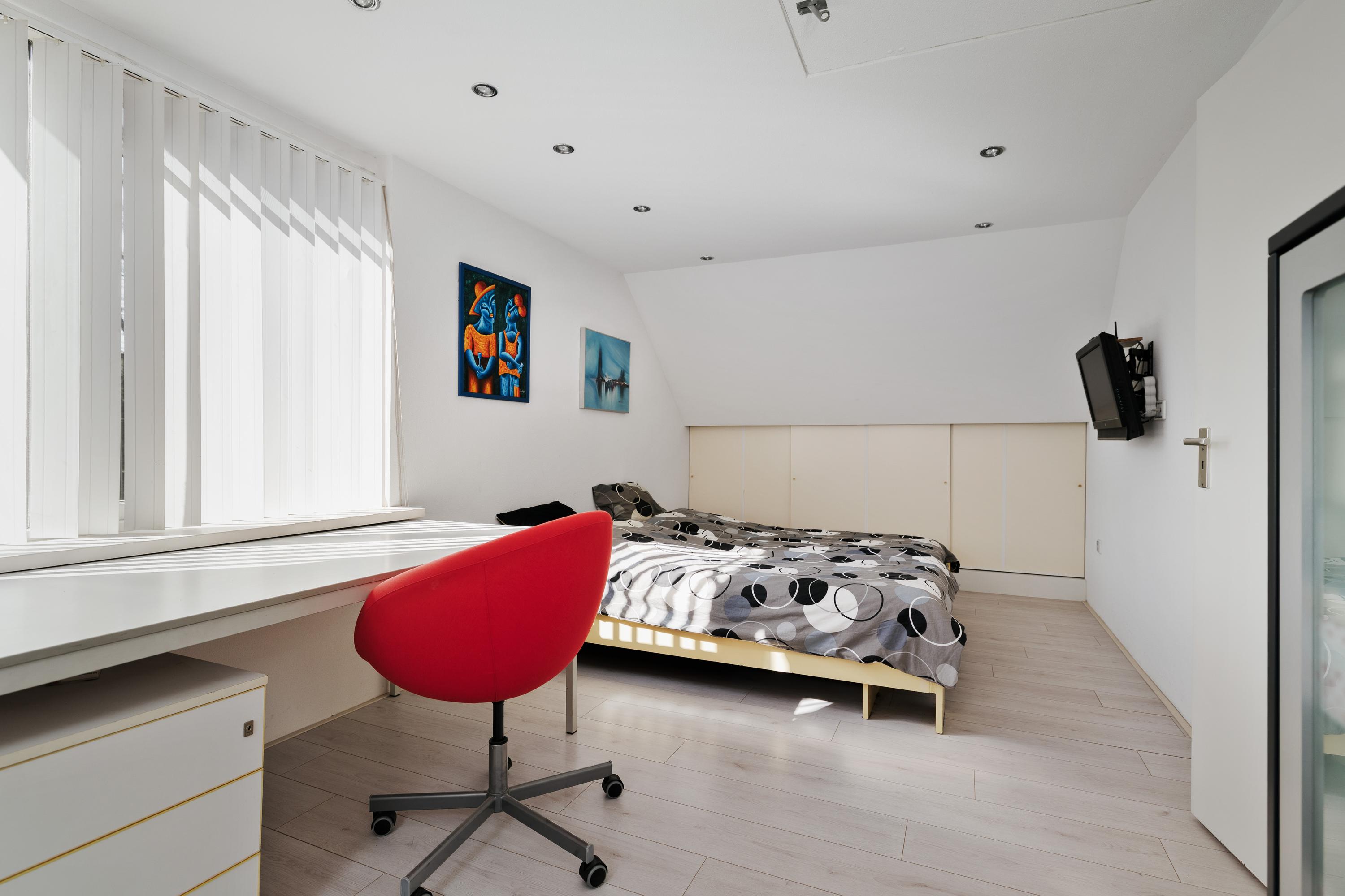 De woning beschikt daarnaast over meerdere slaapkamers, waaronder een royale hoofdslaapkamer met een inloopkast en toegang tot een balkon. De badkamer is centraal op de verdieping gelegen.
