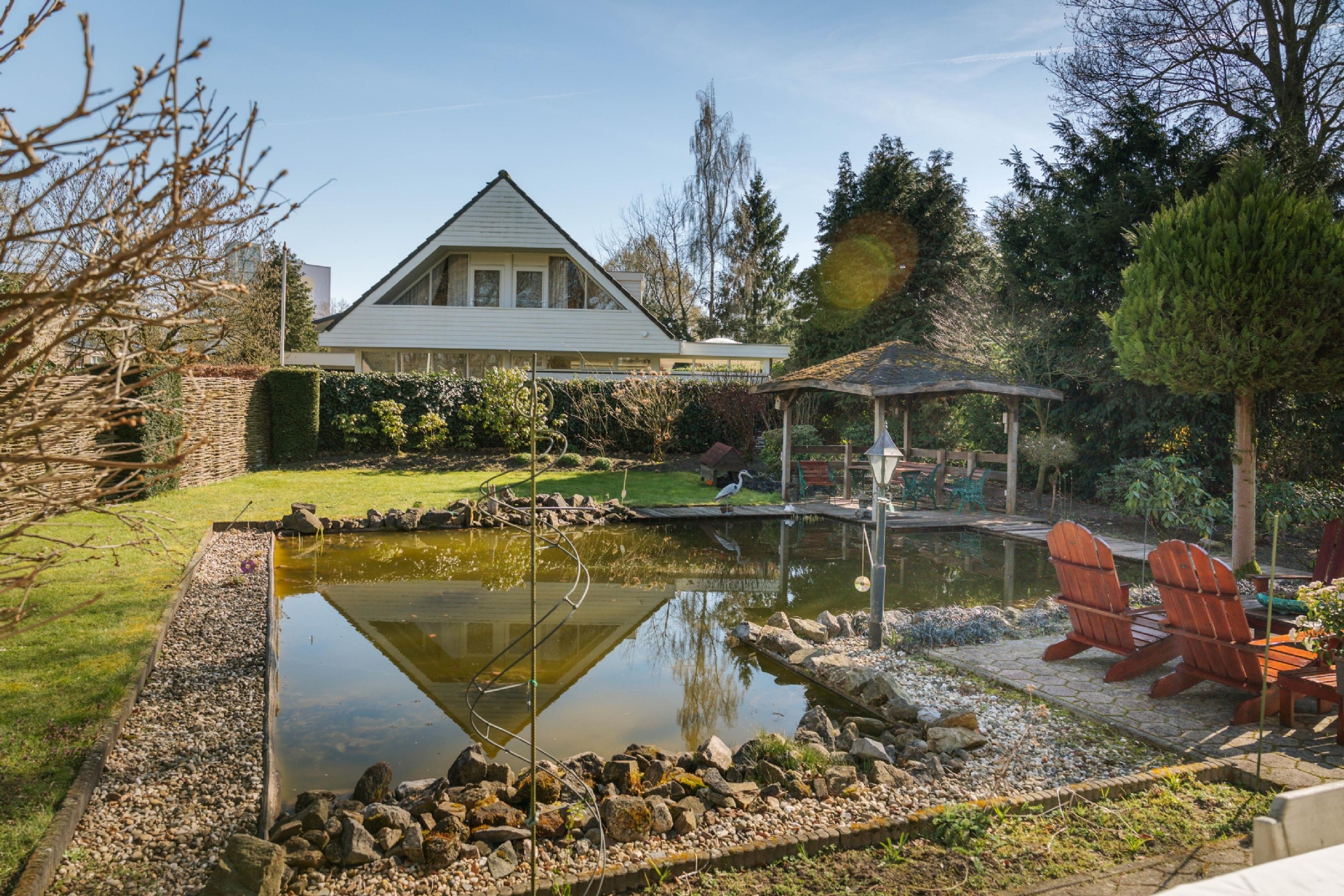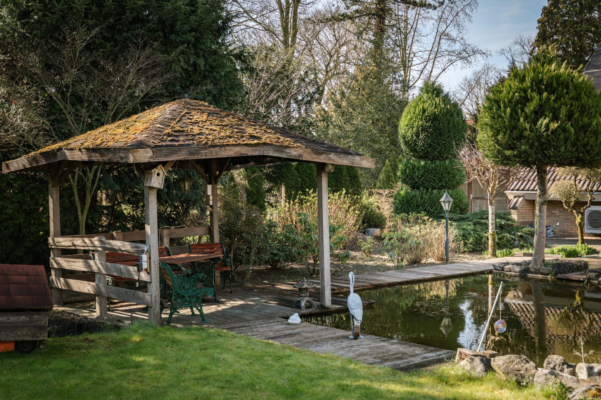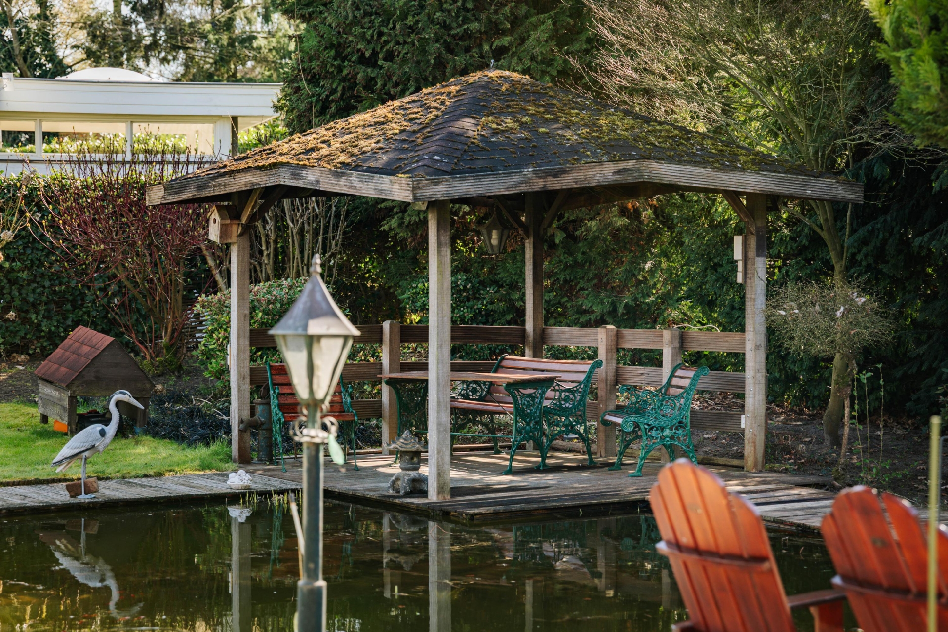 De tuin biedt verschillende plekken om te ontspannen: