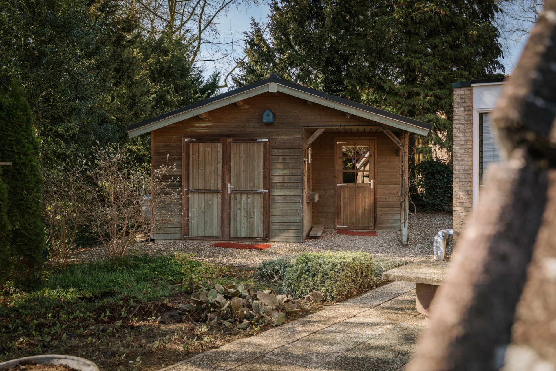 een ruim terras, een houten tuinhuis, een groen gazon en volwassen beplanting