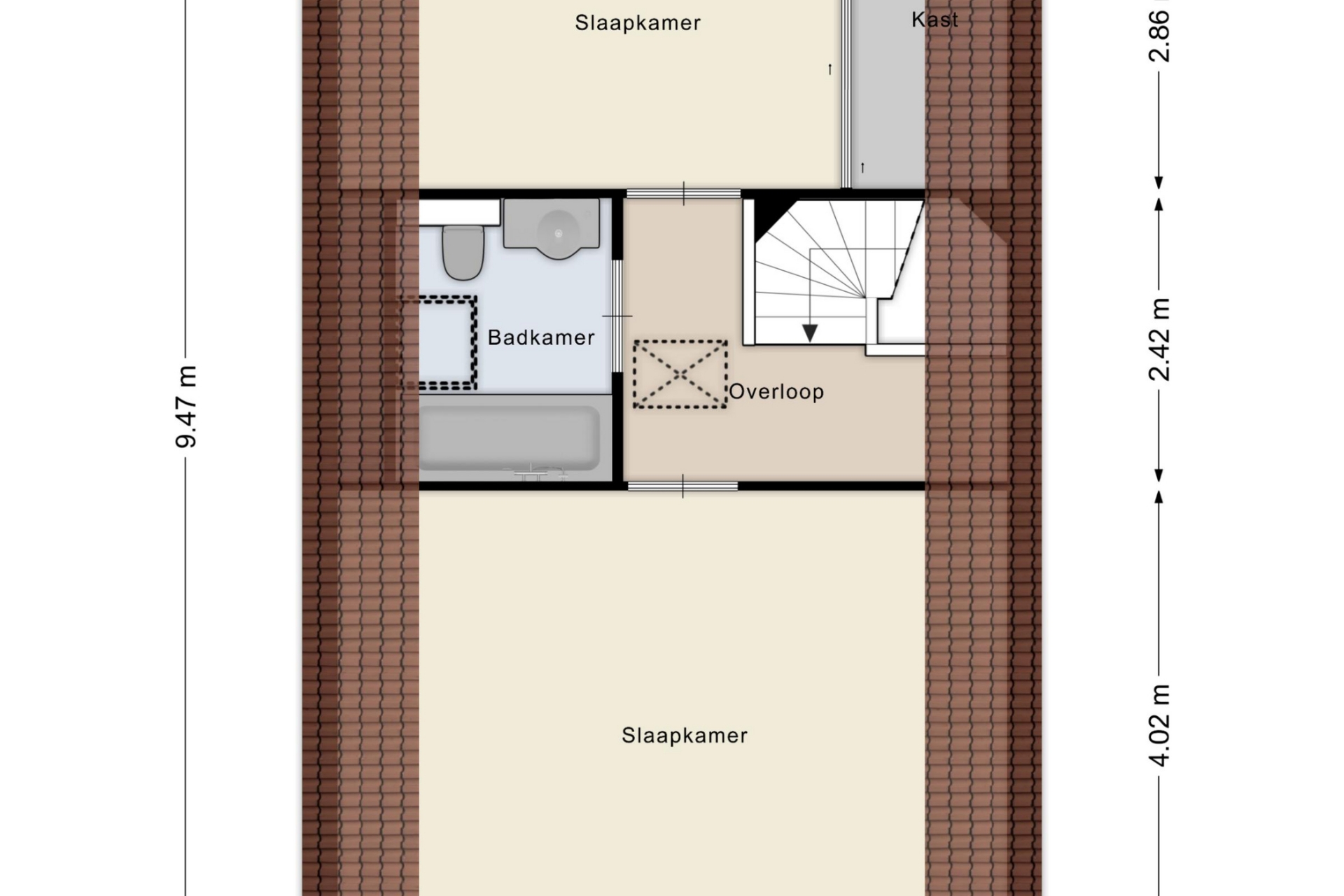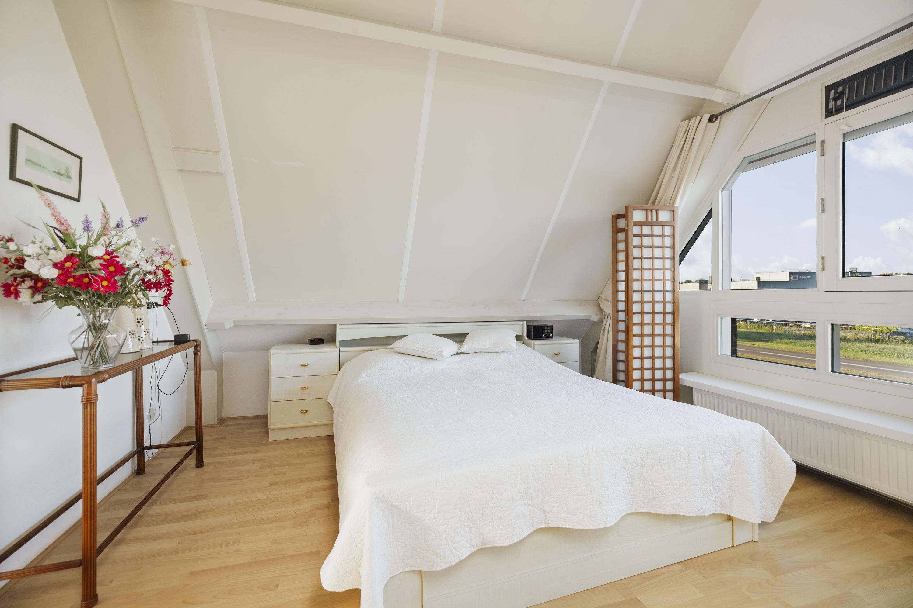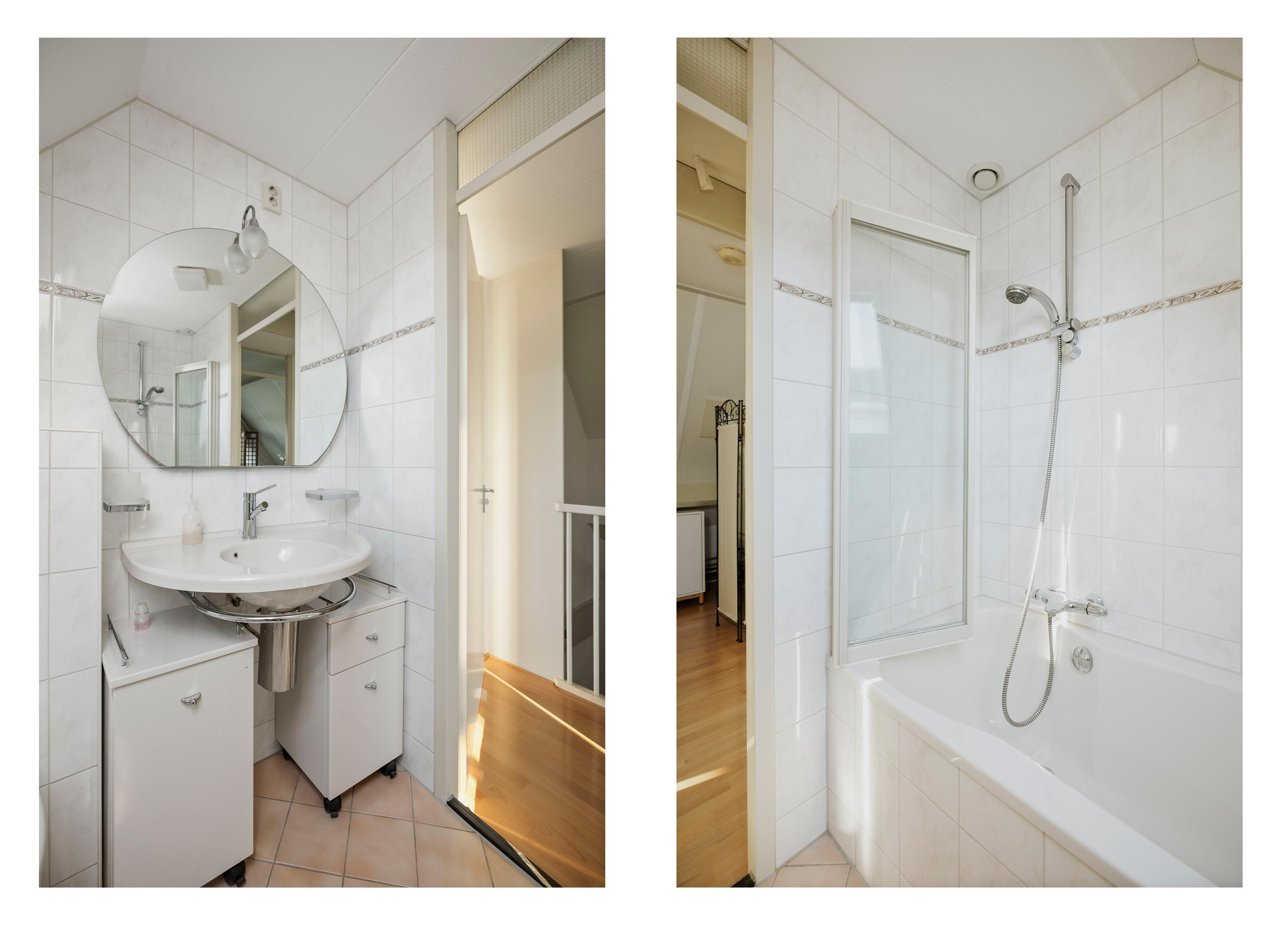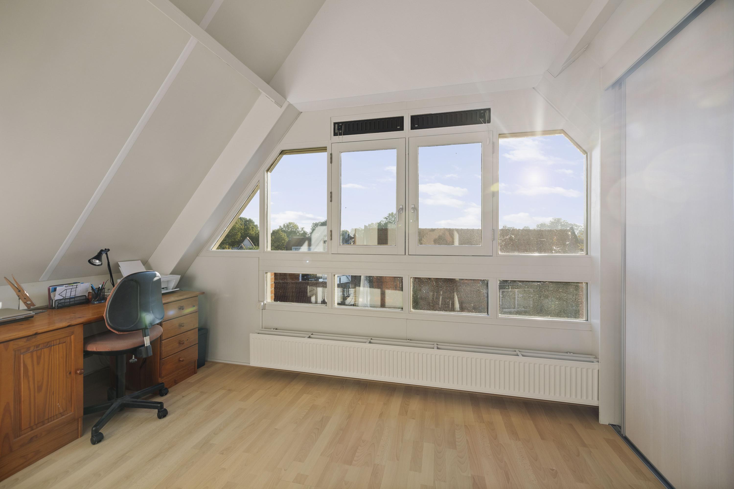 Op de overloop bevindt zich de badkamer met Velux dakraam, toilet, wastafelmeubel en ligbad met douchefunctie. De twee slaapkamers zijn tot in de nok open, wat een prachtig ruimtelijk gevoel geeft. Dankzij de vele raampartijen is er overal licht en zicht.
