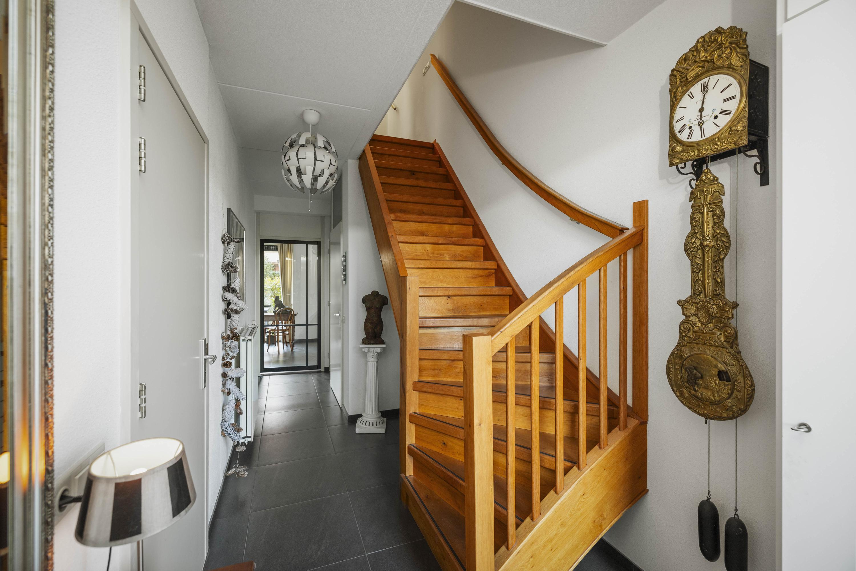 Via de entree kom je in de hal met trapopgang, toilet met fonteintje en een aparte wasruimte. De voormalige garage is omgetoverd tot een ruime slaap- of hobbykamer, voorzien van een geïsoleerde gietvloer, vaste kasten. Naast de vernieuwde geïsoleerde garagedeuren is er voor extra daglichttoetreding gezorgd.
