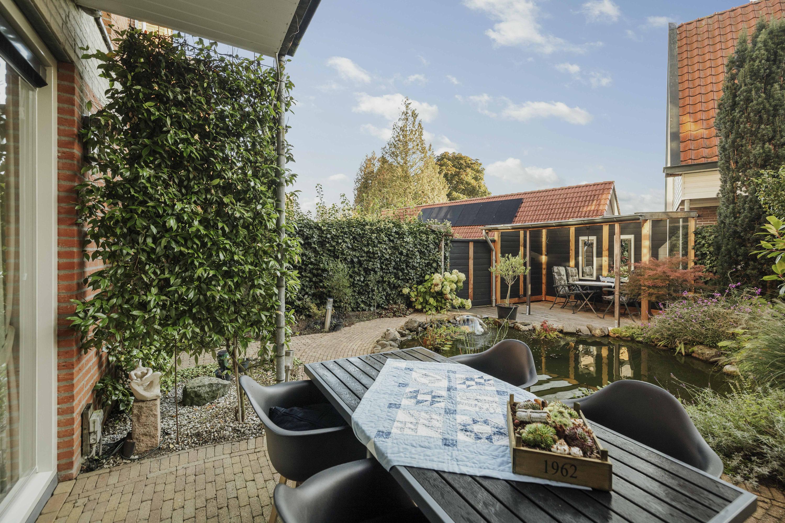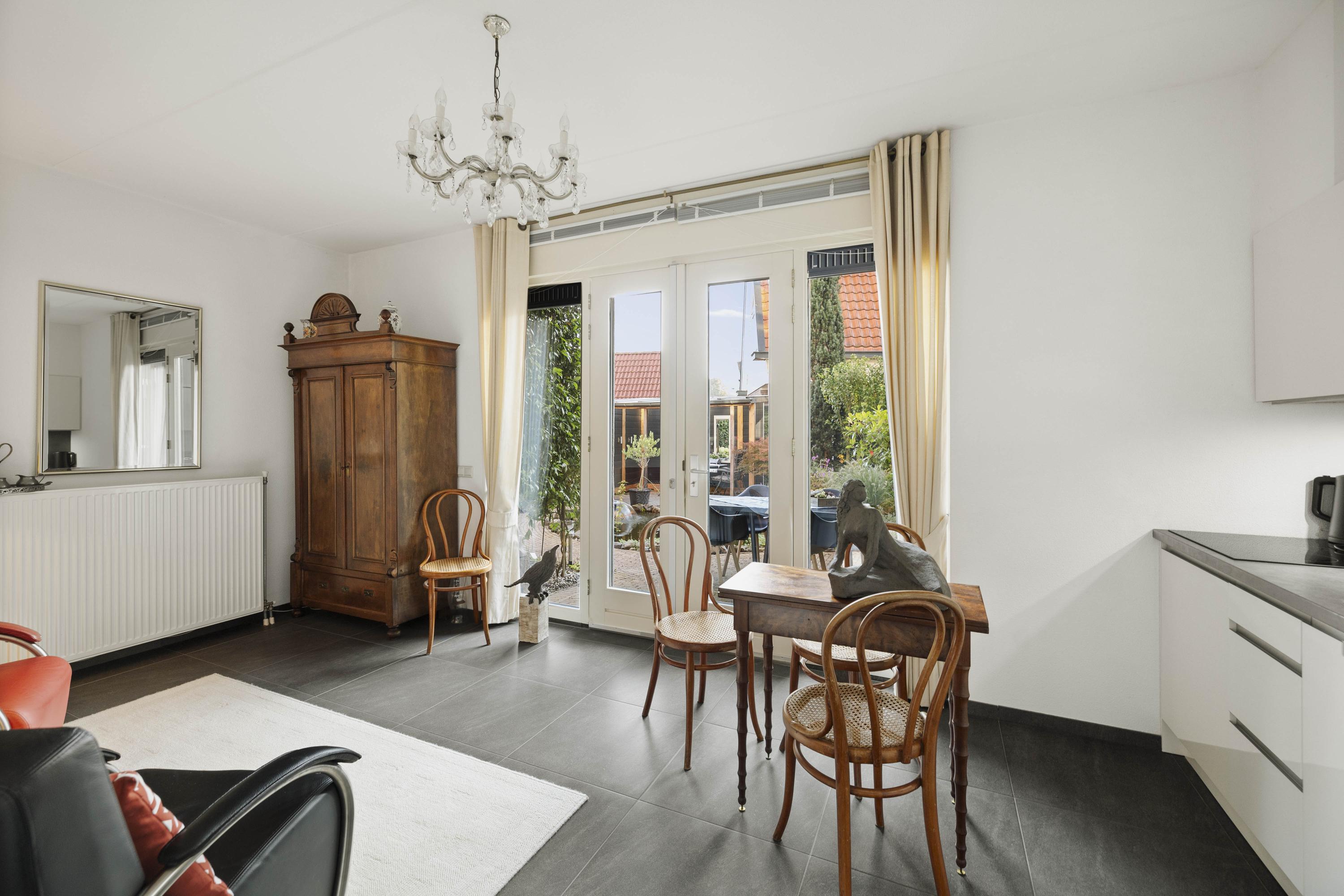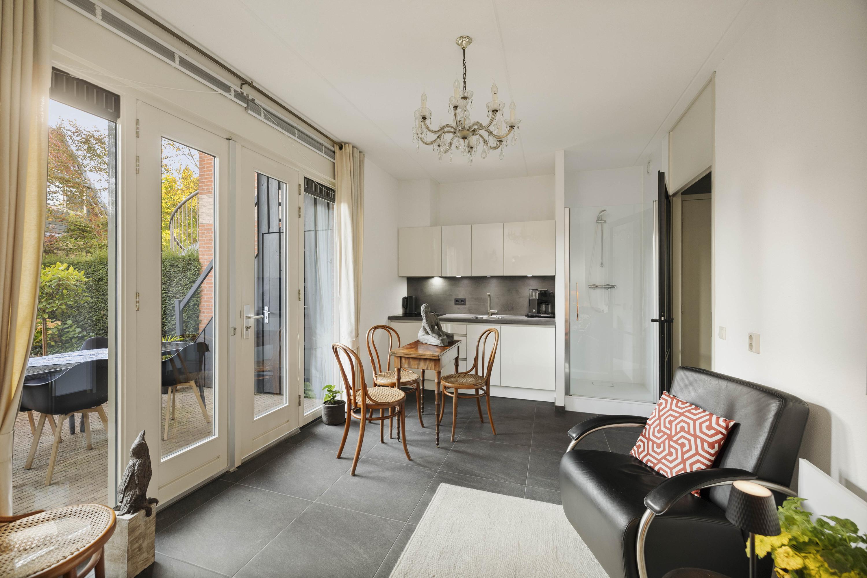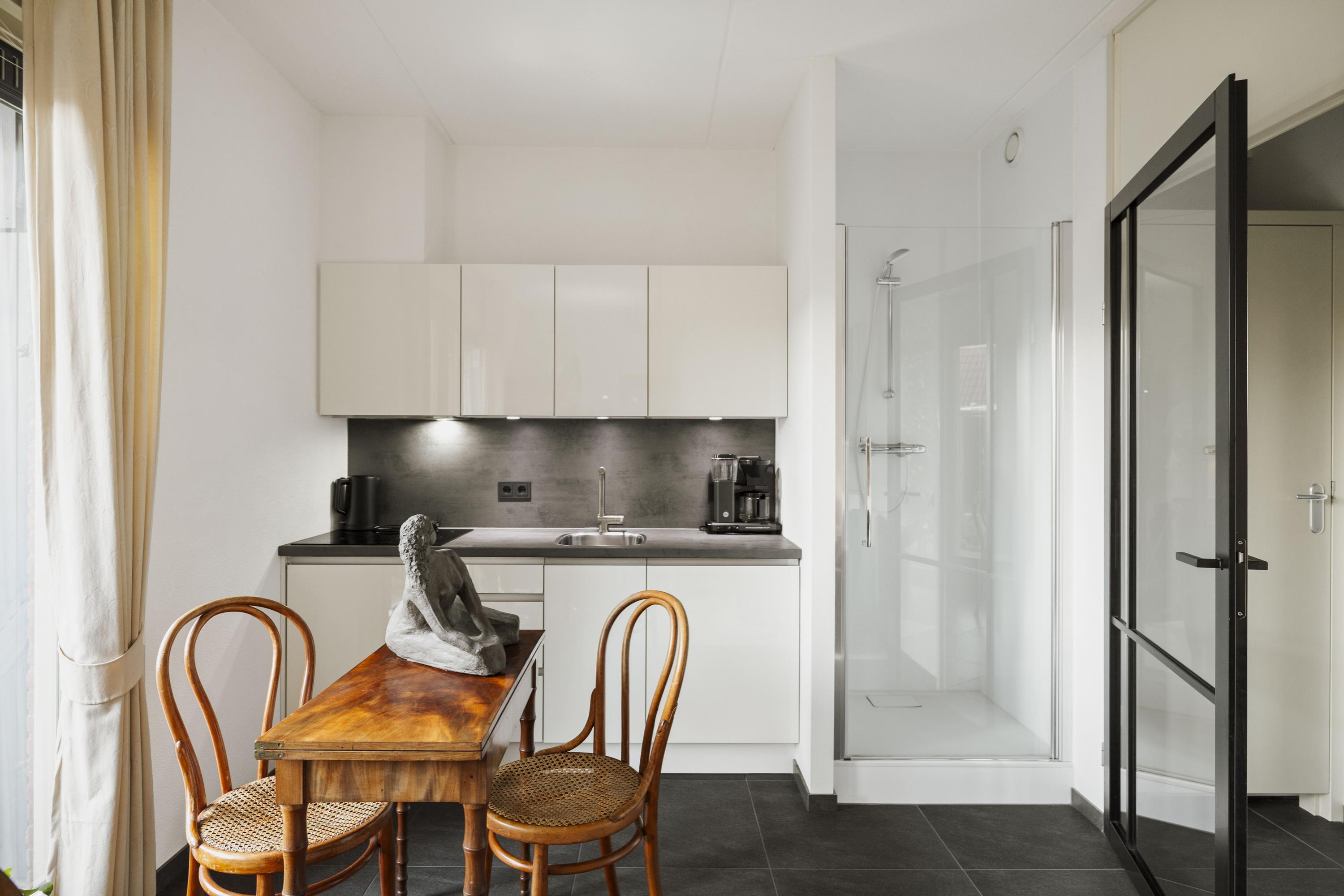 Daarnaast bevindt zich een tuinkamer met keukenblok, voorzien van inductiekookplaat, vaatwasser en koelkast — ideaal als gastenverblijf, werkruimte of zelfstandige studio. Aangrenzend is een douchegelegenheid. Via de dubbele tuindeuren bereik je de fraai aangelegde tuin met overkapping en volop privacy.
