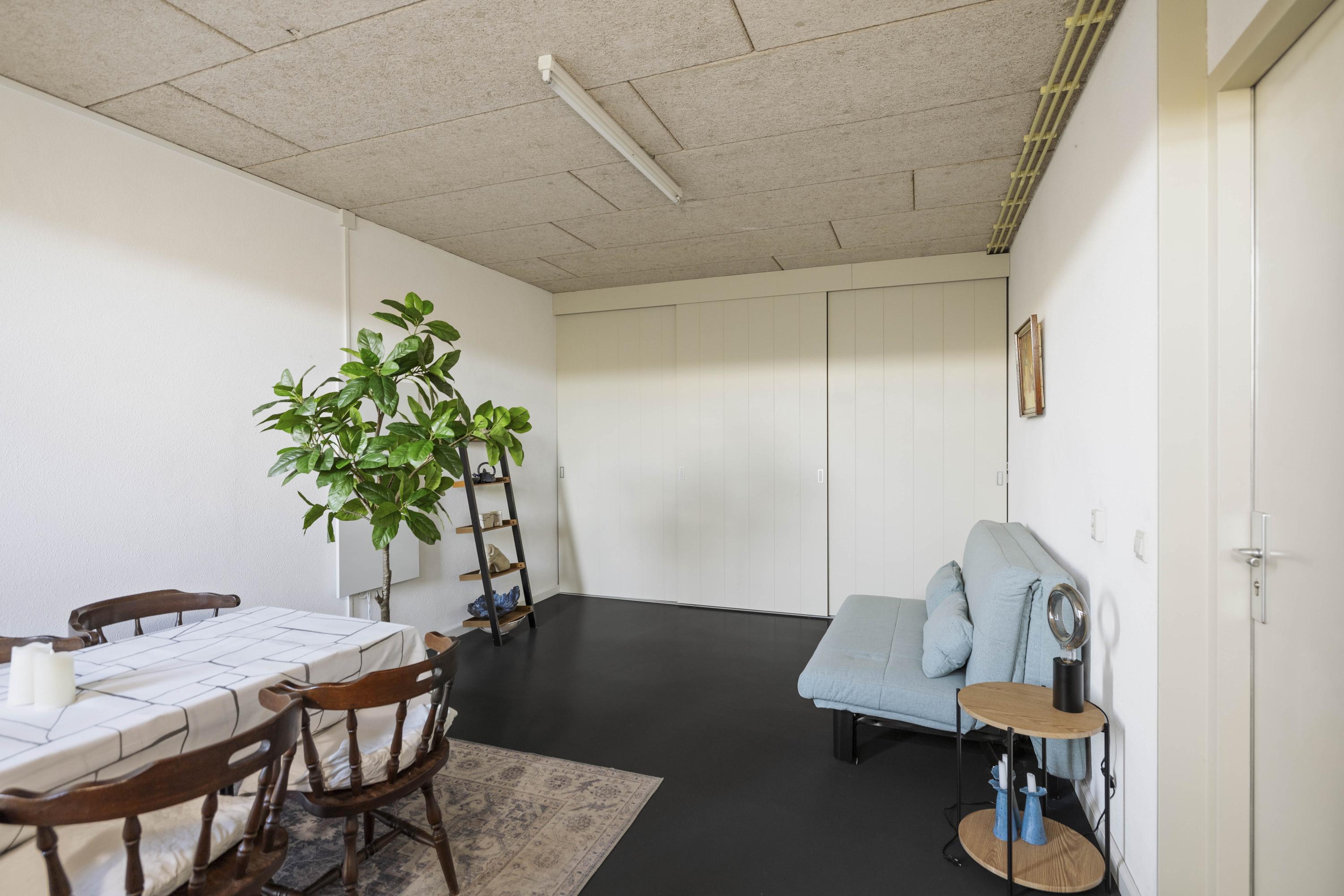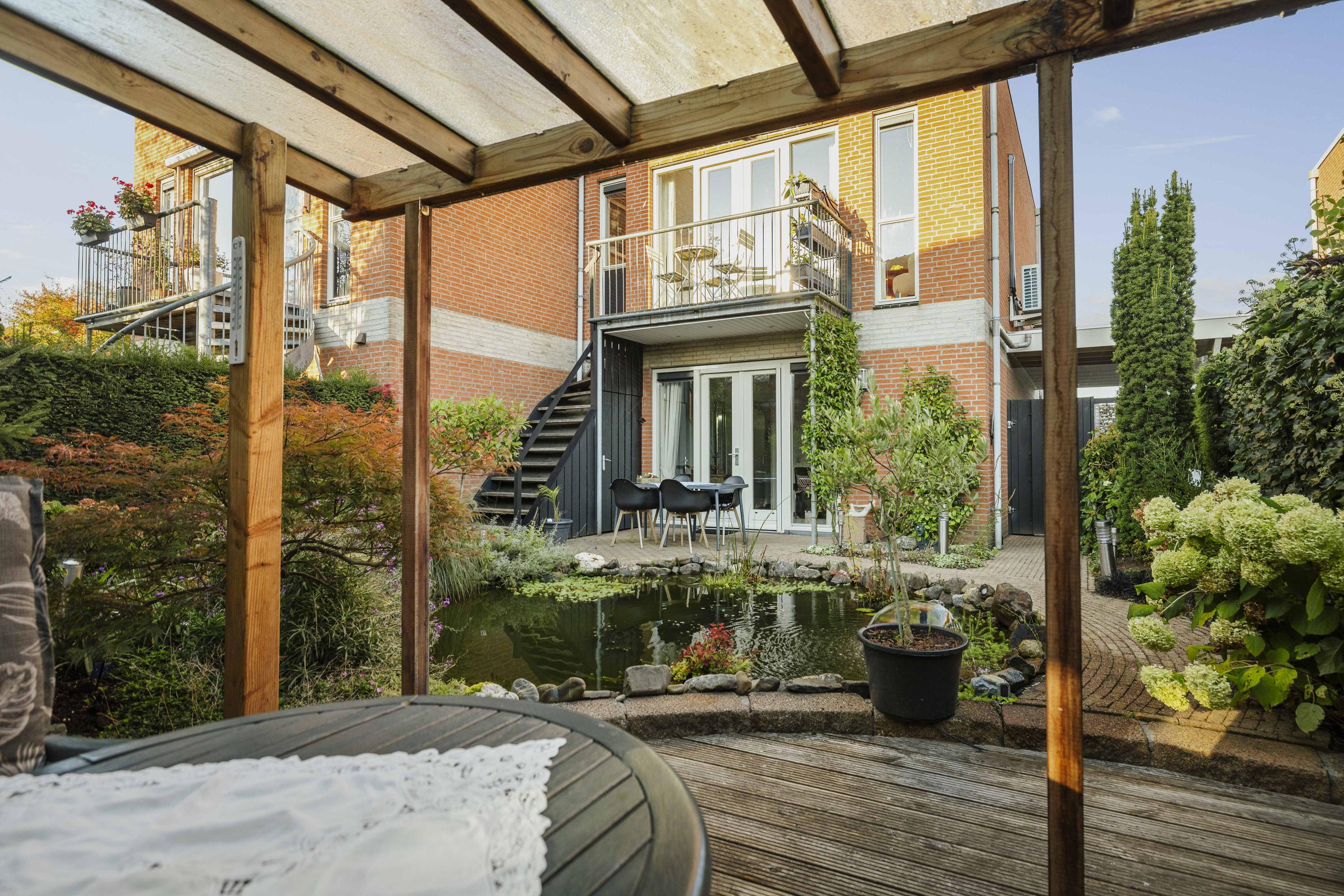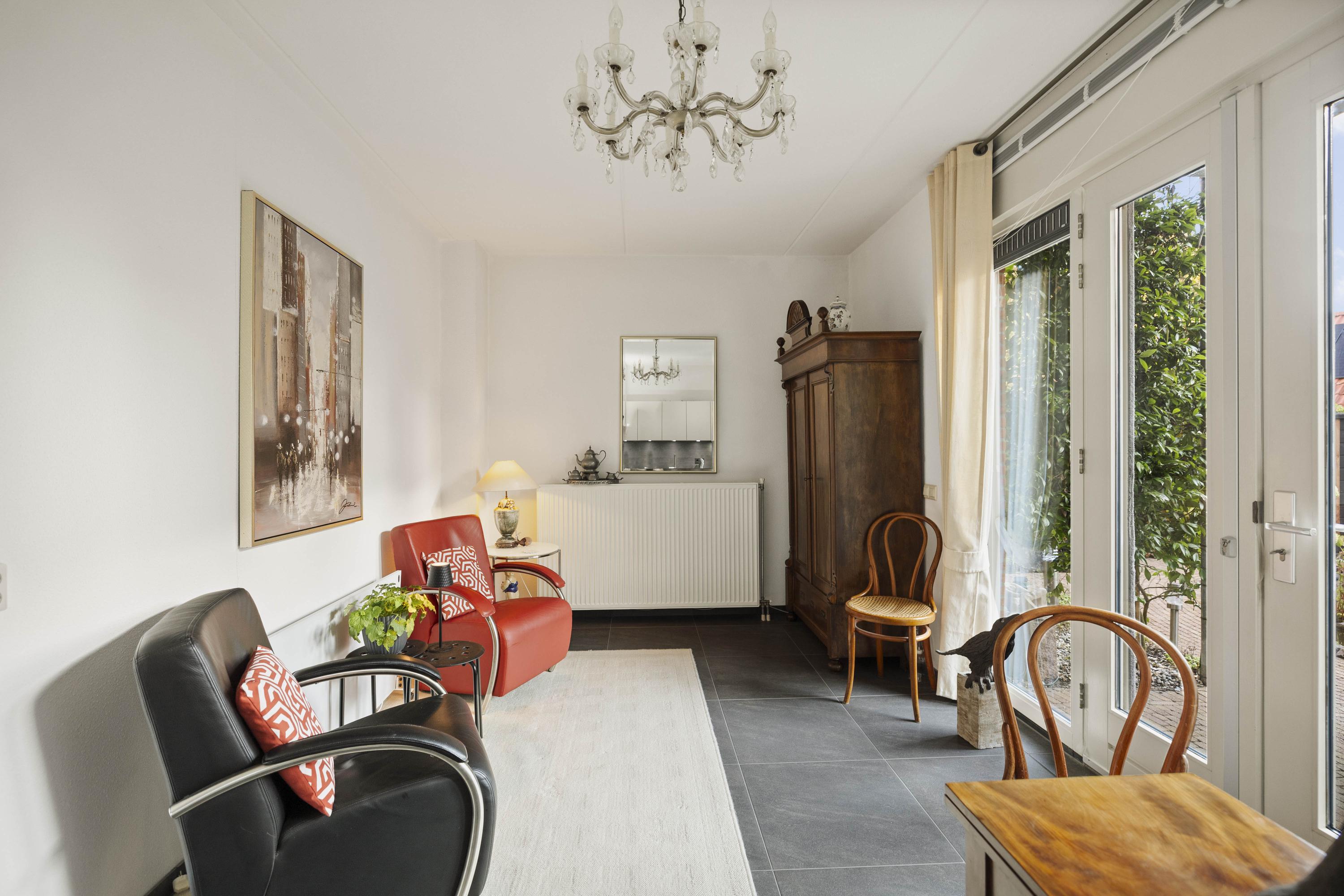 Daarnaast bevindt zich een tuinkamer met keukenblok, voorzien van inductiekookplaat, vaatwasser en koelkast — ideaal als gastenverblijf, werkruimte of zelfstandige studio. Aangrenzend is een douchegelegenheid. Via de dubbele tuindeuren bereik je de fraai aangelegde tuin met overkapping en volop privacy.