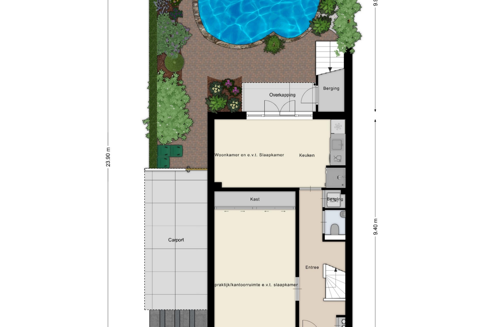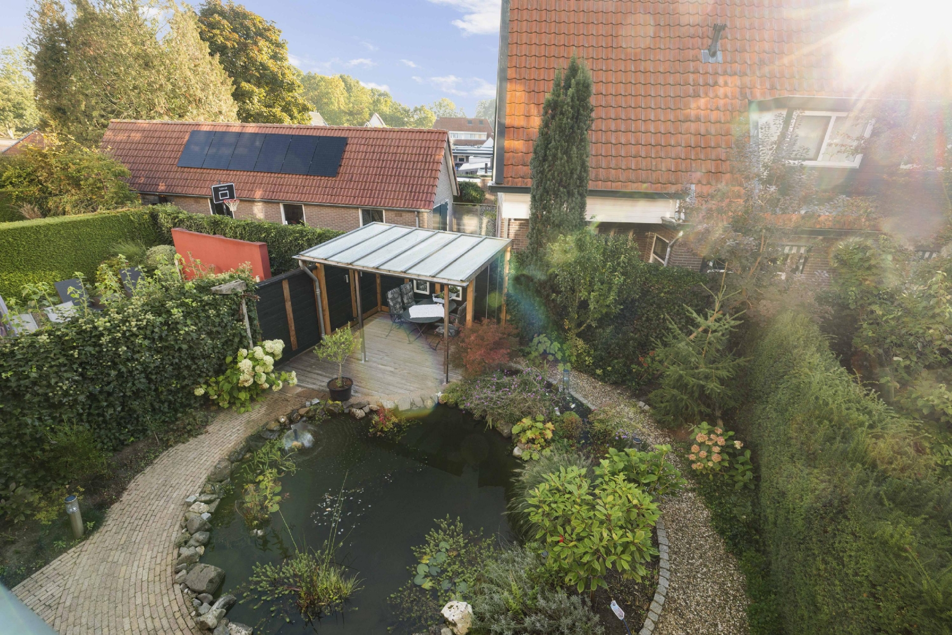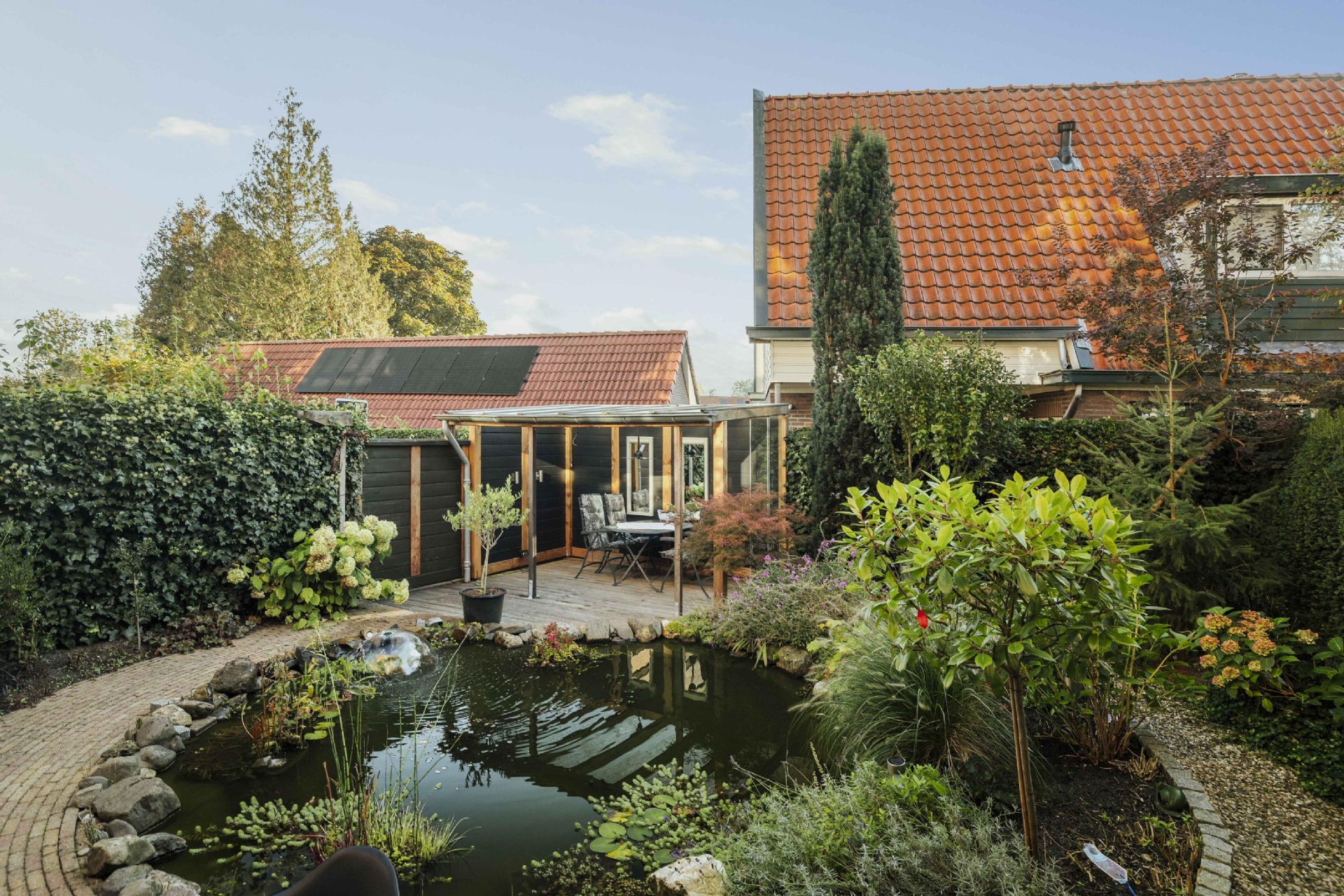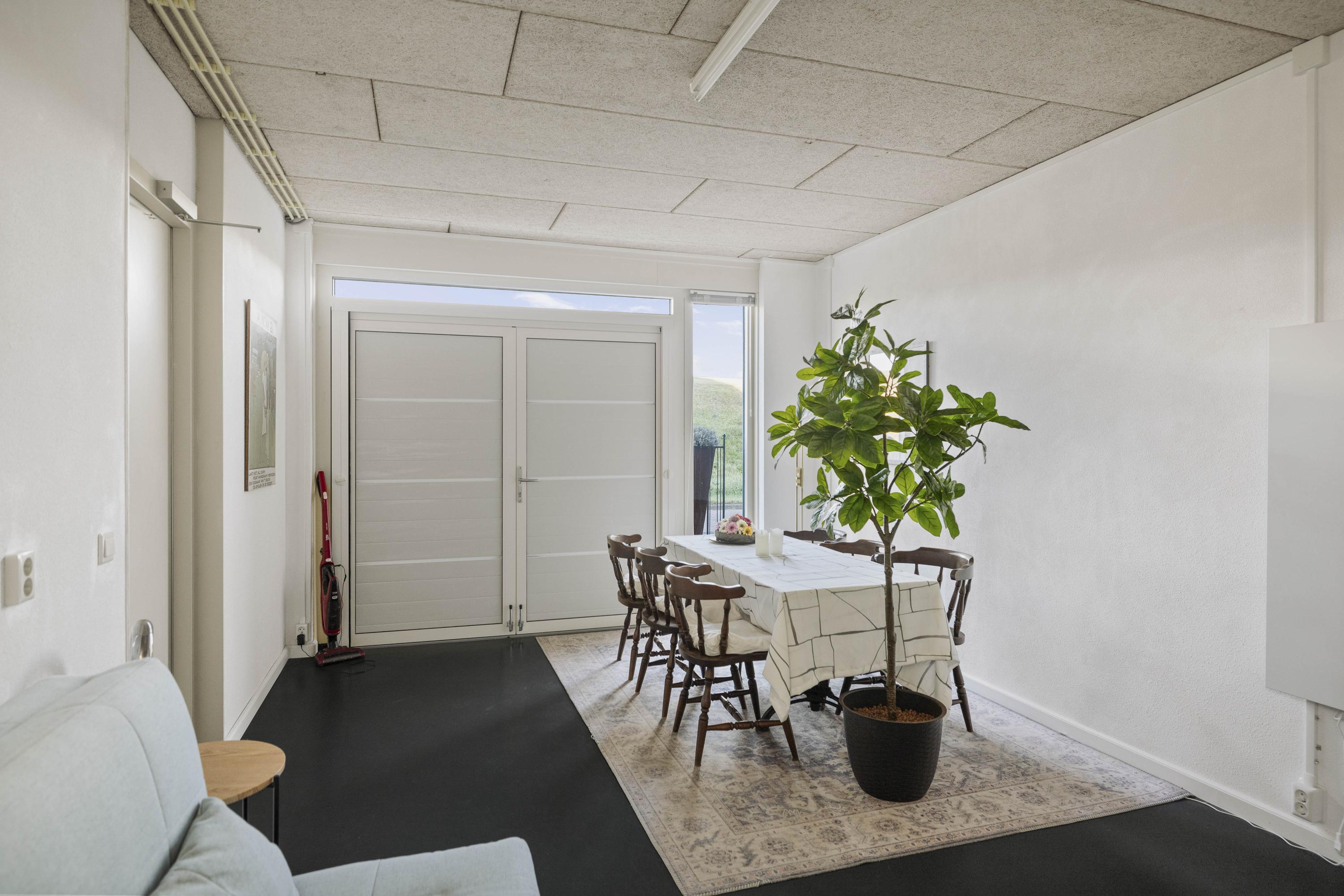 Daarnaast bevindt zich een tuinkamer met keukenblok, voorzien van inductiekookplaat, vaatwasser en koelkast — ideaal als gastenverblijf, werkruimte of zelfstandige studio. Aangrenzend is een douchegelegenheid. Via de dubbele tuindeuren bereik je de fraai aangelegde tuin met overkapping en volop privacy.