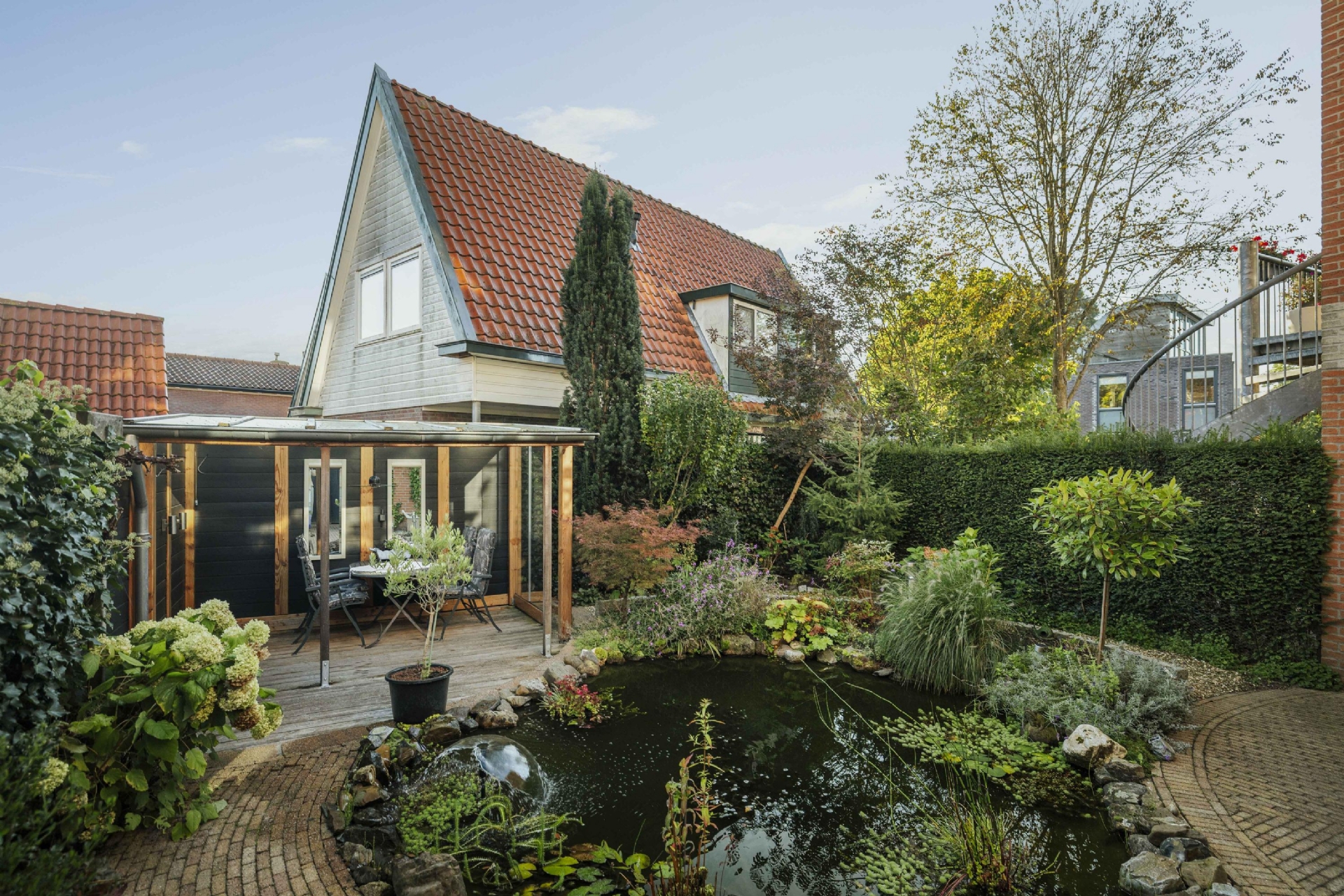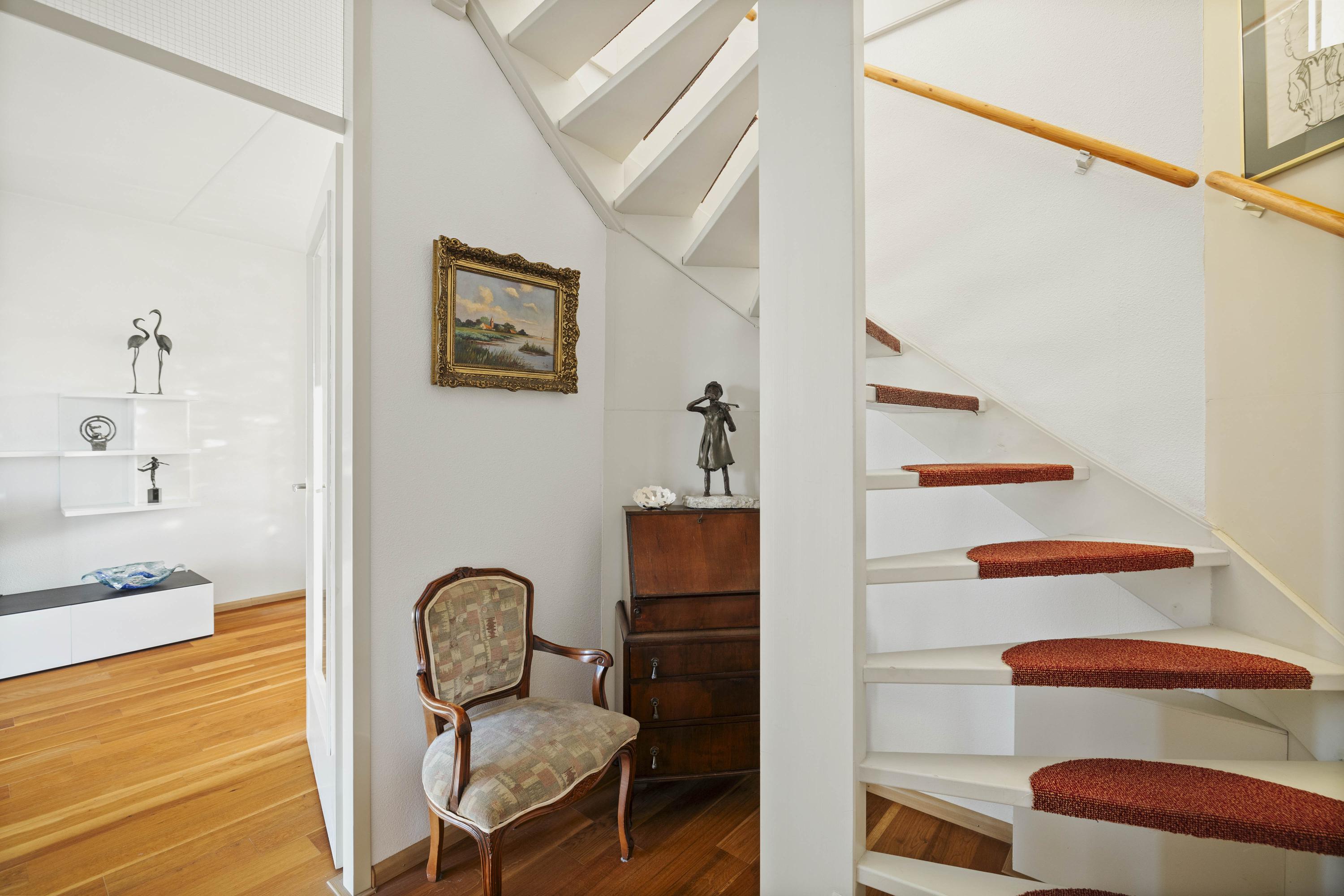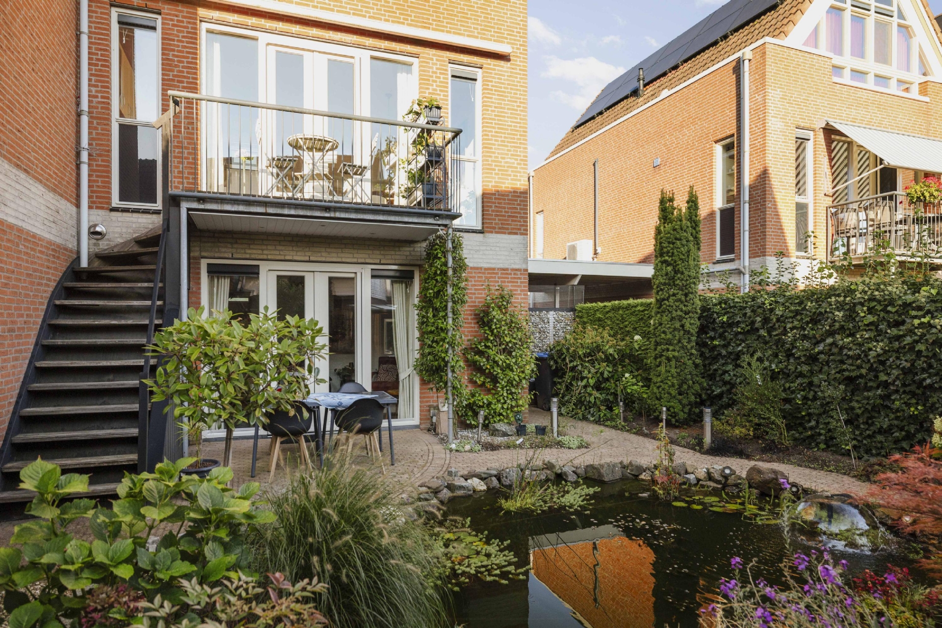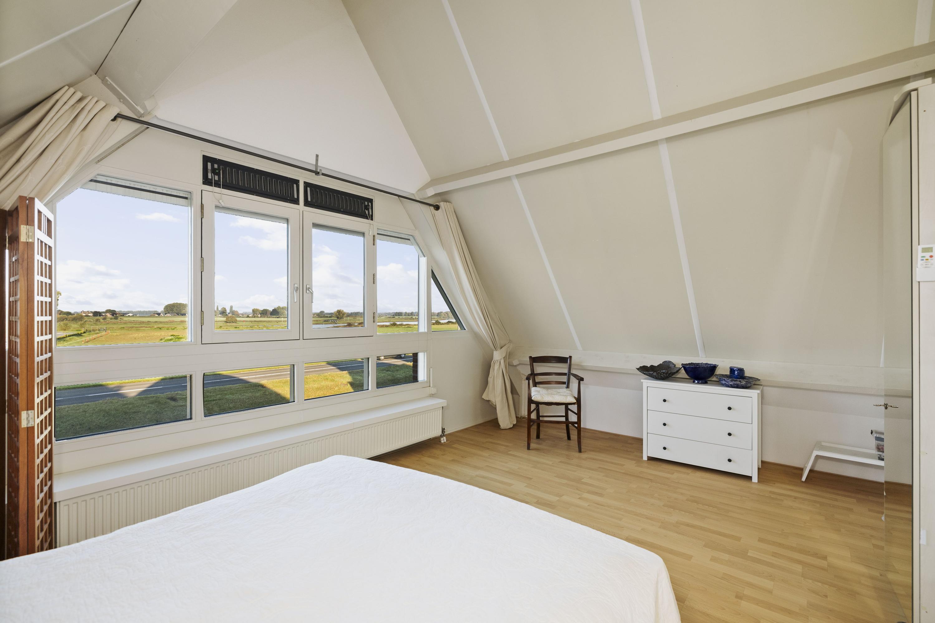 De architectuur zorgt voor volop lichtinval en mooie zichtlijnen die het uitzicht over het rivierenlandschap optimaal tot hun recht laten komen. De sfeervolle tuin met overkapping vormt een verlengstuk van de woonruimte en via een trap is ook het balkon op de verdieping bereikbaar — ideaal om op zomerse avonden te genieten van de ondergaande zon boven de IJssel.