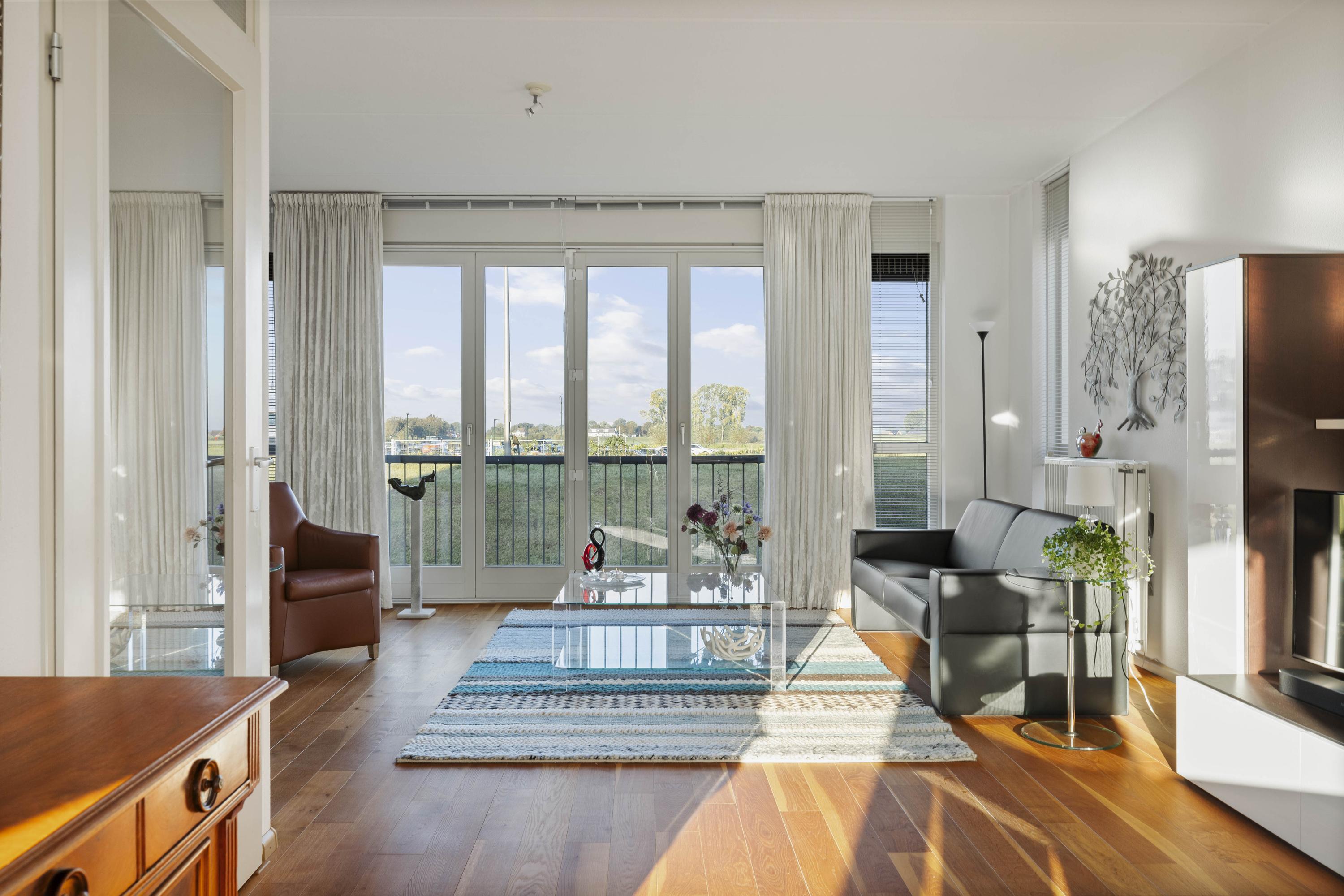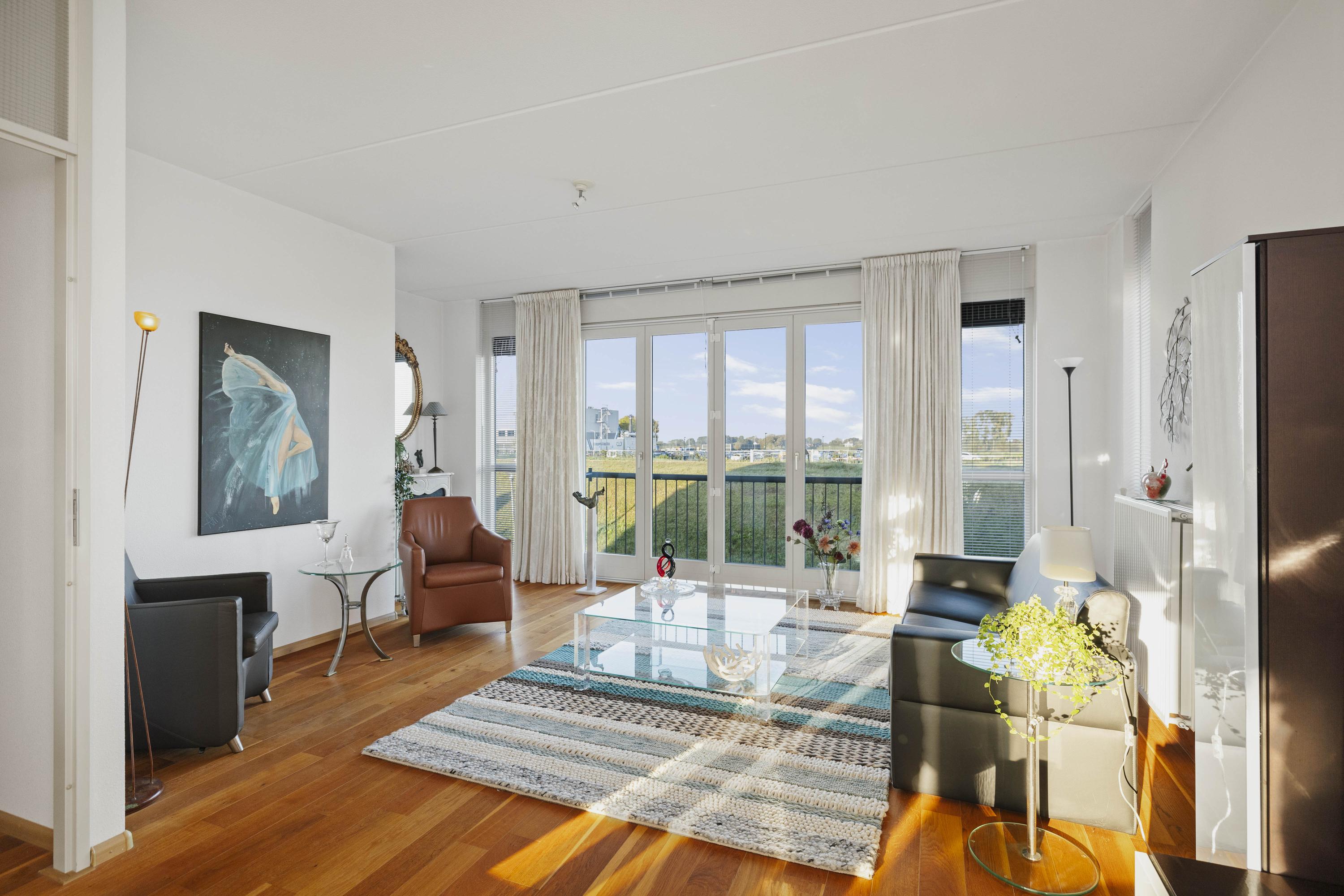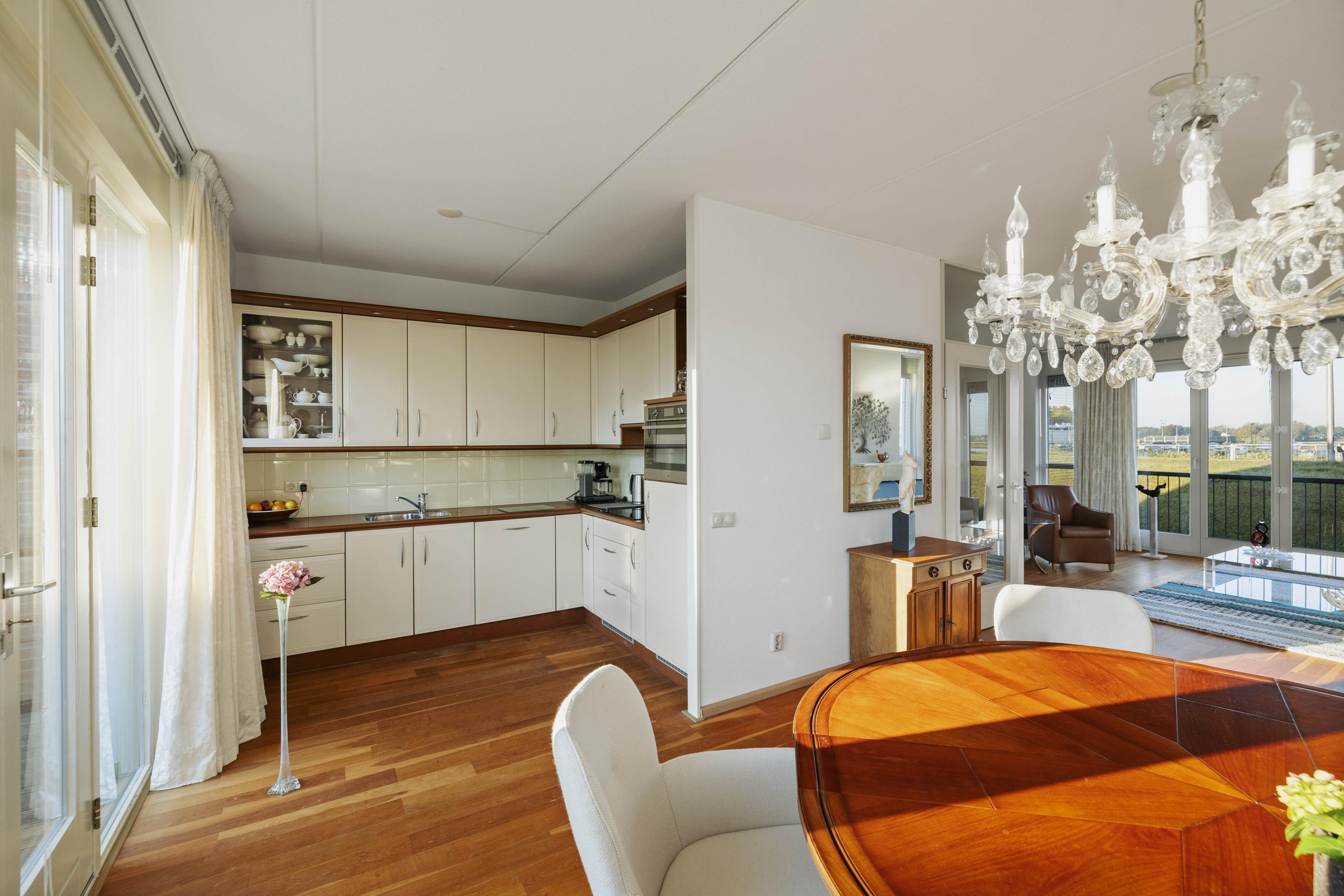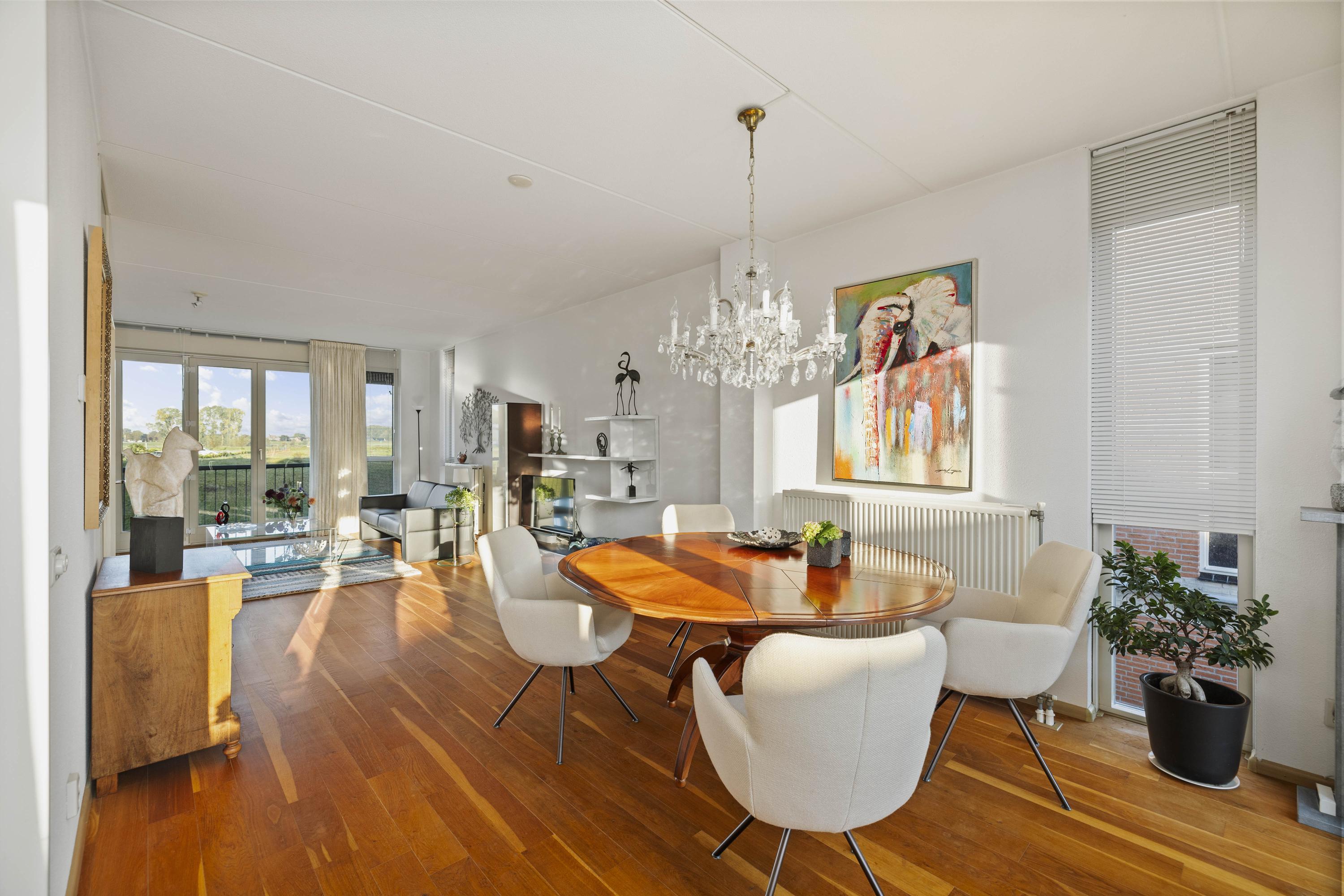 Aan de voorzijde geniet je van een fenomenaal uitzicht over de IJssel, terwijl aan de achterzijde het eetgedeelte en de keuken zijn gesitueerd. De keuken is uitgevoerd in een hoekopstelling met moderne inbouwapparatuur, waaronder een inductiekookplaat. Vanuit hier is het balkon bereikbaar, waar je heerlijk kunt ontspannen met uitzicht op de tuin. De parketvloer zorgt voor een warme, stijlvolle uitstraling.