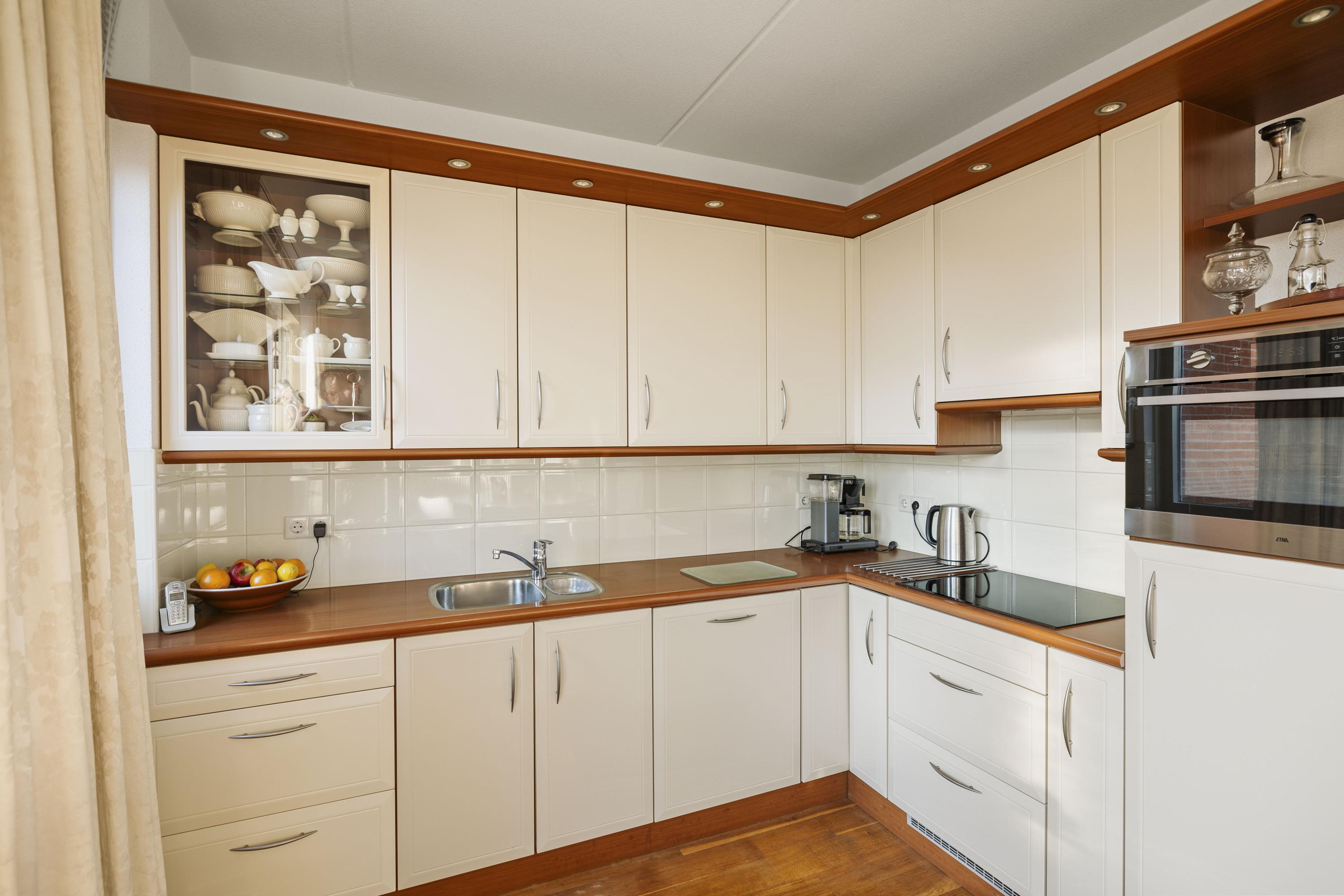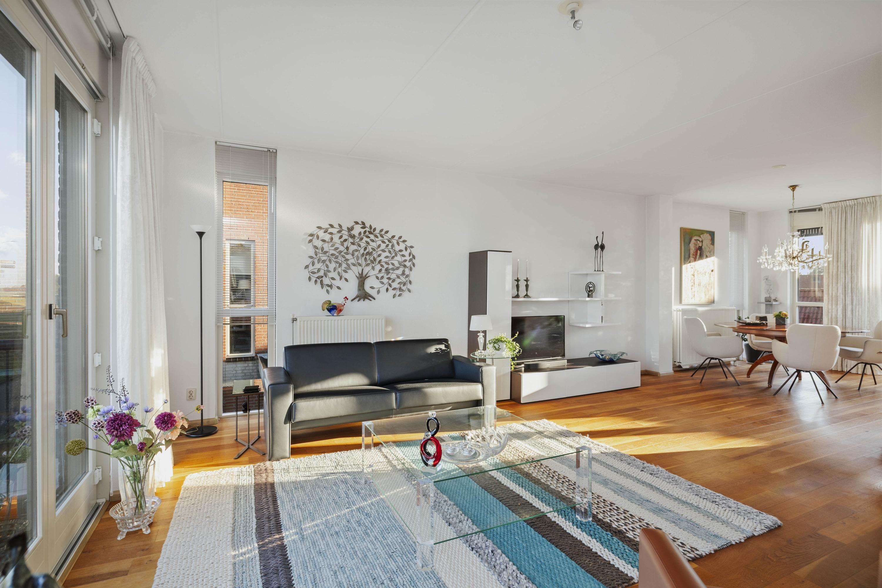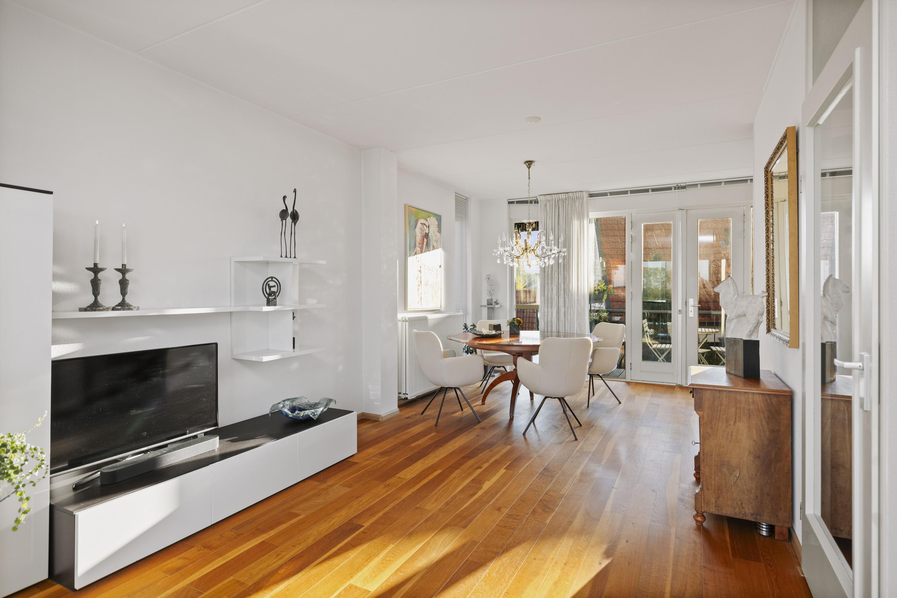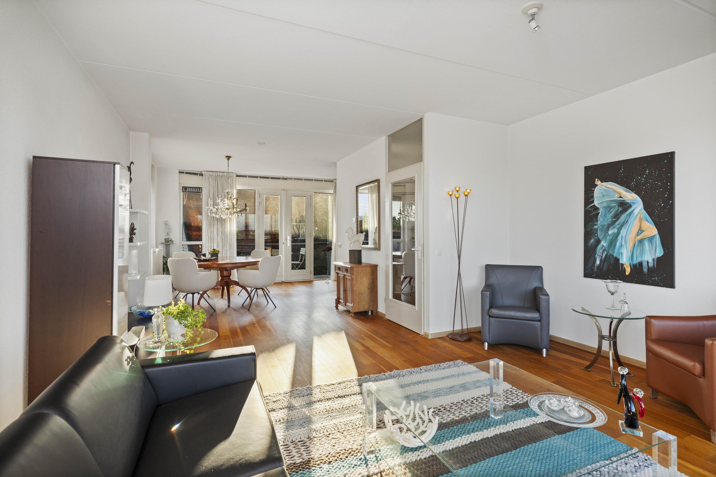 Aan de voorzijde geniet je van een fenomenaal uitzicht over de IJssel, terwijl aan de achterzijde het eetgedeelte en de keuken zijn gesitueerd. De keuken is uitgevoerd in een hoekopstelling met moderne inbouwapparatuur, waaronder een inductiekookplaat. Vanuit hier is het balkon bereikbaar, waar je heerlijk kunt ontspannen met uitzicht op de tuin. De parketvloer zorgt voor een warme, stijlvolle uitstraling.