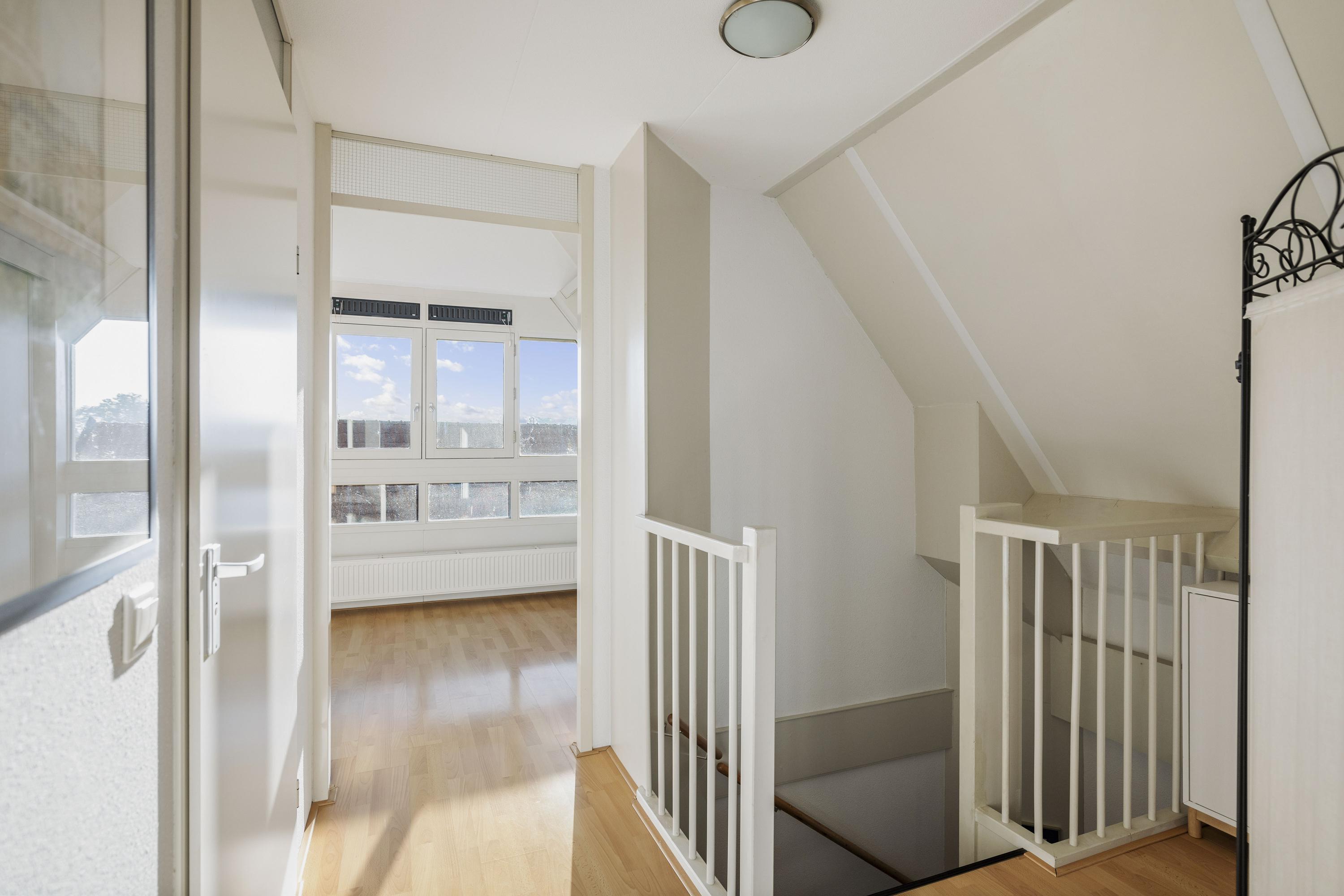 Via de overloop bereik je de lichte woonkamer met open keuken.