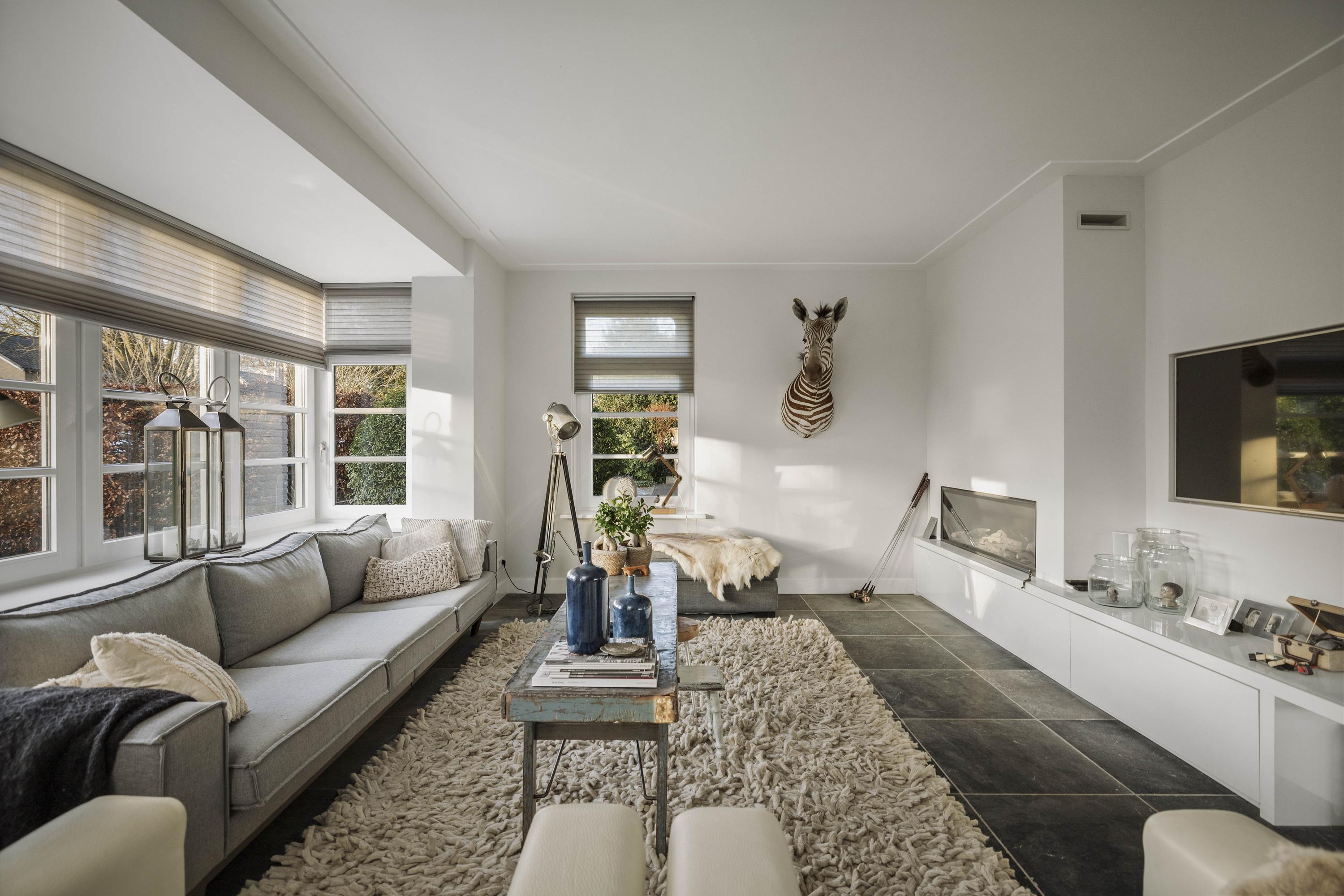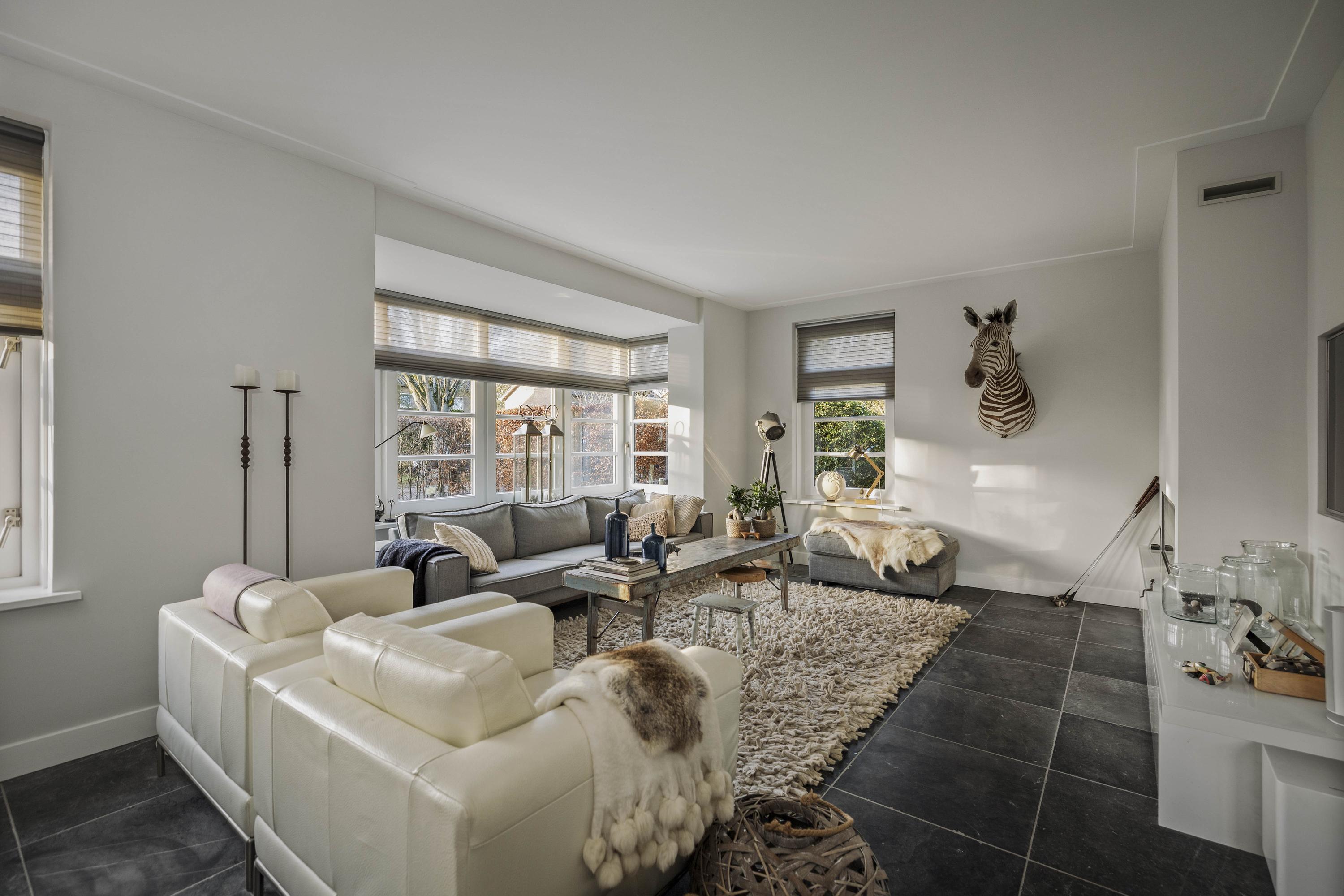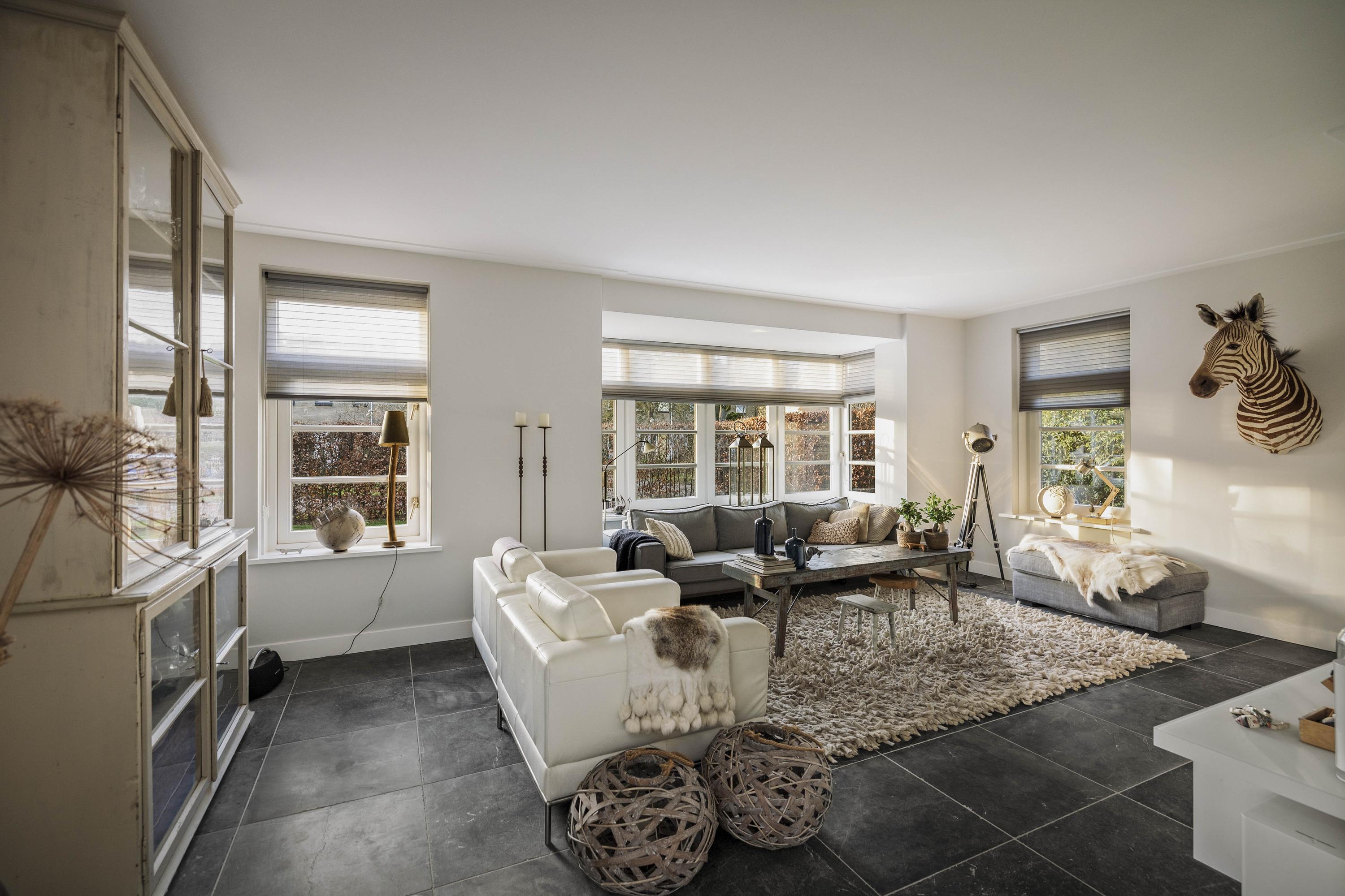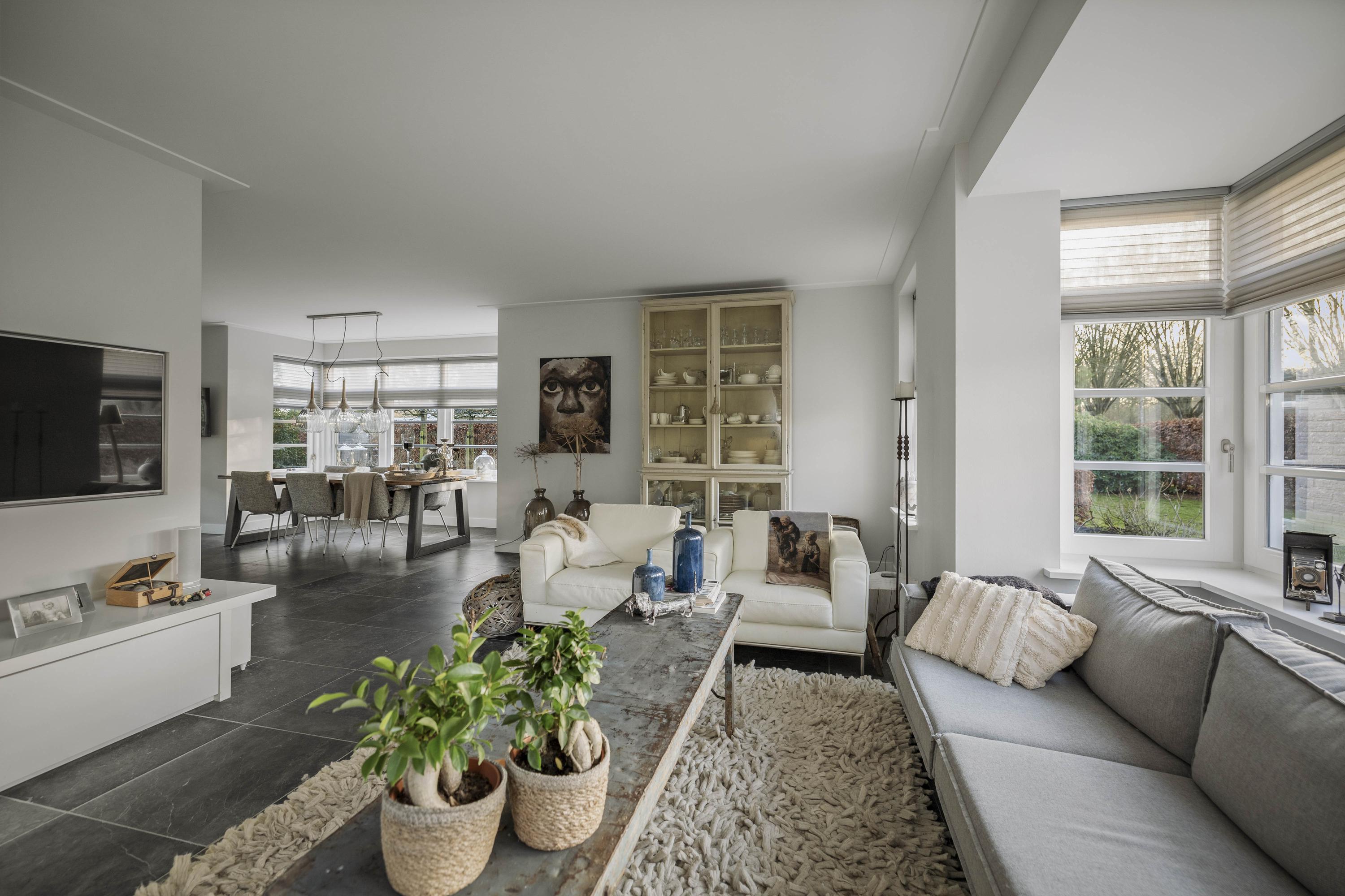 De royale en sfeervolle woonkamer beschikt over veel lichtinval en een prachtig uitzicht op de tuin. Twee grote erkers met veel glas versterken dit ruimtelijke gevoel. Voor extra comfort en sfeer is er een gashaard aanwezig.