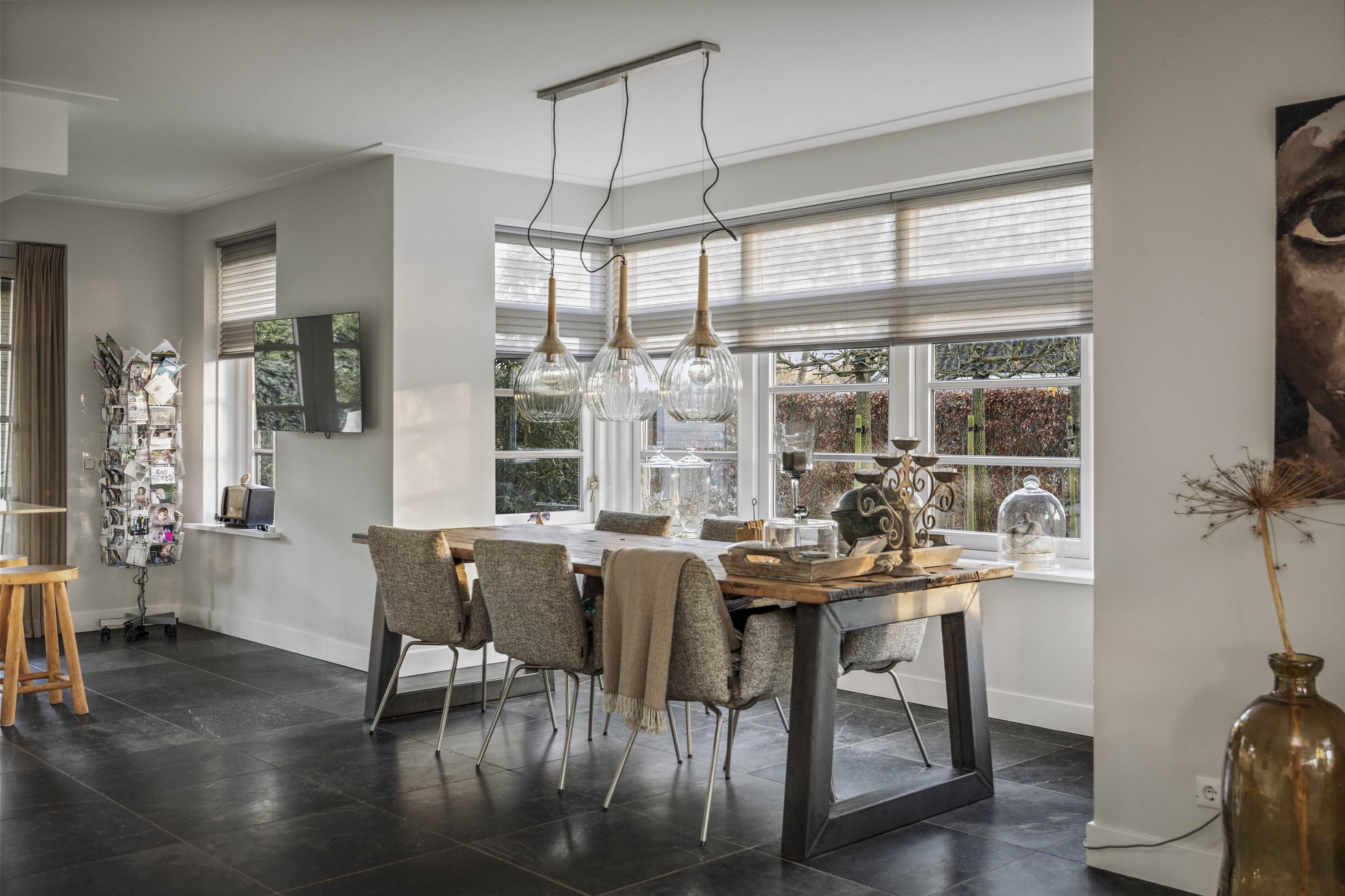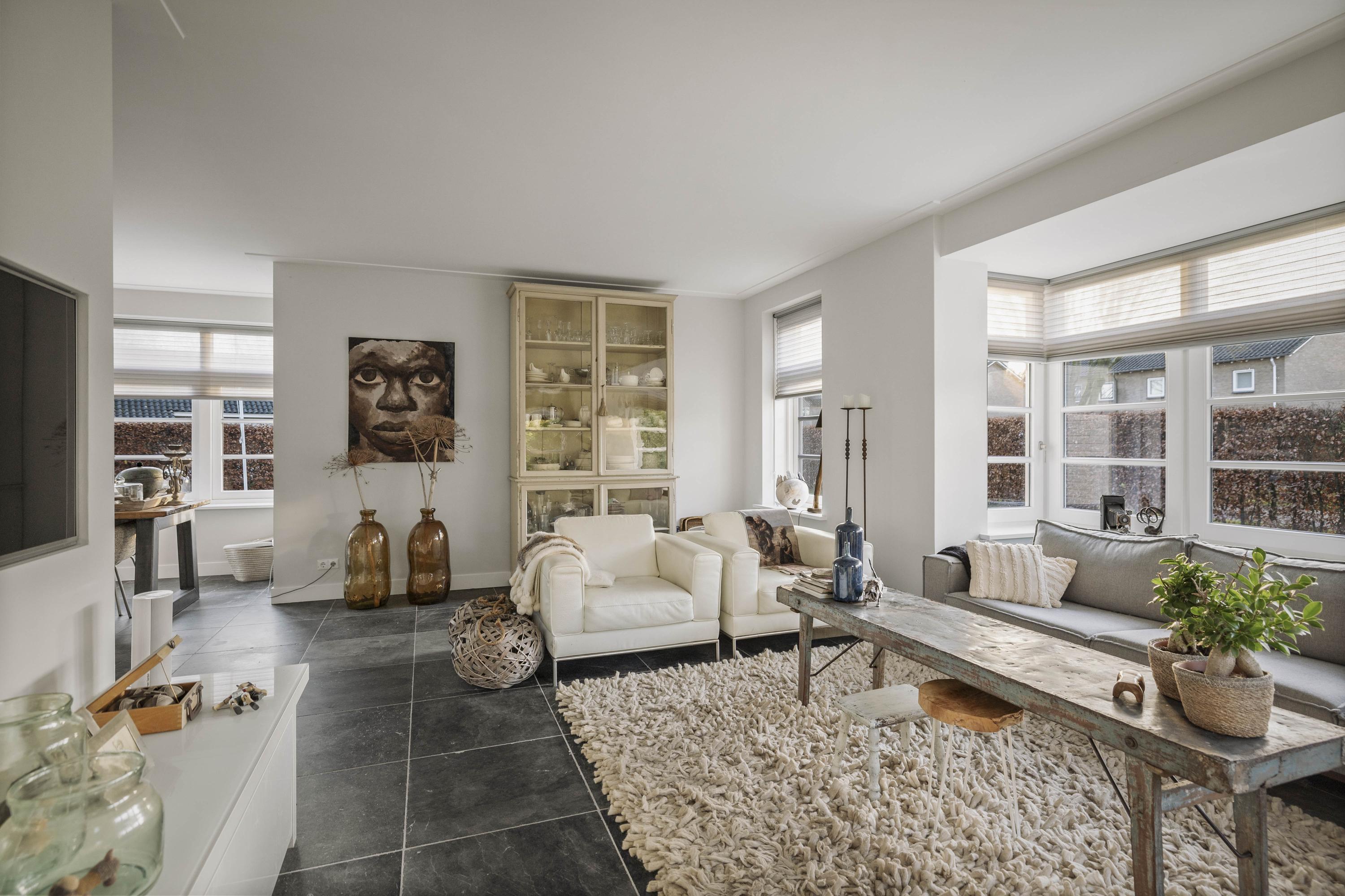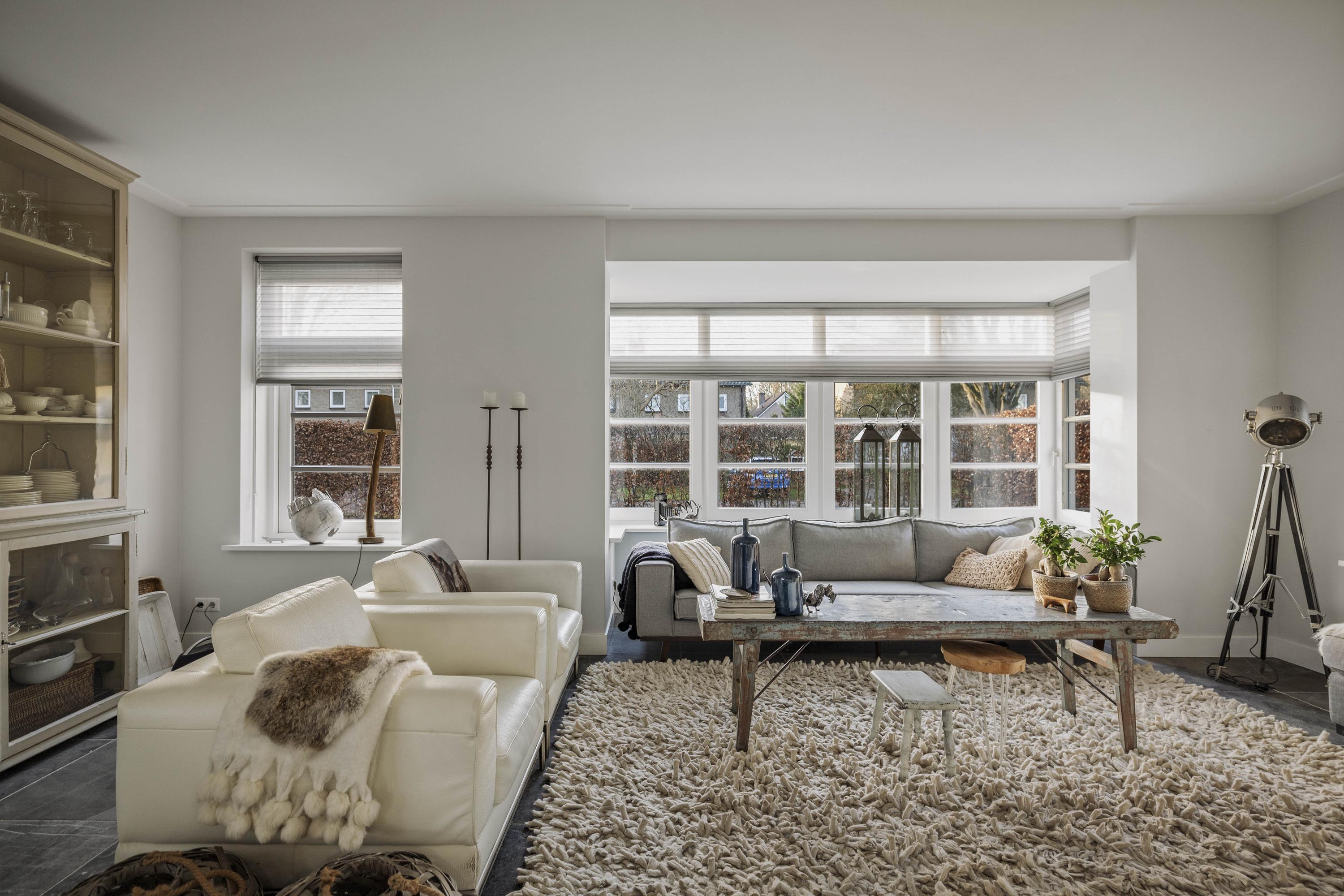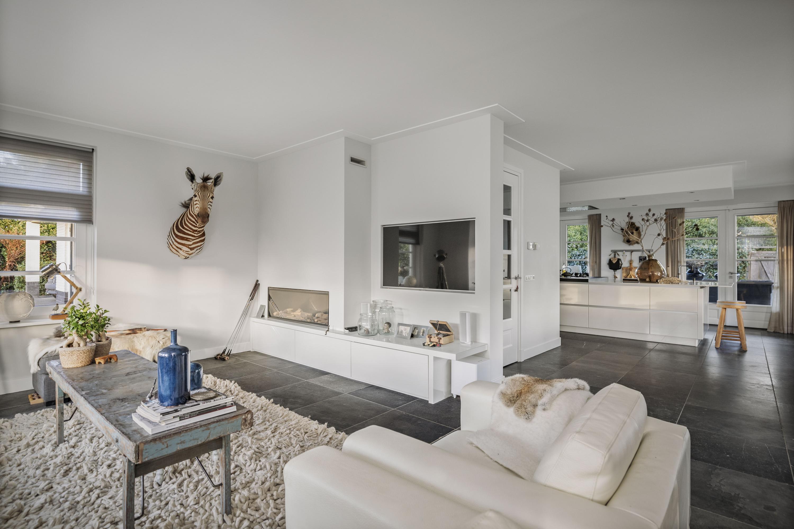 De royale en sfeervolle woonkamer beschikt over veel lichtinval en een prachtig uitzicht op de tuin. Twee grote erkers met veel glas versterken dit ruimtelijke gevoel. Voor extra comfort en sfeer is er een gashaard aanwezig.