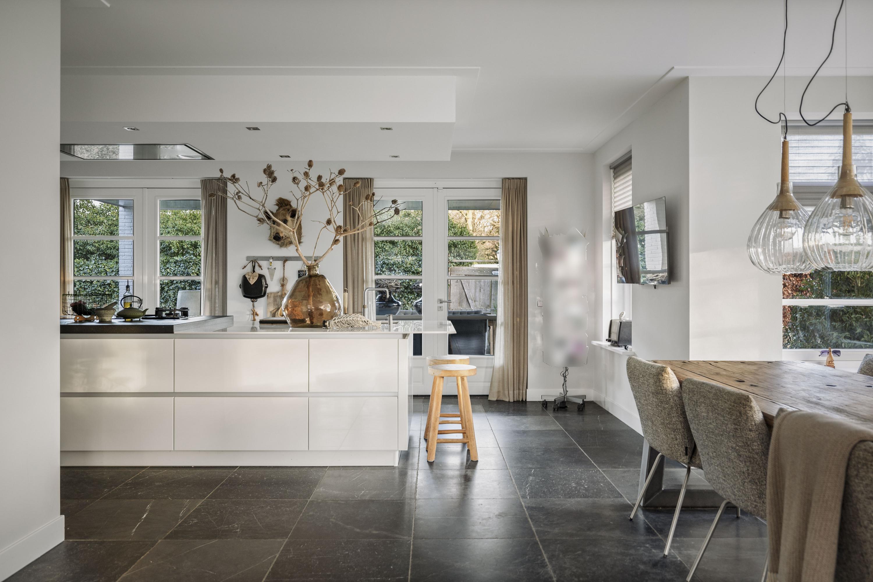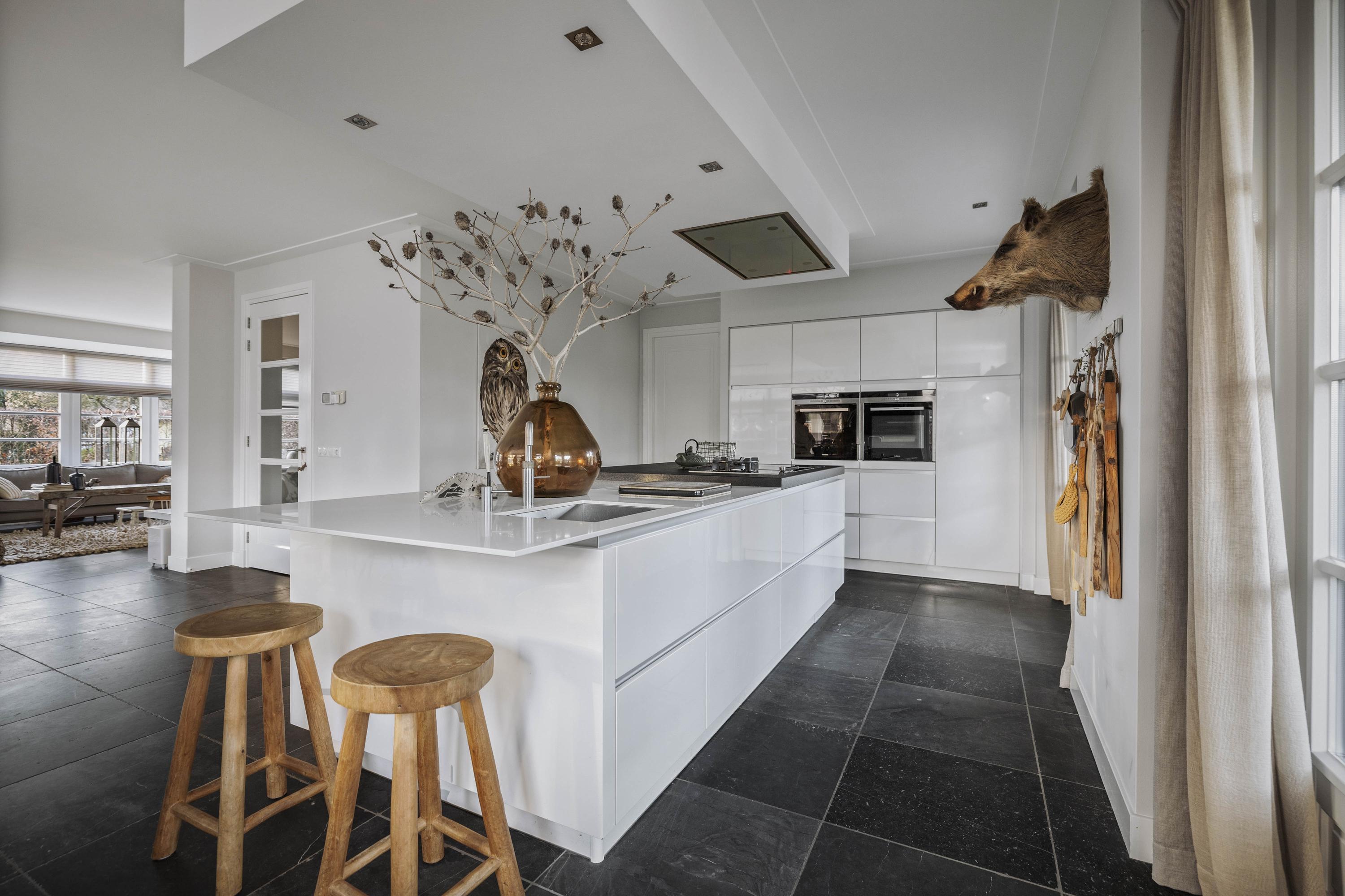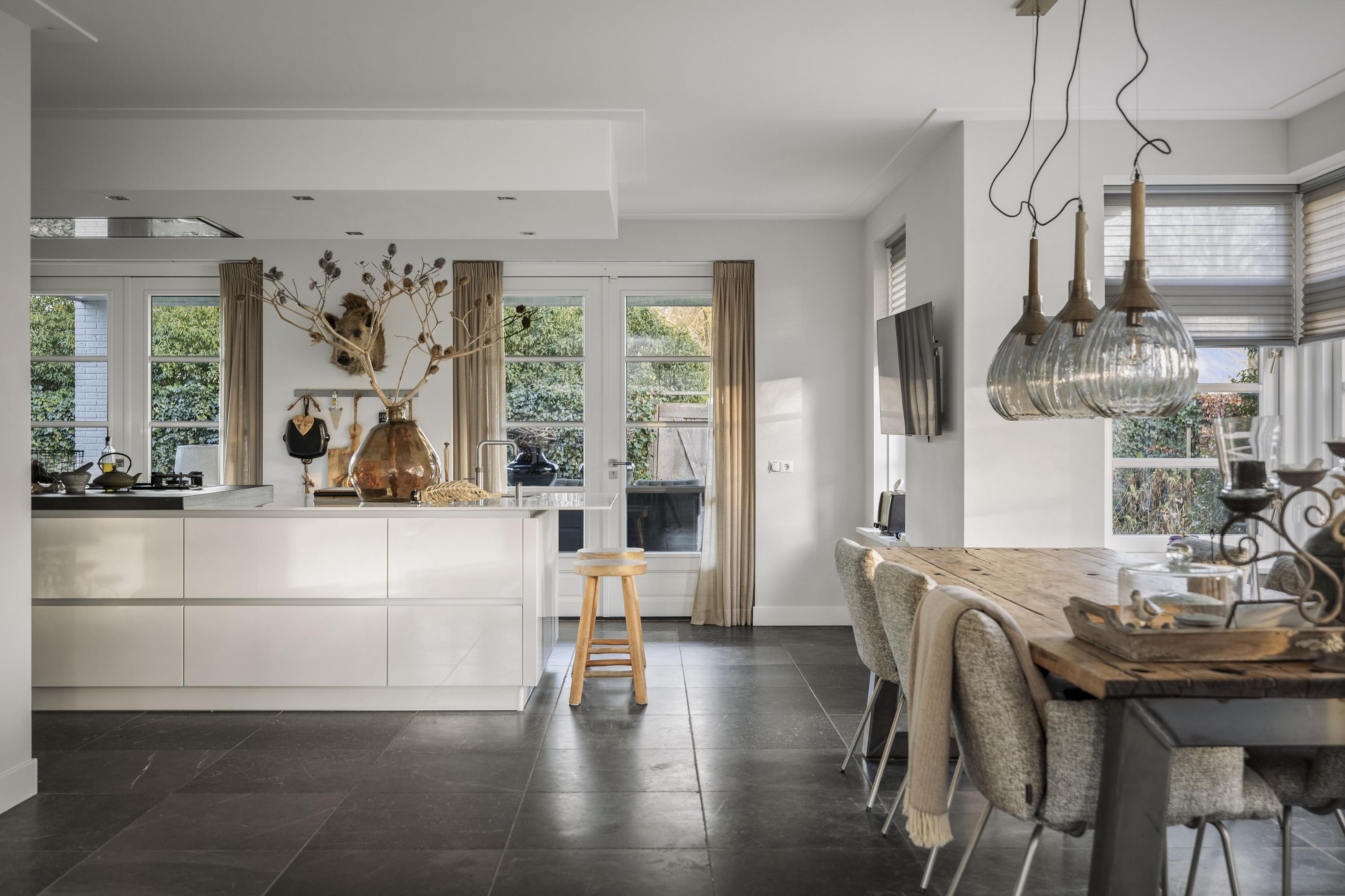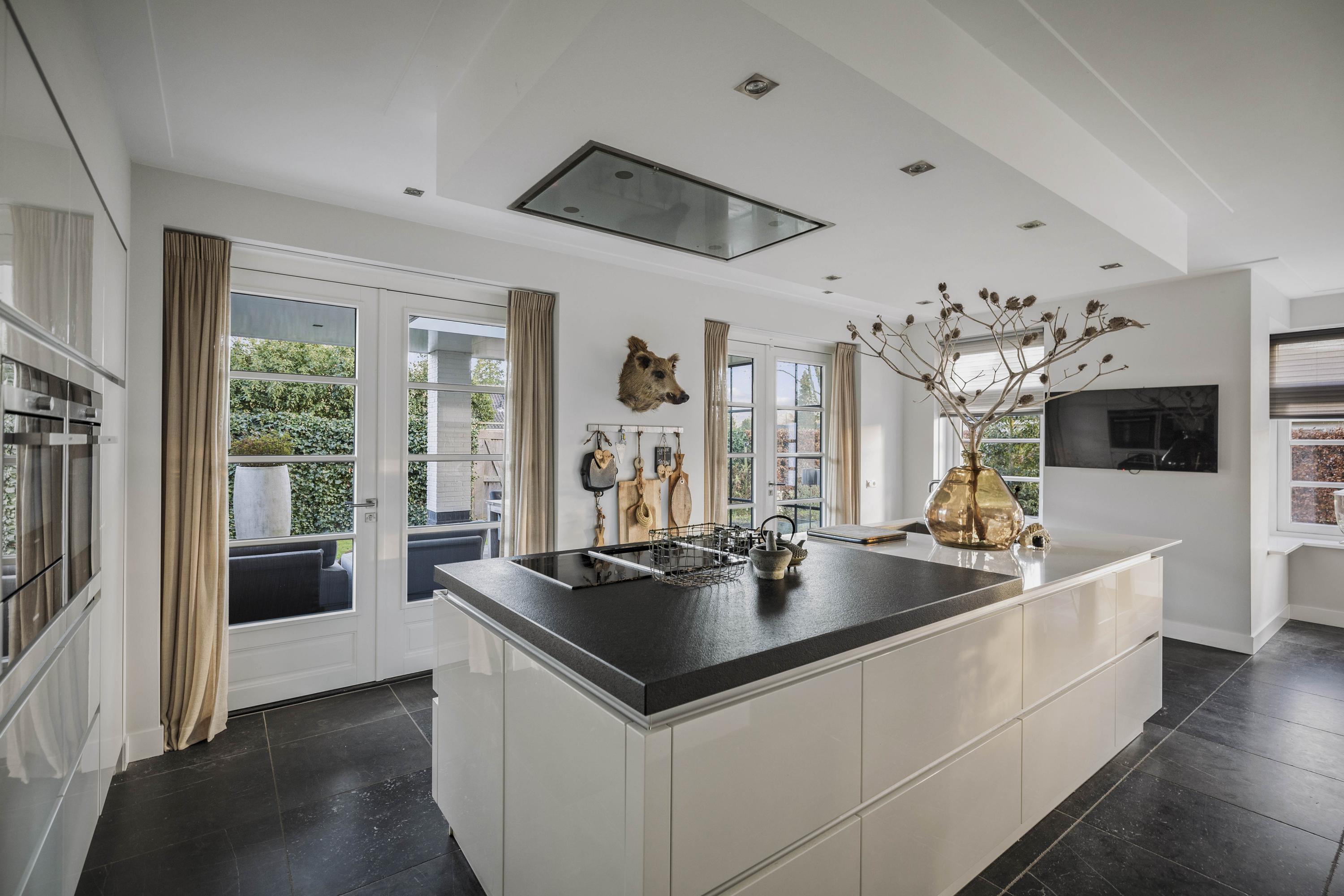 De zeer ruim opgezette woonkeuken vormt het hart van de woning. De grote erker in de zijgevel biedt plaats aan een royale eettafel met uitzicht op de tuin. De keuken is voorzien van een kook-/werkeiland, hoogwaardige inbouwapparatuur van topmerken, veel lades en ruime servieskasten. Via twee openslaande tuindeuren is de veranda aan de achterzijde bereikbaar.
