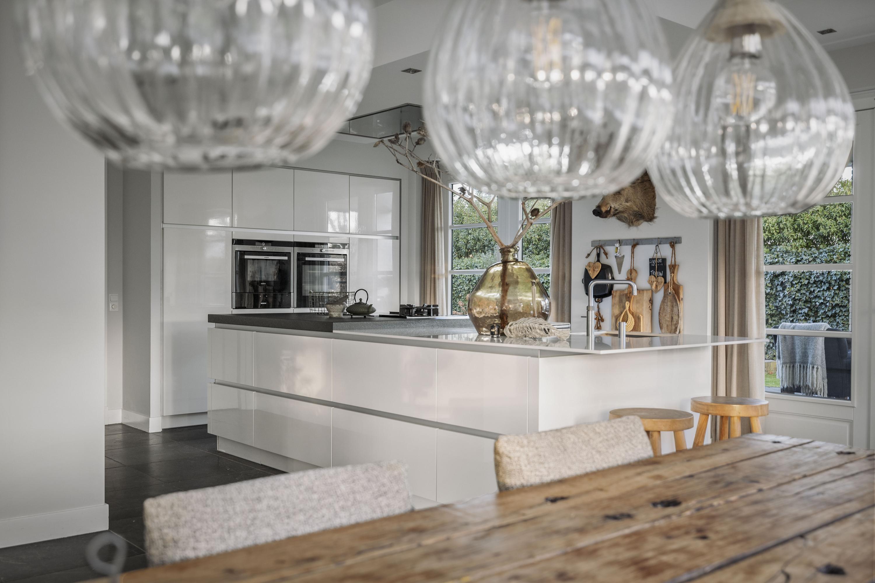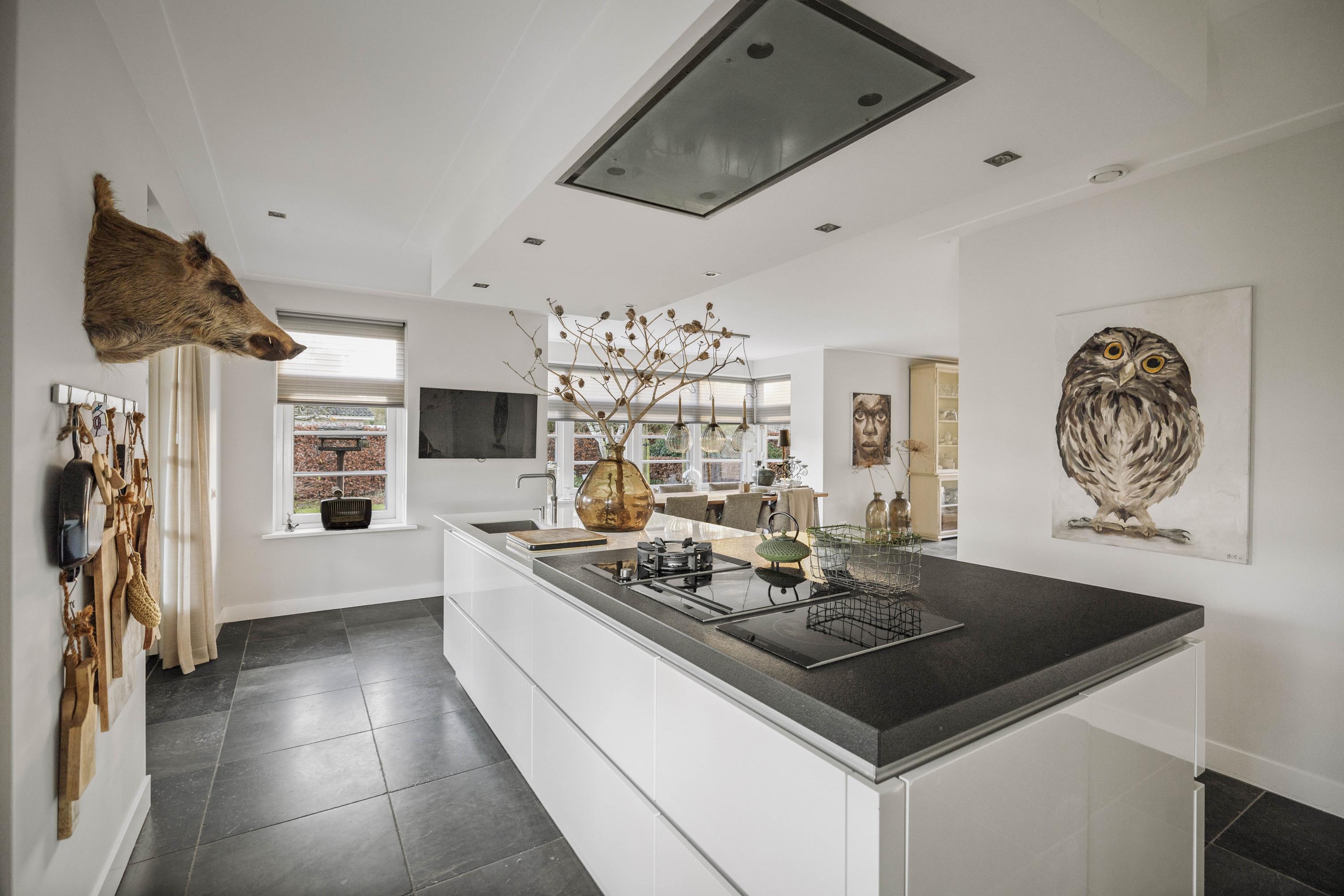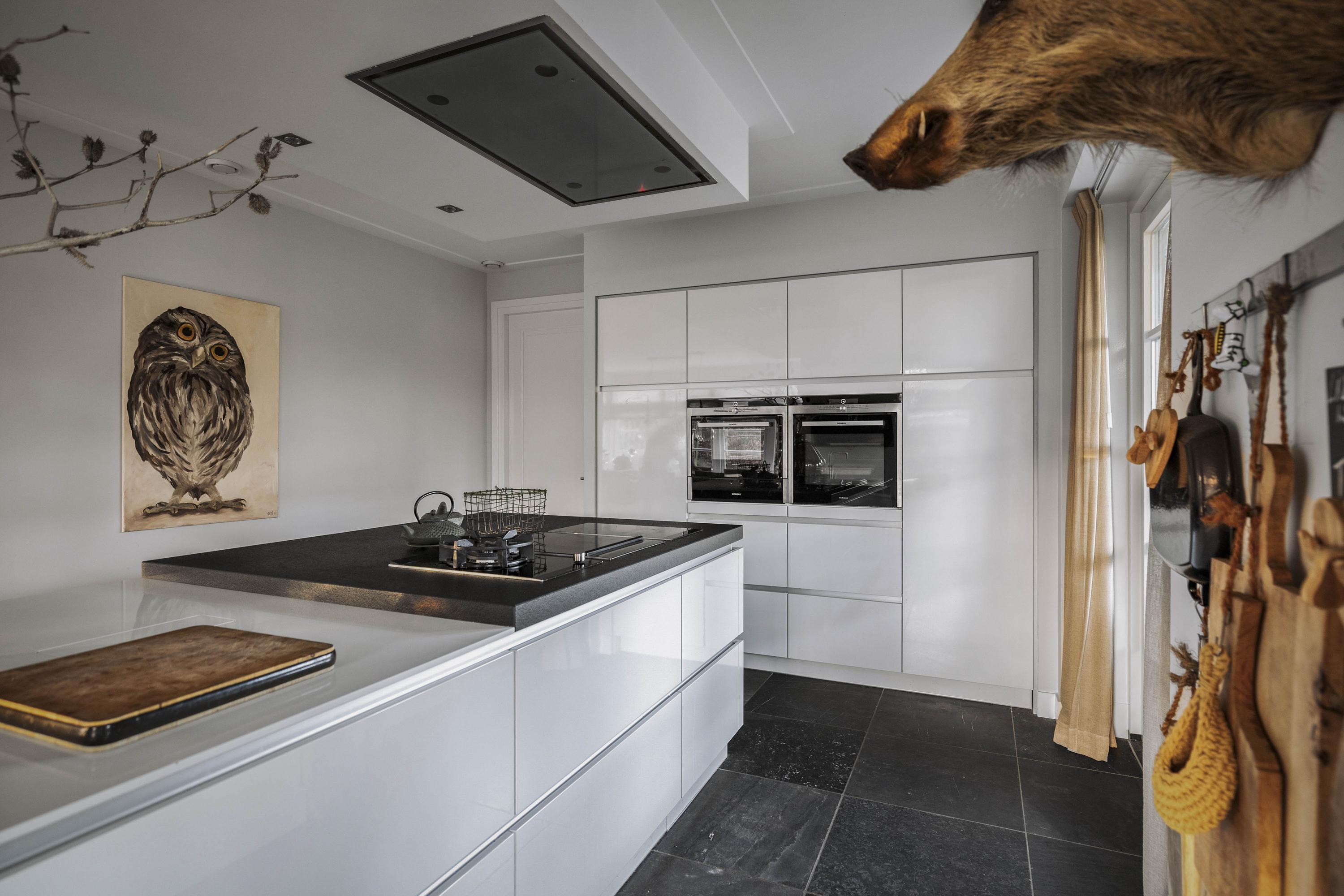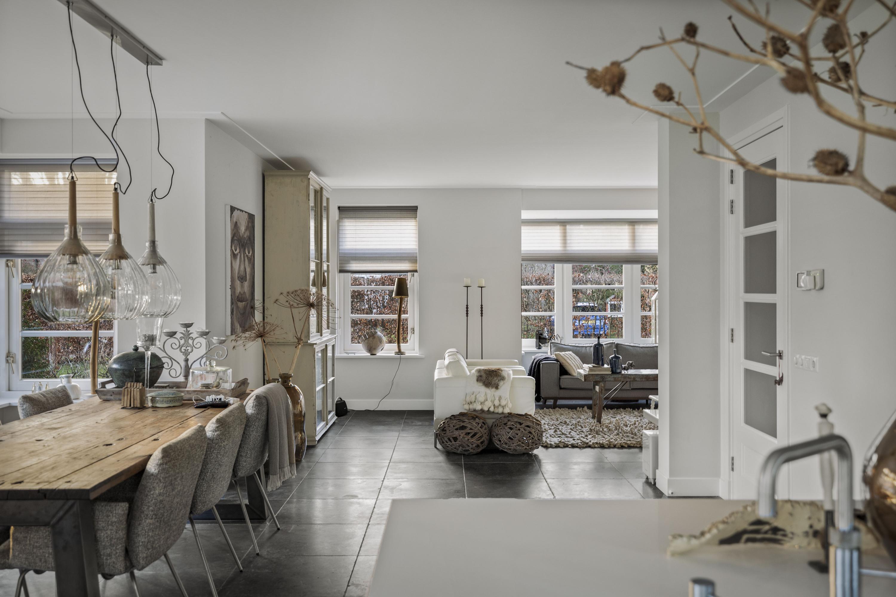 De zeer ruim opgezette woonkeuken vormt het hart van de woning. De grote erker in de zijgevel biedt plaats aan een royale eettafel met uitzicht op de tuin. De keuken is voorzien van een kook-/werkeiland, hoogwaardige inbouwapparatuur van topmerken, veel lades en ruime servieskasten. Via twee openslaande tuindeuren is de veranda aan de achterzijde bereikbaar.