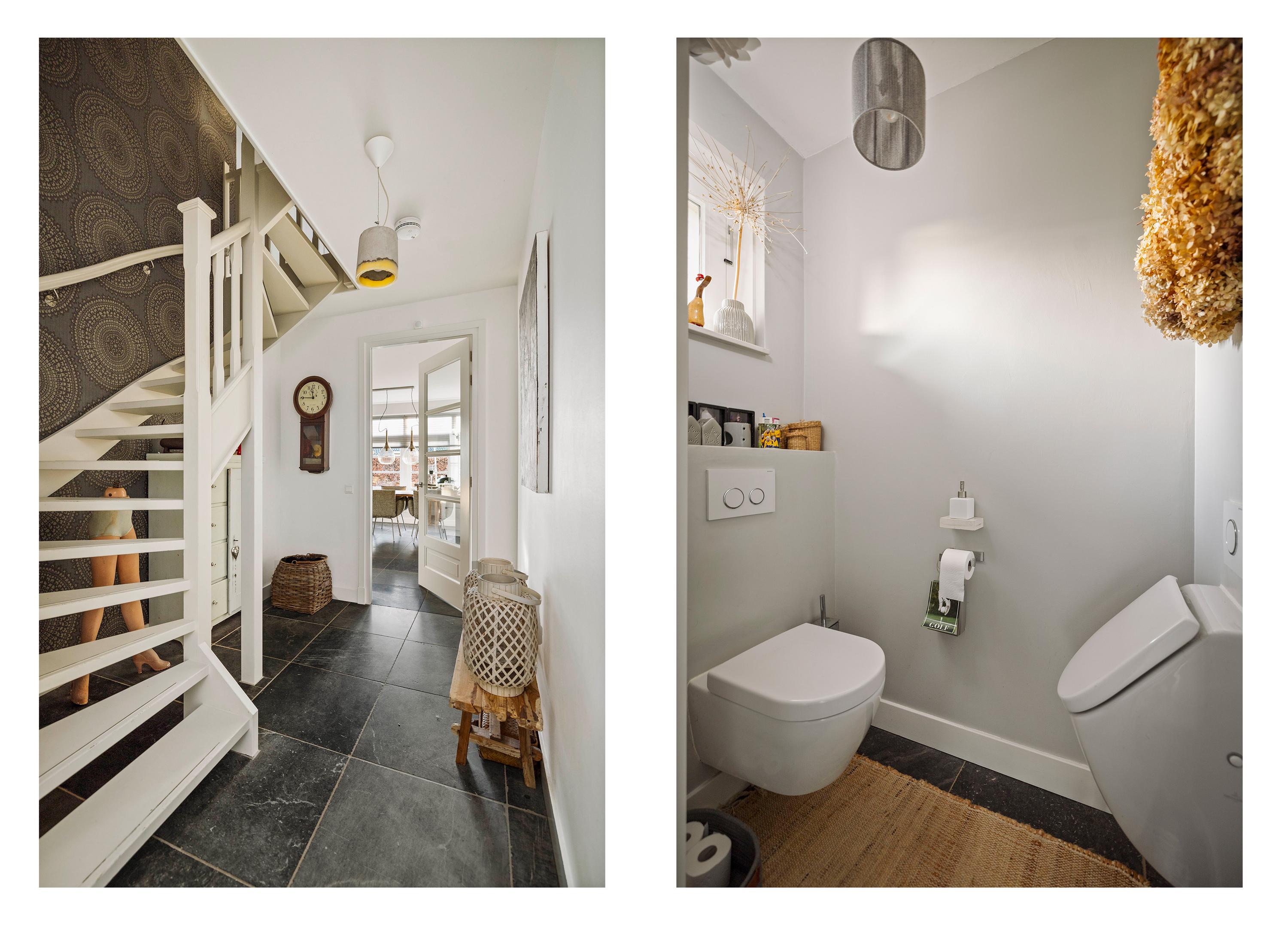 Entree, ruime hal met garderobe, modern toilet met vrij hangend closet, urinoir en fonteintje en een fraaie trapopgang naar de verdieping.