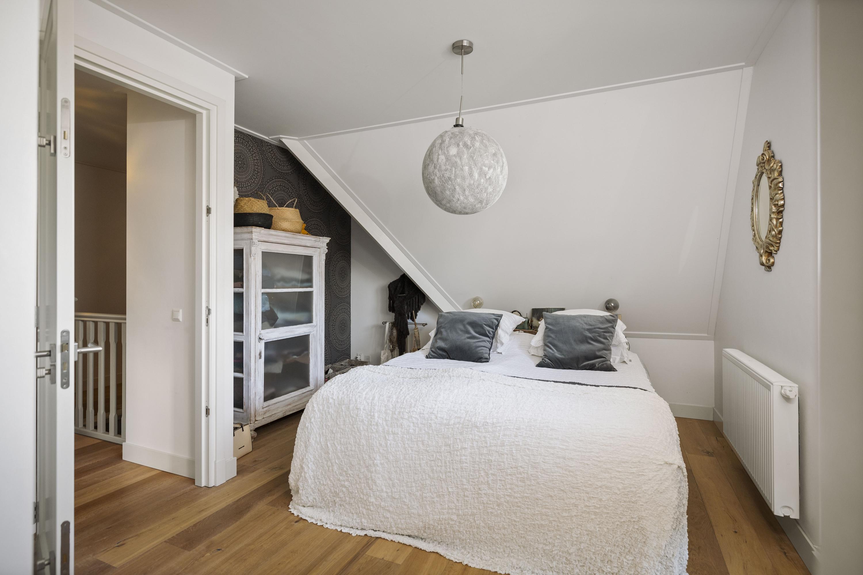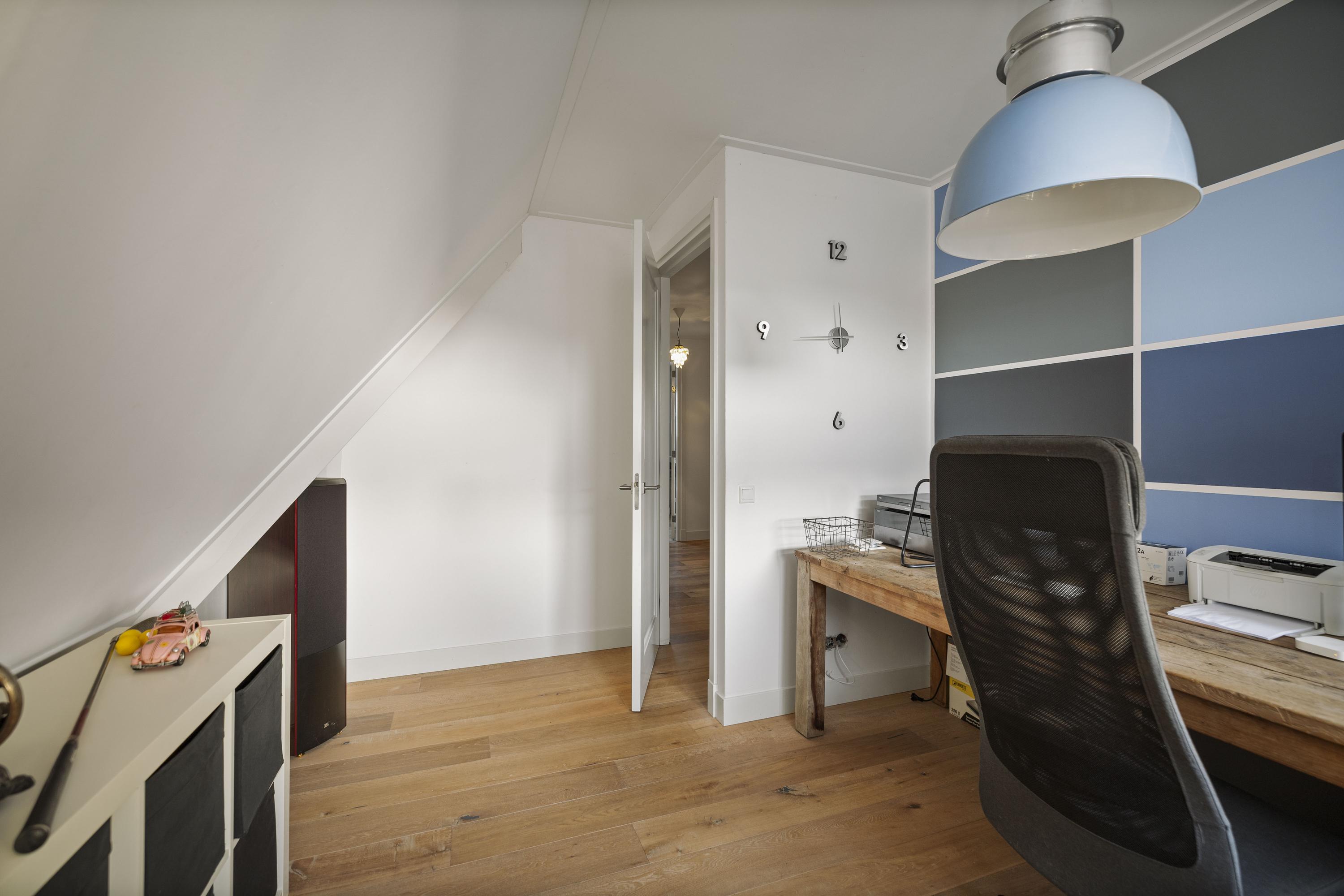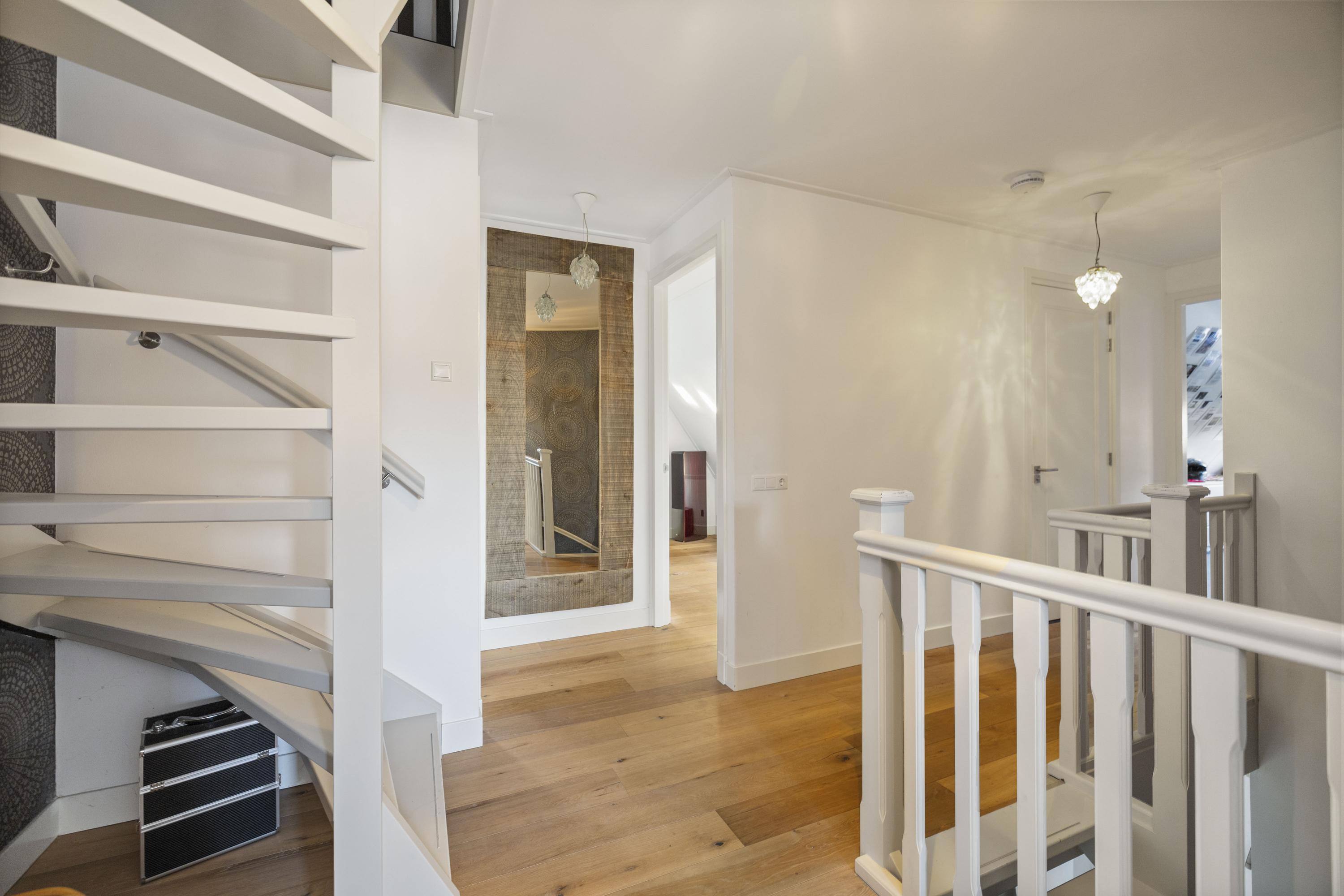 Op vrijwel de gehele verdieping ligt een stijlvolle eikenhouten vloer.