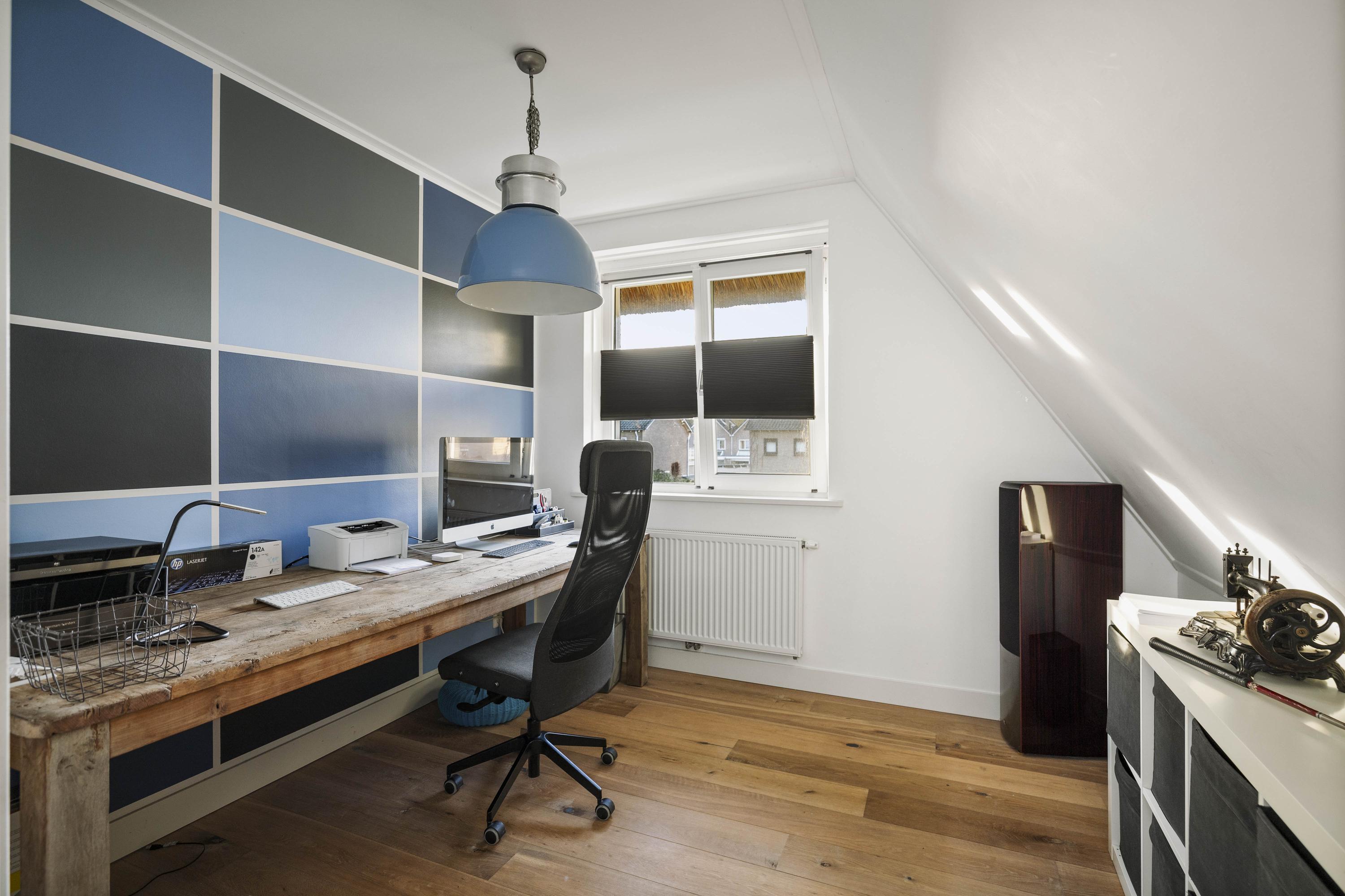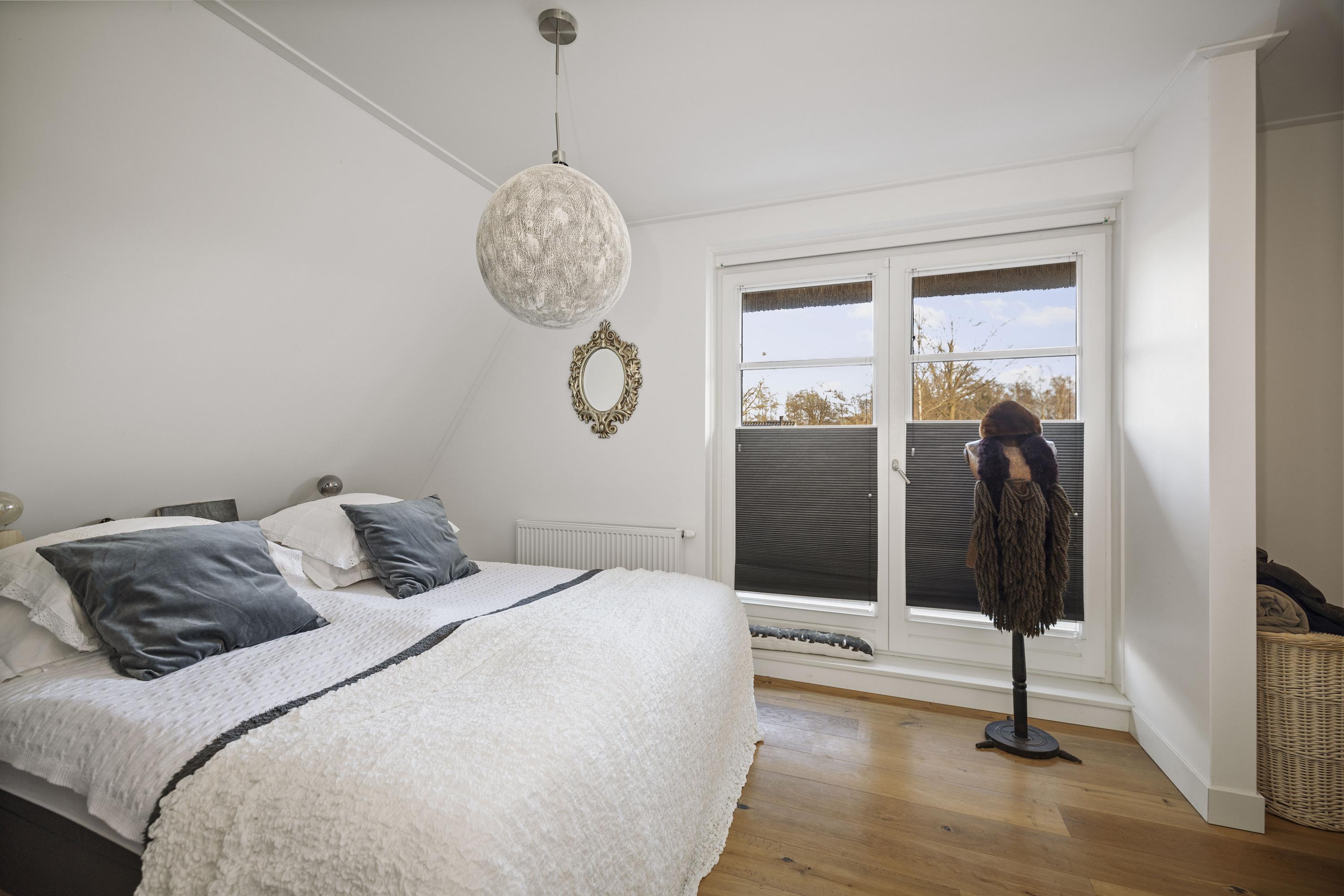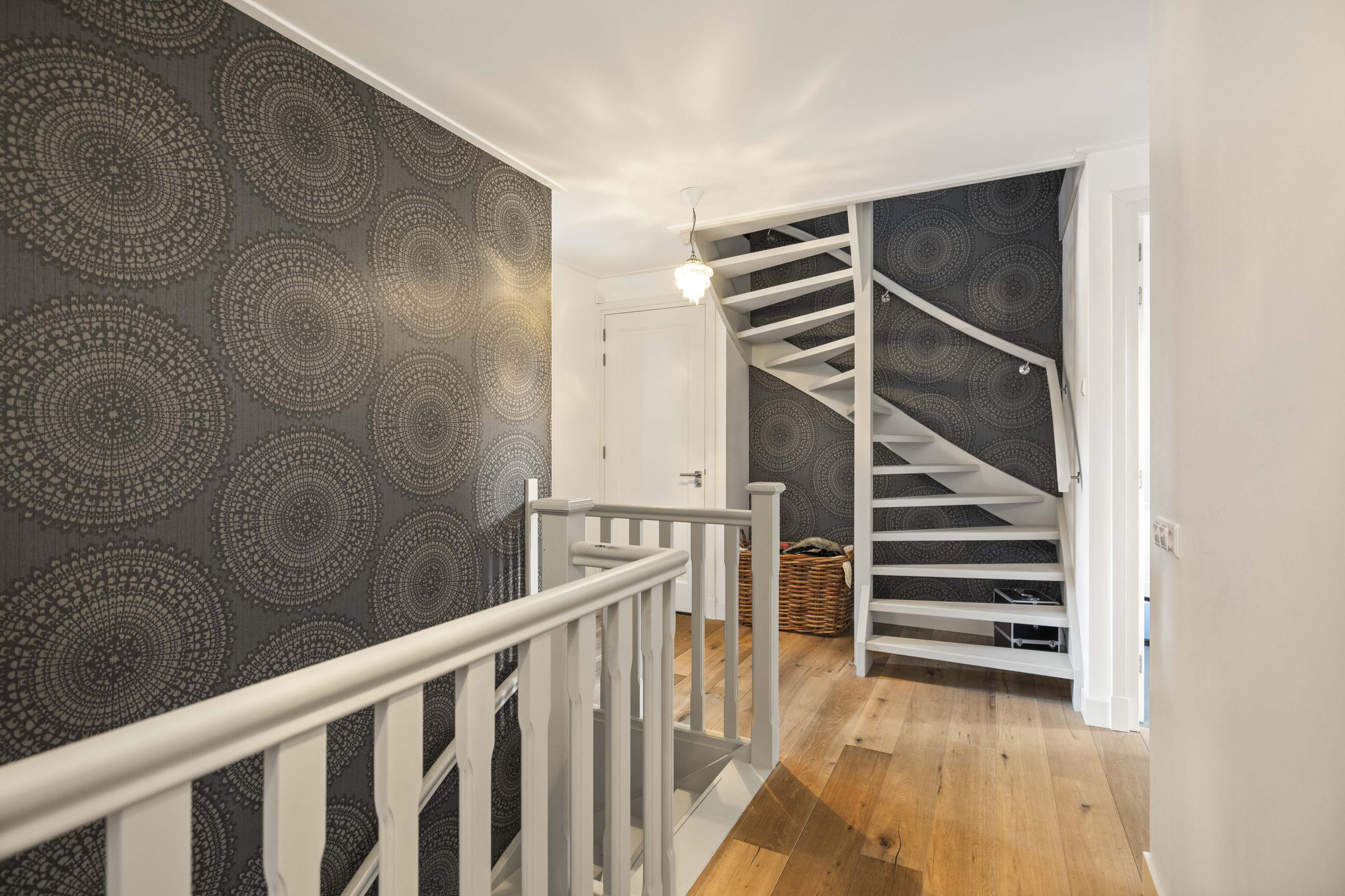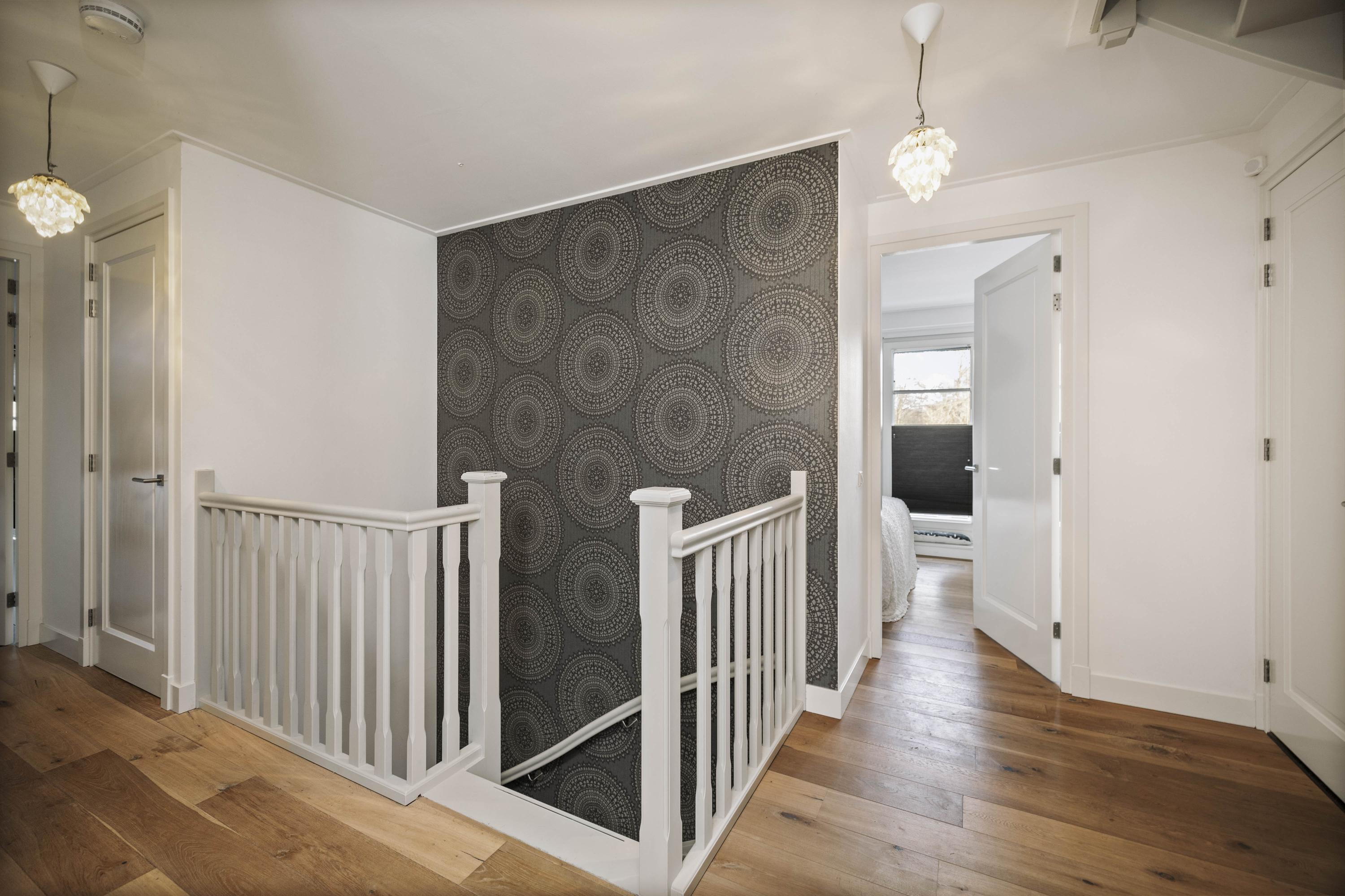 Op vrijwel de gehele verdieping ligt een stijlvolle eikenhouten vloer.