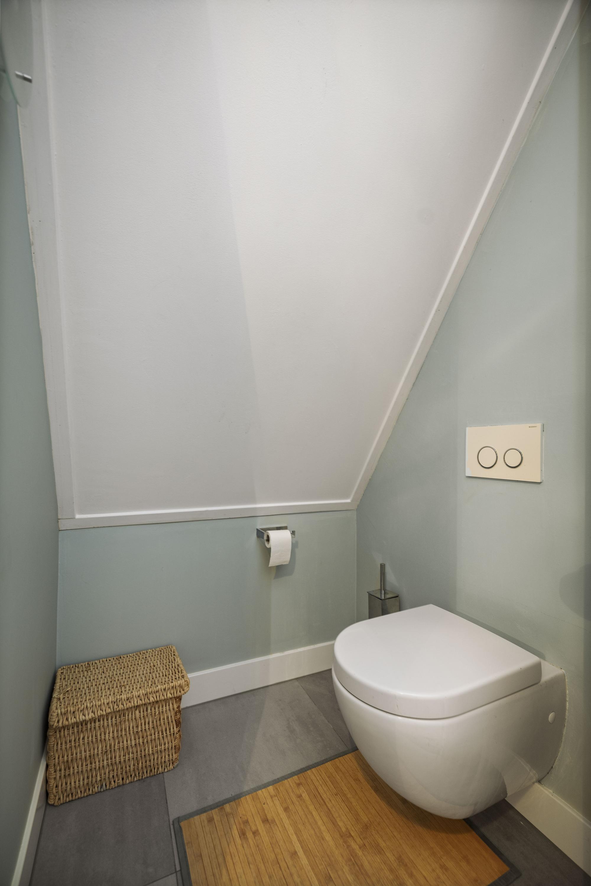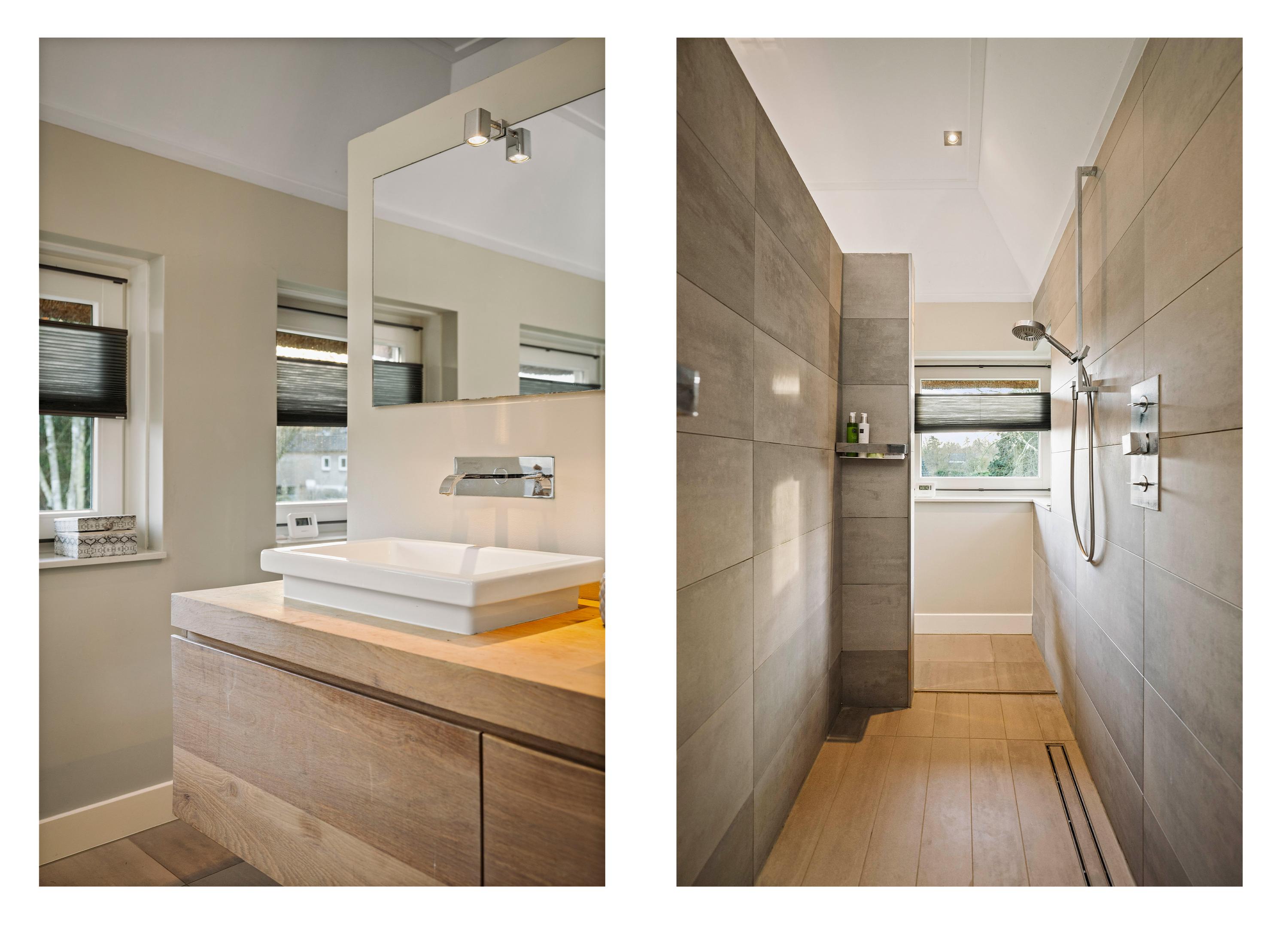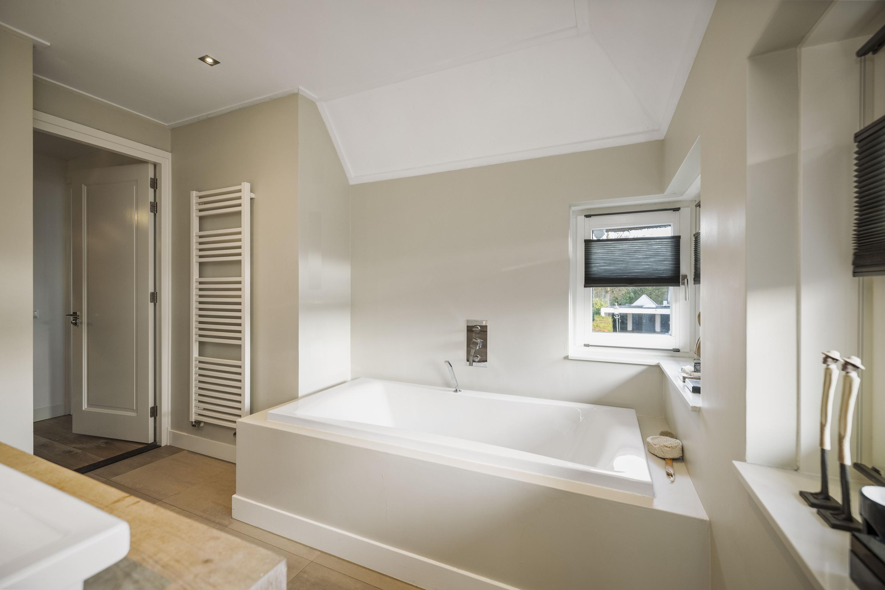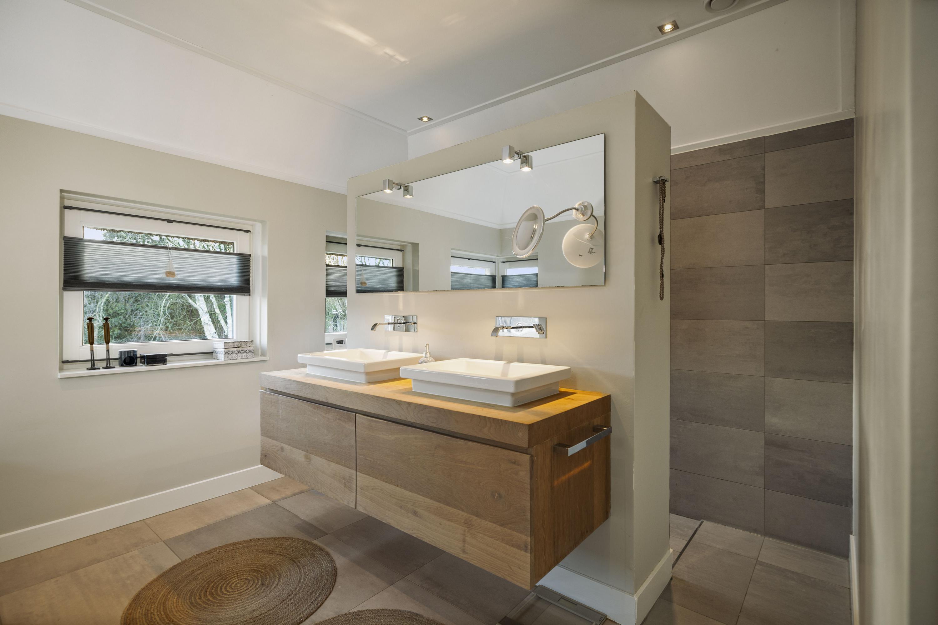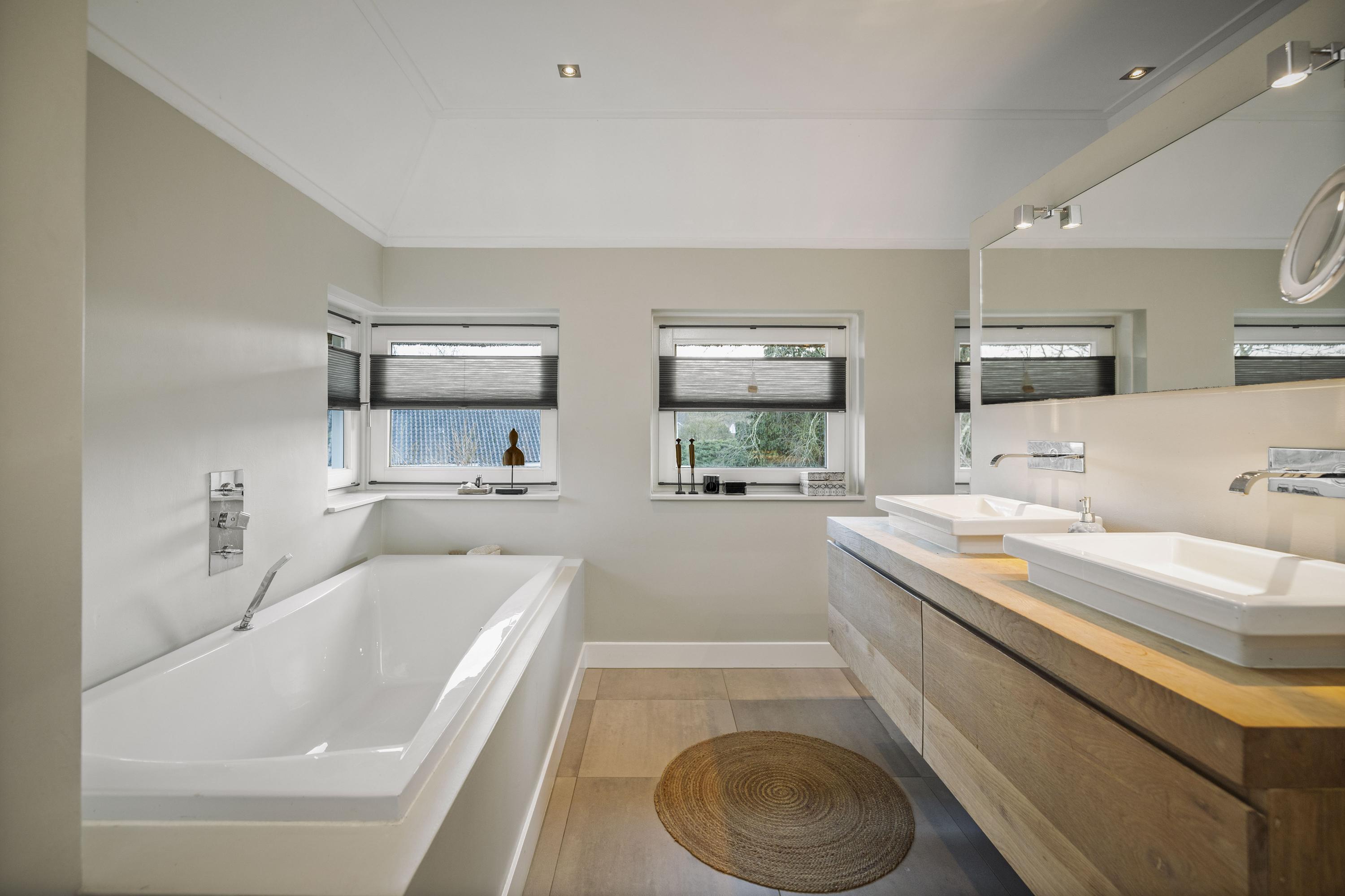 De luxe badkamer is uitgevoerd met een duo-ligbad, dubbele wastafel met fraai eiken meubel, zeer ruime inloopdouche en vloerverwarming. Het toilet is separaat en via de overloop bereikbaar. Daarnaast is er een stookruimte met cv-opstelling, aansluitingen voor wasmachine en droger en extra bergruimte.