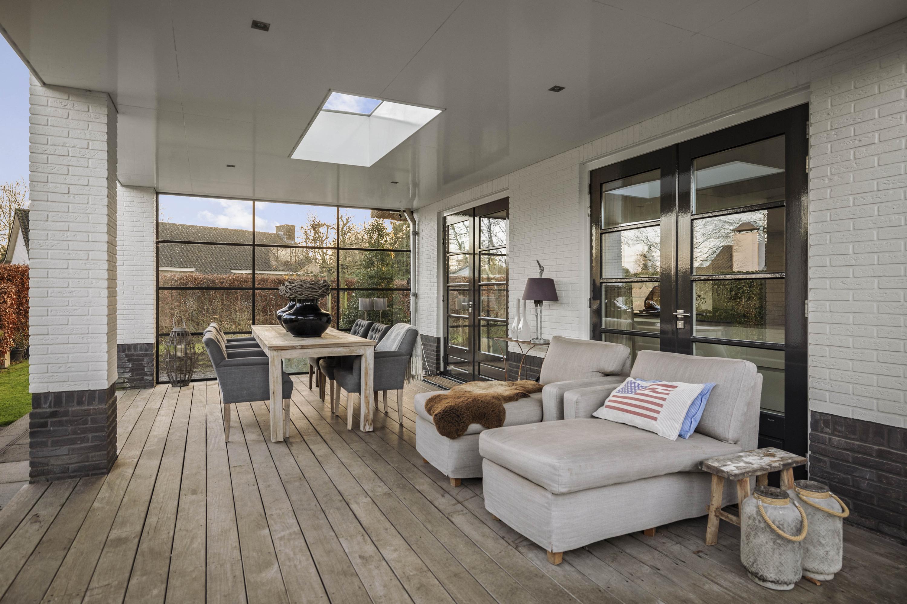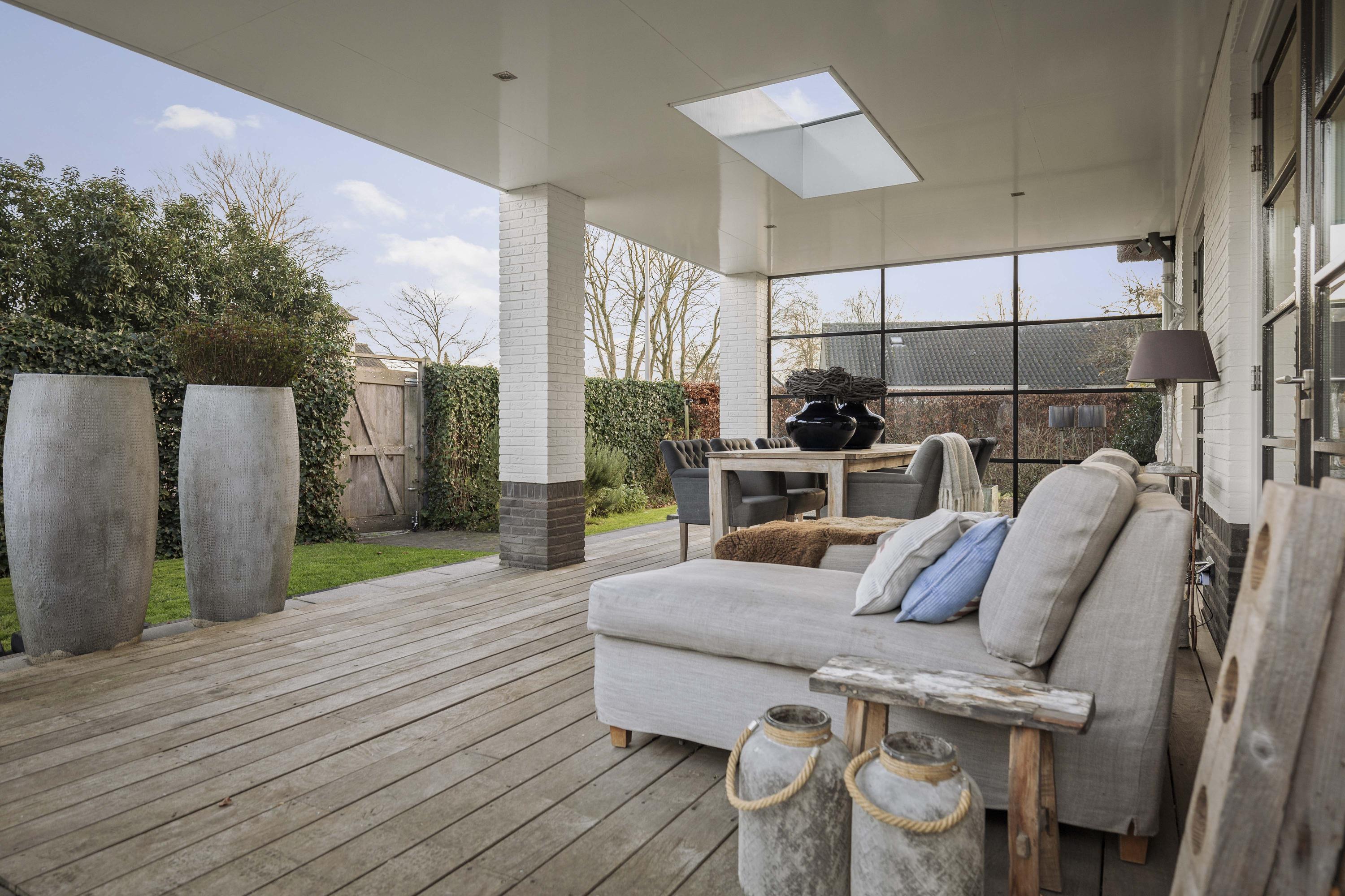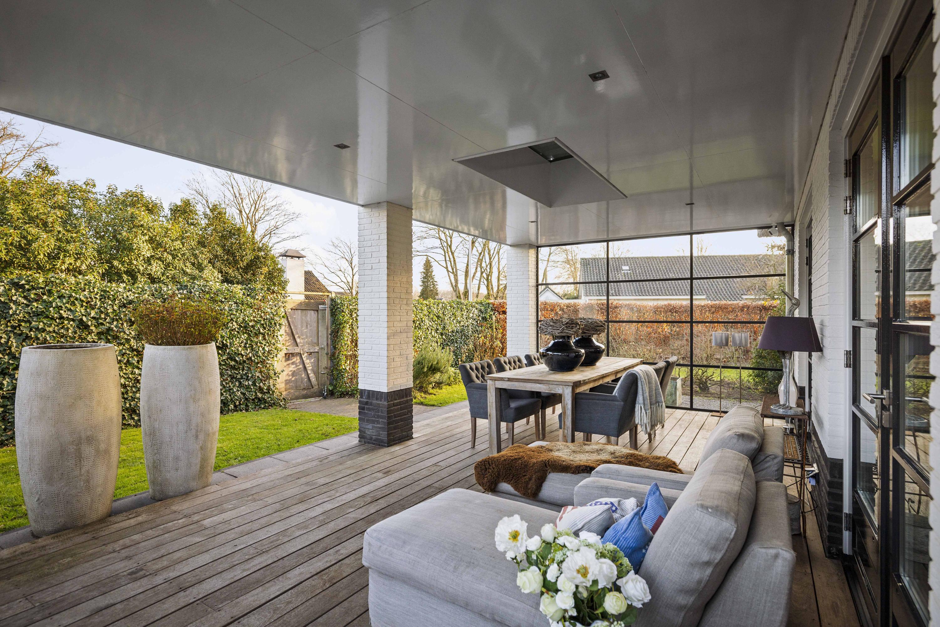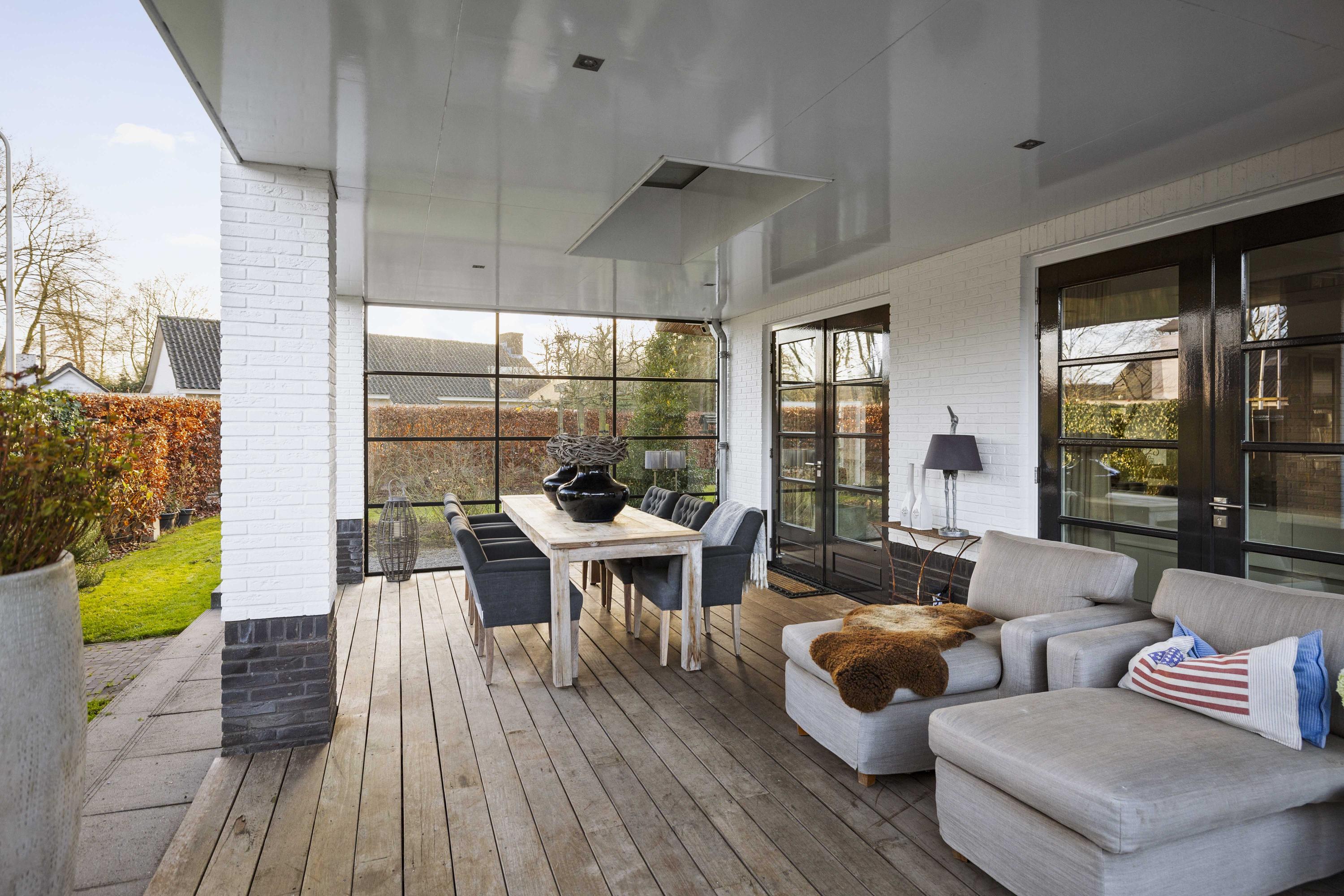 De onder architectuur aangelegde, onderhoudsvriendelijke tuin beschikt over meerdere terrassen, een beregeningsinstallatie en sfeervolle verlichting. Onder de royale veranda is het heerlijk genieten van het buitenleven dankzij het windscherm kun je hier al vroeg in het seizoen comfortabel buiten zitten. Onder de veranda is een fundering aanwezig zodat je deze eenvoudig om kunt bouwen tot b.v. een tuinkamer.
