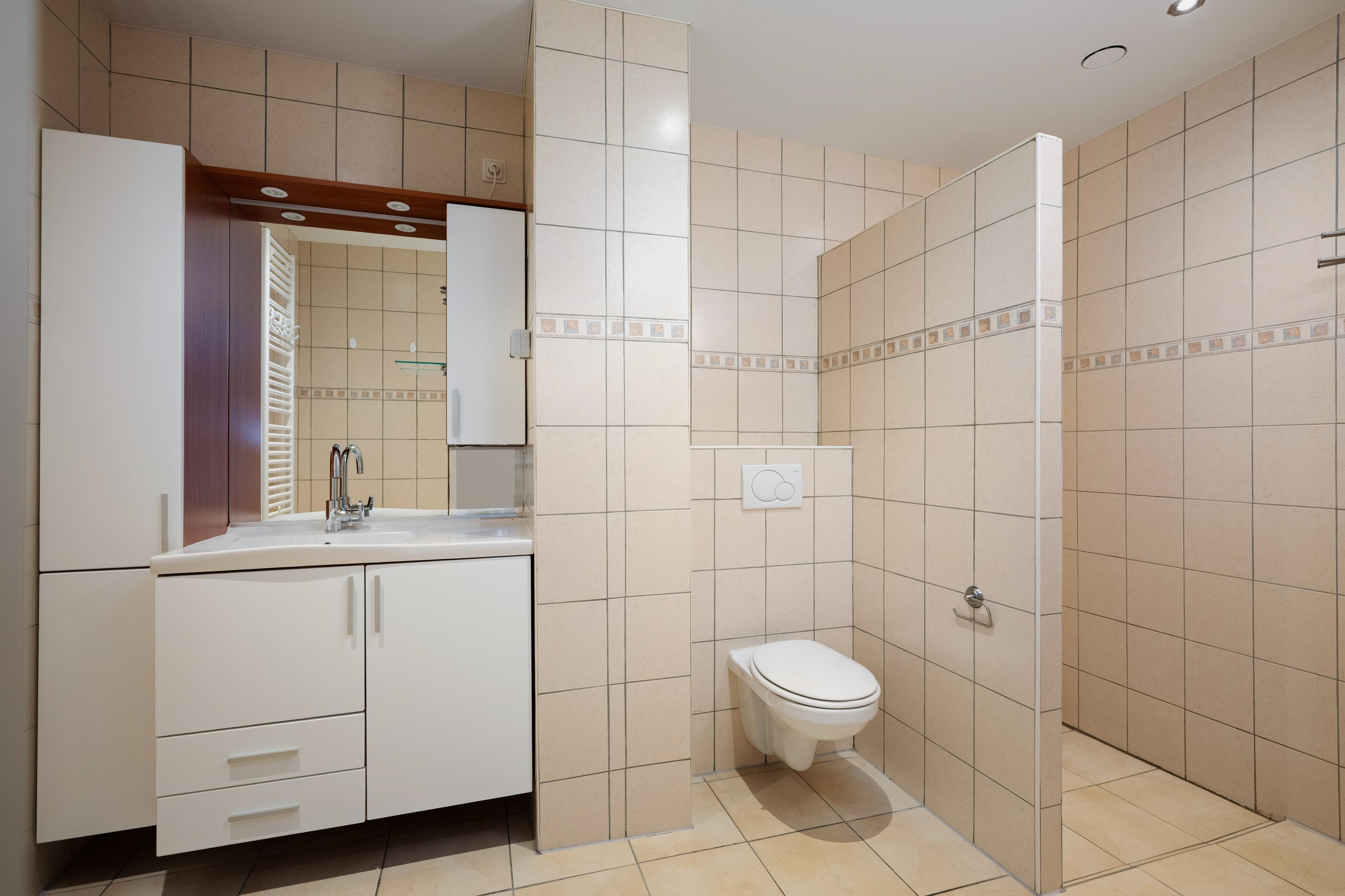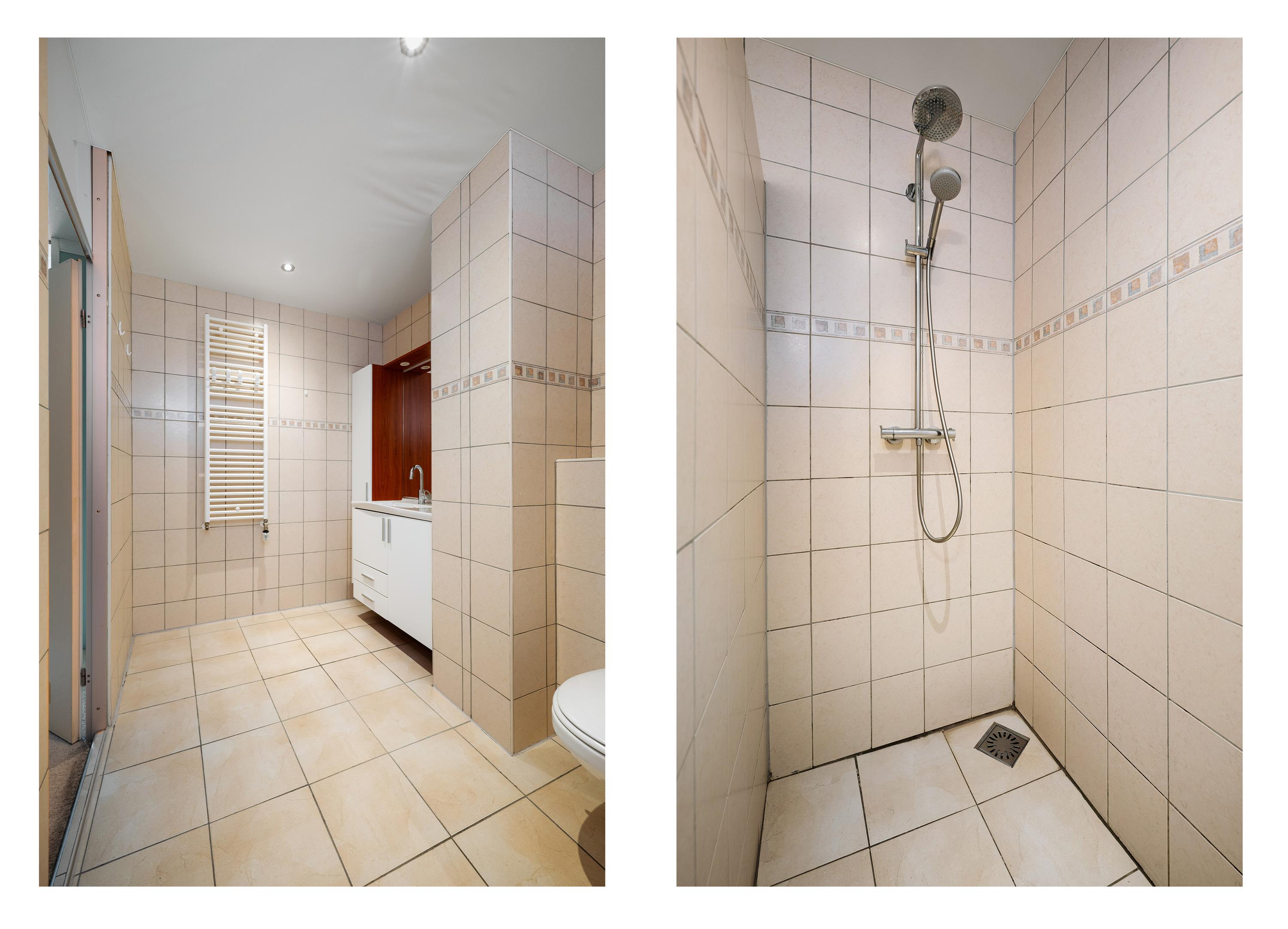 2e Verdieping: overloop met 3 slaapkamers. De nette badkamer met spanplafond uit 2025 is voorzien van inloopdouche, toilet met hangend closet, designradiator en wastafelmeubel.