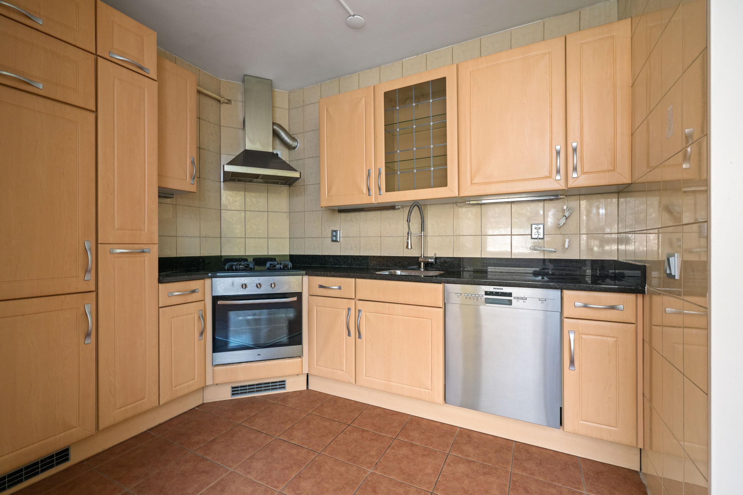 1e verdieping: entree/hal leiden naar de woonkeuken voorzien van keukenblok uit 2005 met natuurstenen aanrechtblad. De keuken beschikt over een vaatwasser, afzuigkap, 4-pits gaskookplaat en oven. Via een tussengelegen hal is de toilet met hangend closet gelegen. De woonkamer met laminaatvloer en toegang naar het balkon met kast.
