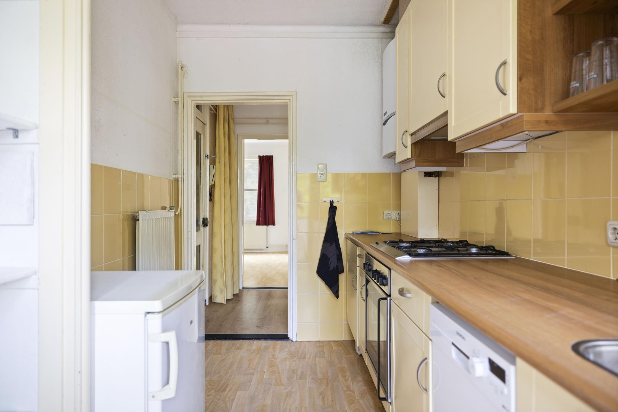 Gesloten keuken met vaste kast en toegang tot het balkon aan de voorzijde met prachtig uitzicht op de vijver en het groen.