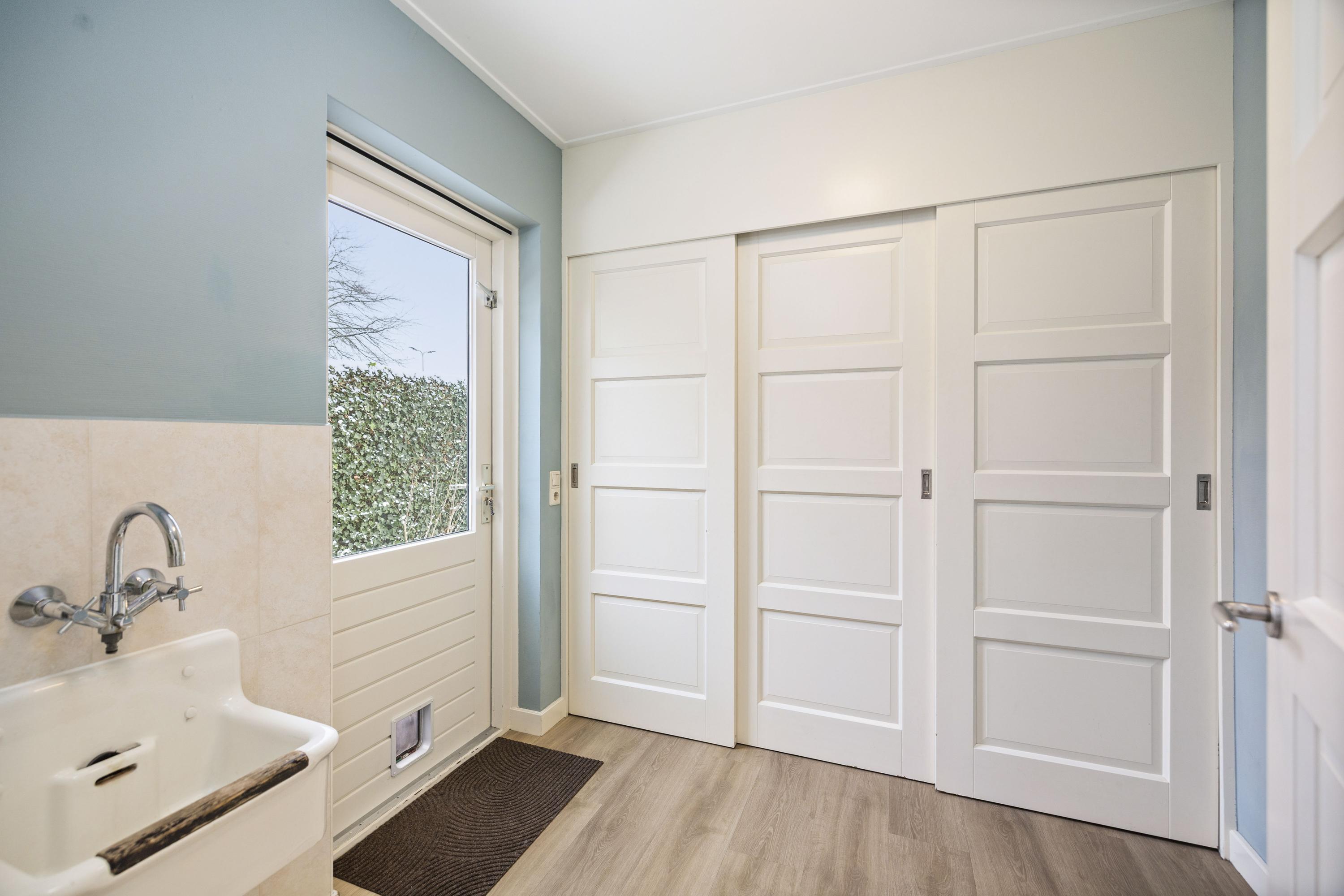 De royale woonkamer, vergroot door de uitbouw aan de achterzijde, heeft een fijne indeling en openslaande deuren naar de zonnige achtertuin. De halfopen keuken staat in directe verbinding met de bijkeuken.