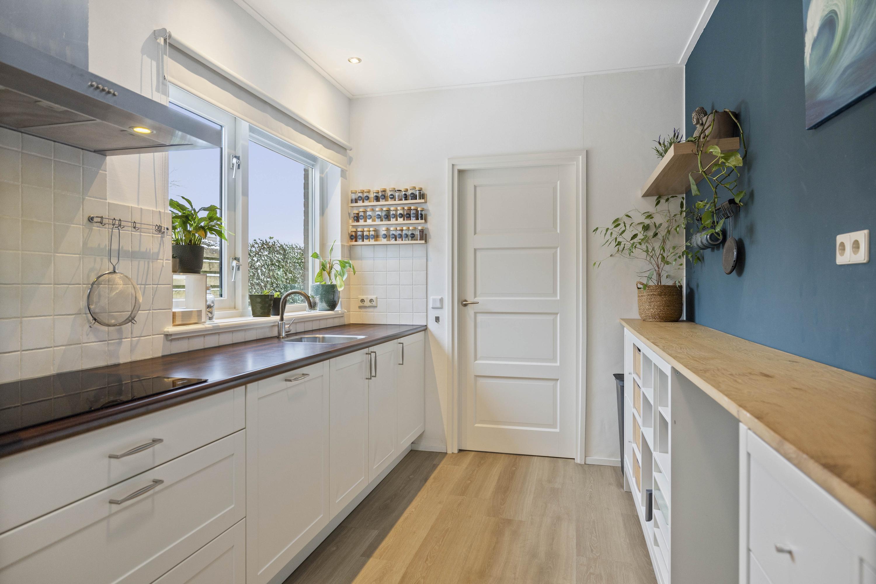 De keuken is uitgerust met inbouwapparatuur, waaronder een koelkast en combimagnetron. De bijkeuken beschikt over een kastenwand met aansluitingen voor wasmachine en droger.