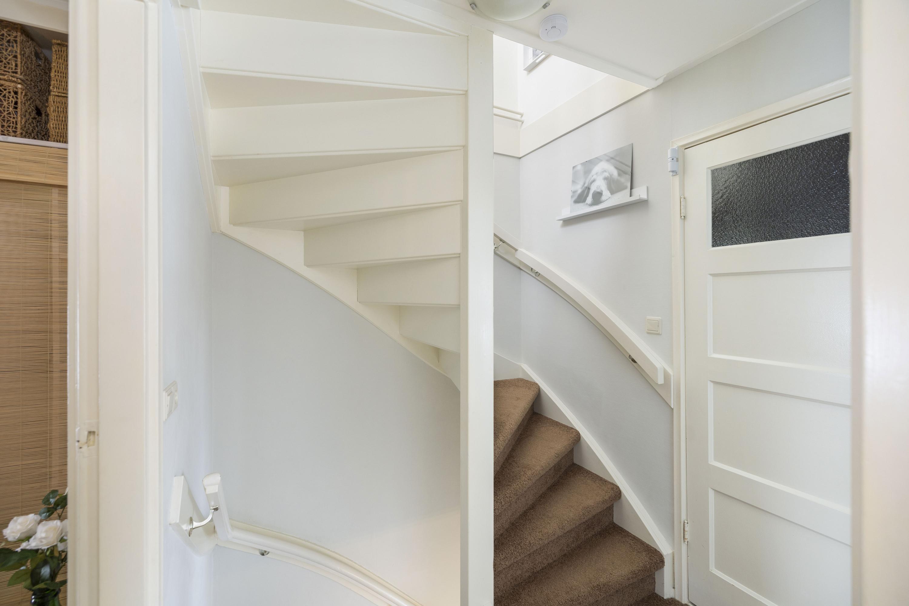 De entree leidt naar de hal met een modern, zwevend toilet met fontein. Onder de vaste trap naar de eerste verdieping bevindt zich een praktische kelder van 6,5 m².