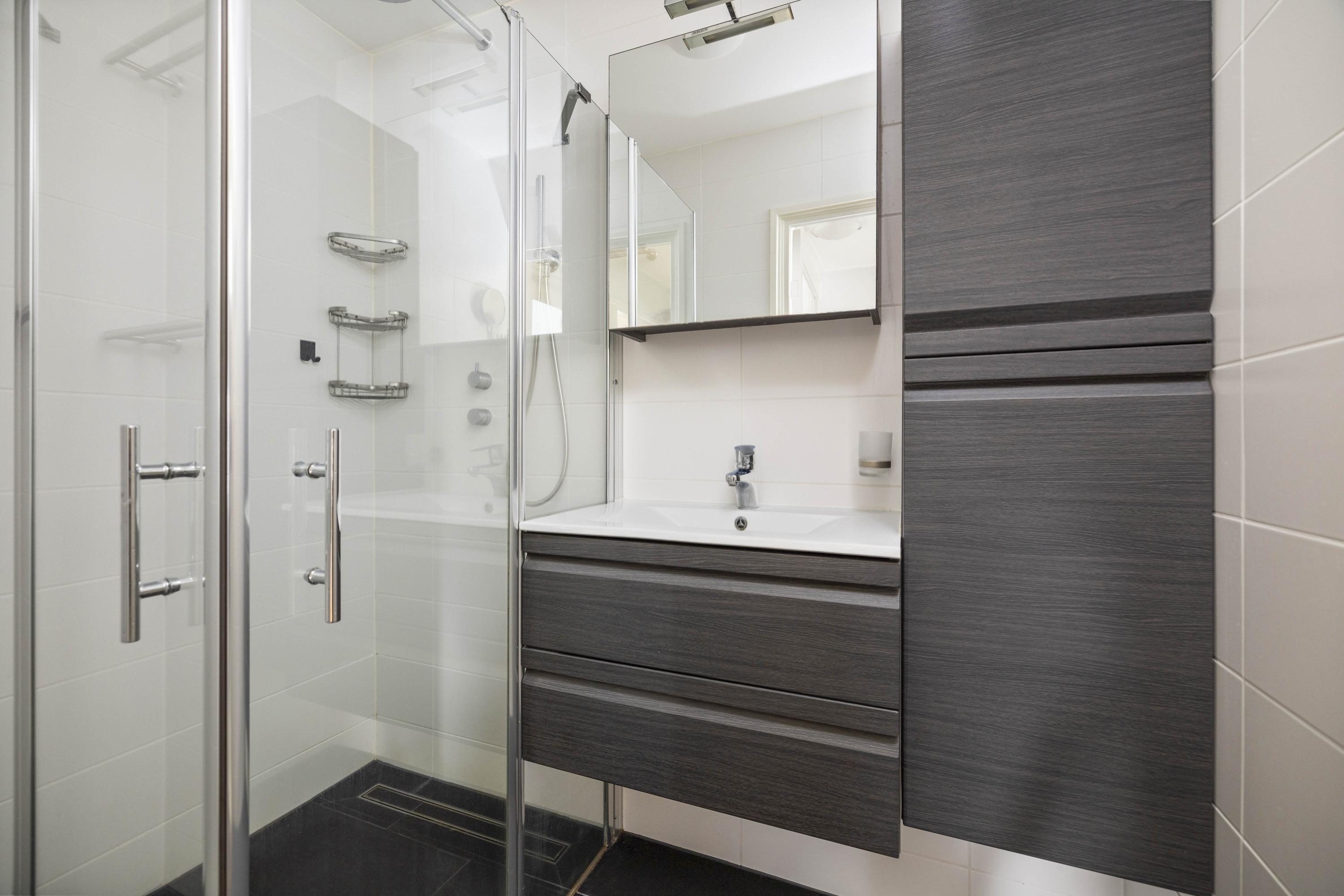 De moderne badkamer heeft vloerverwarming, een inloopdouche, een wastafelmeubel met spiegelkast, een extra badkamerkast en mechanische ventilatie.