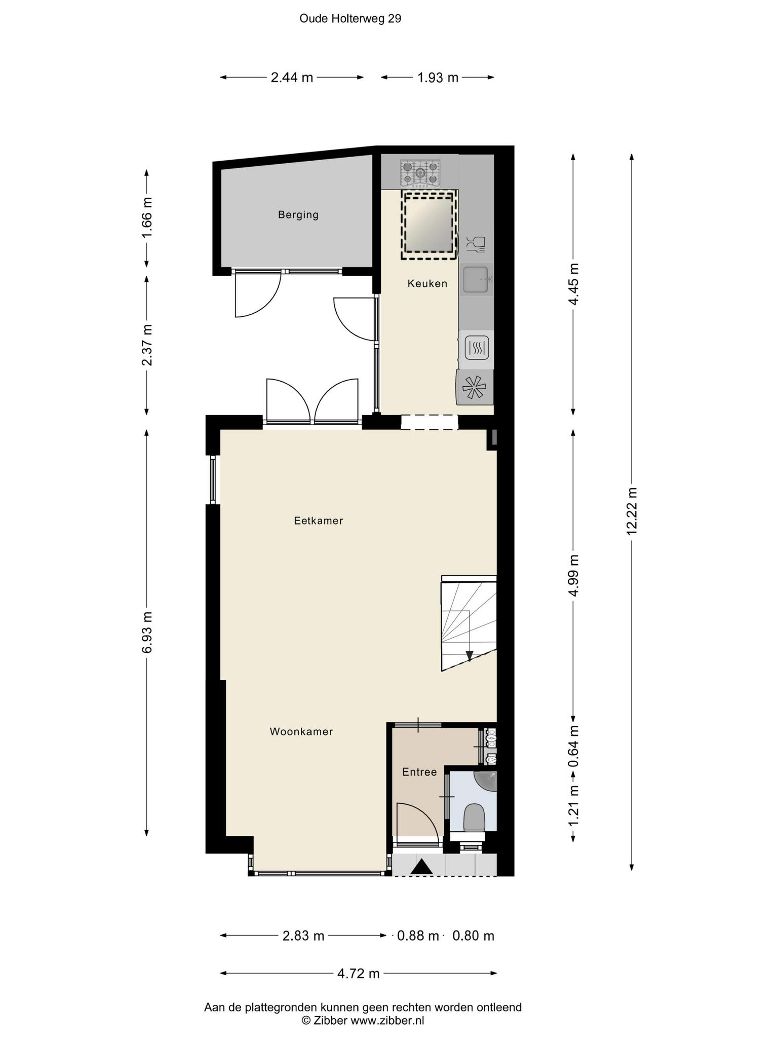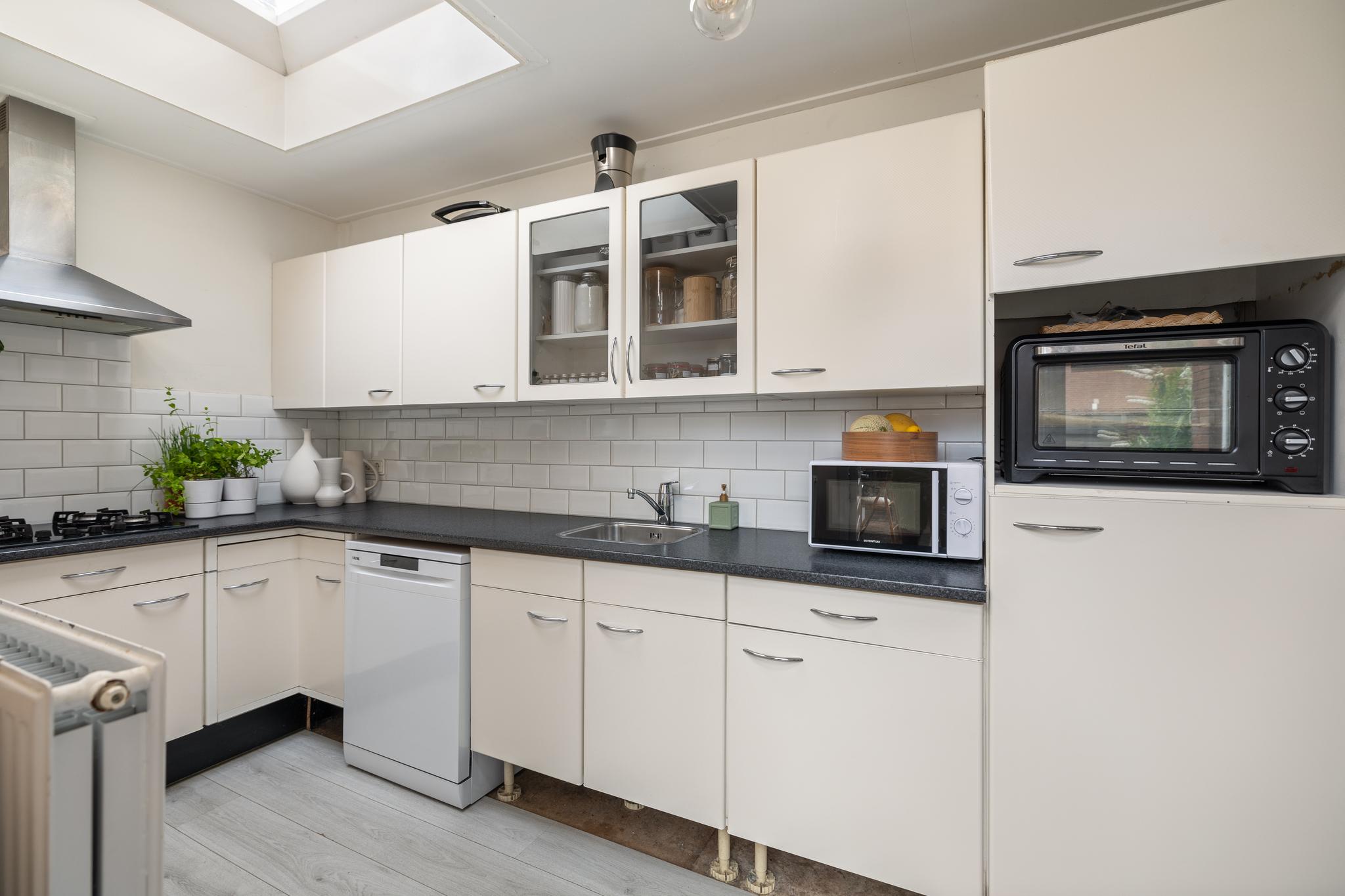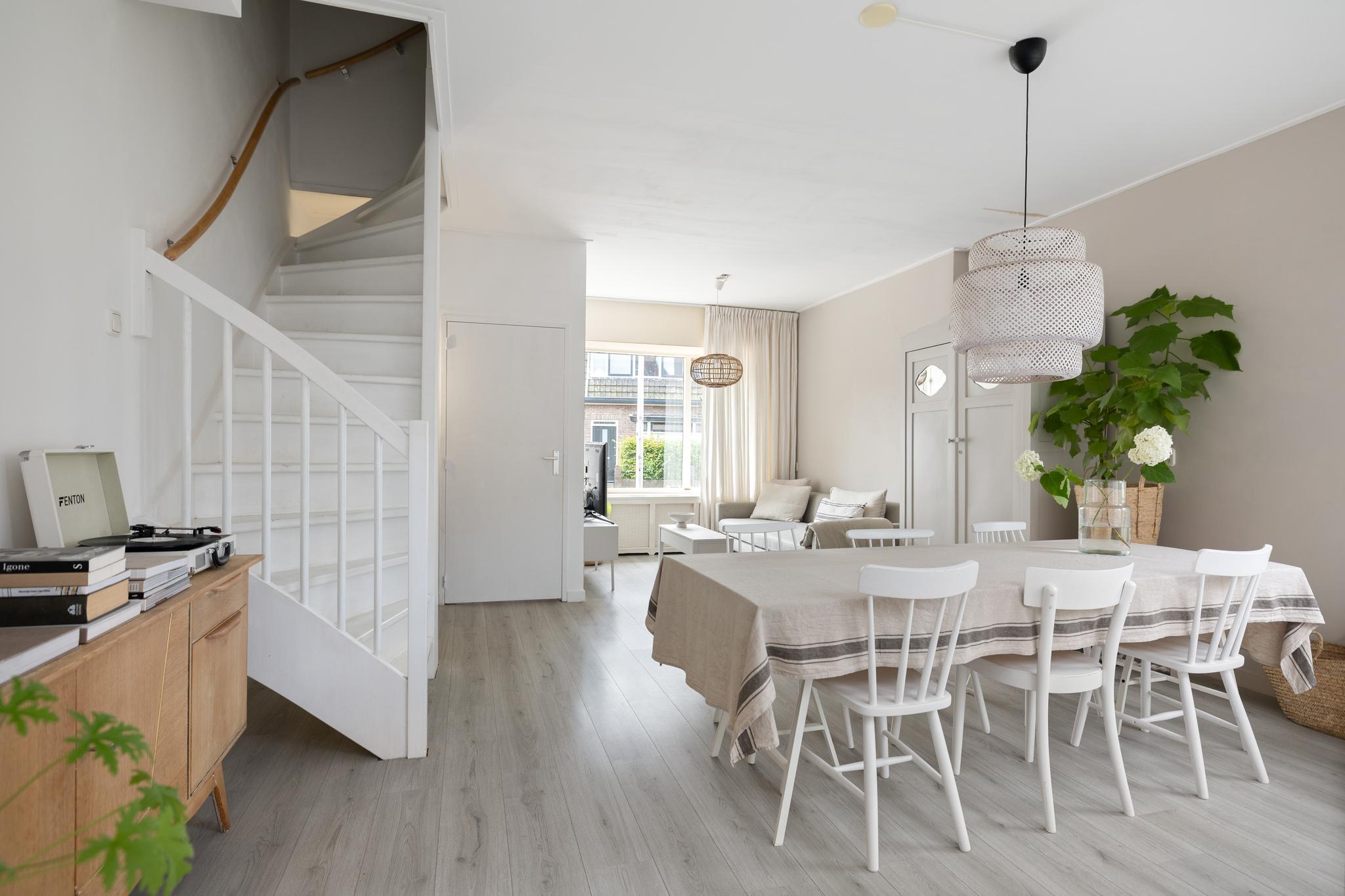 Begane grond: entree/hal, toilet met hangend closet en fonteintje, meterkast en toegang tot de woonkamer. Zeer lichte woonkamer met open trapopgang naar de eerste verdieping, erker aan voorzijde en openslaande deuren aan achterzijde naar de tuin toe. Keuken (uitbouw) in hoekopstelling met 4-pitsgasfornuis, koelkast, afzuigkap en dubbele spoelbak. Tevens is er een lichtkoepel en een tweede toegang middels een enkele deur naar de tuin aanwezig.