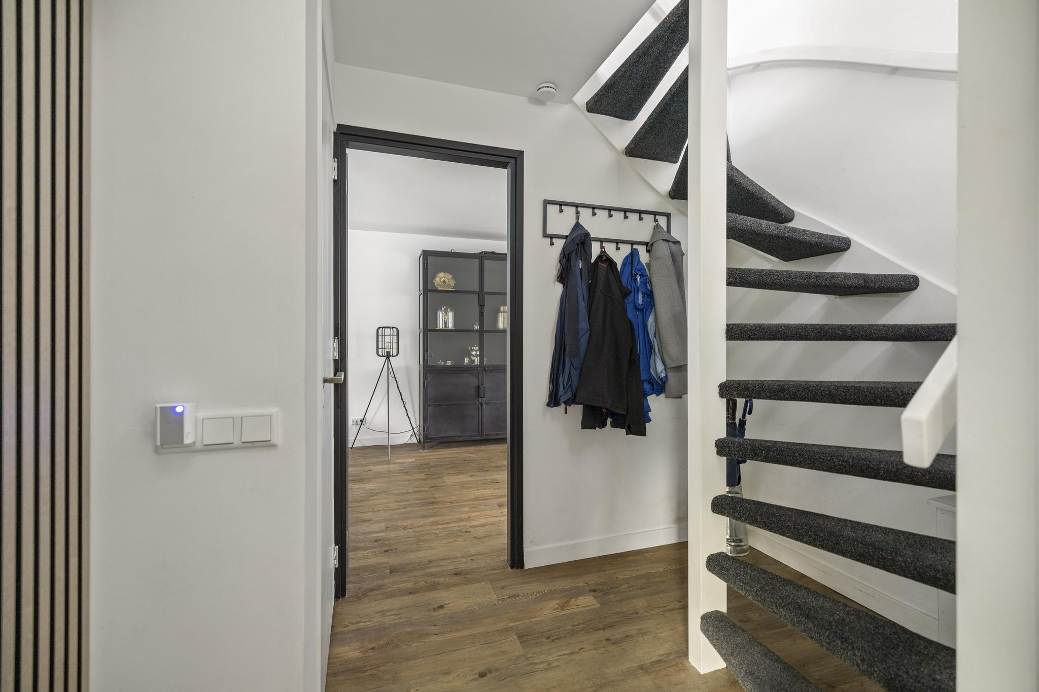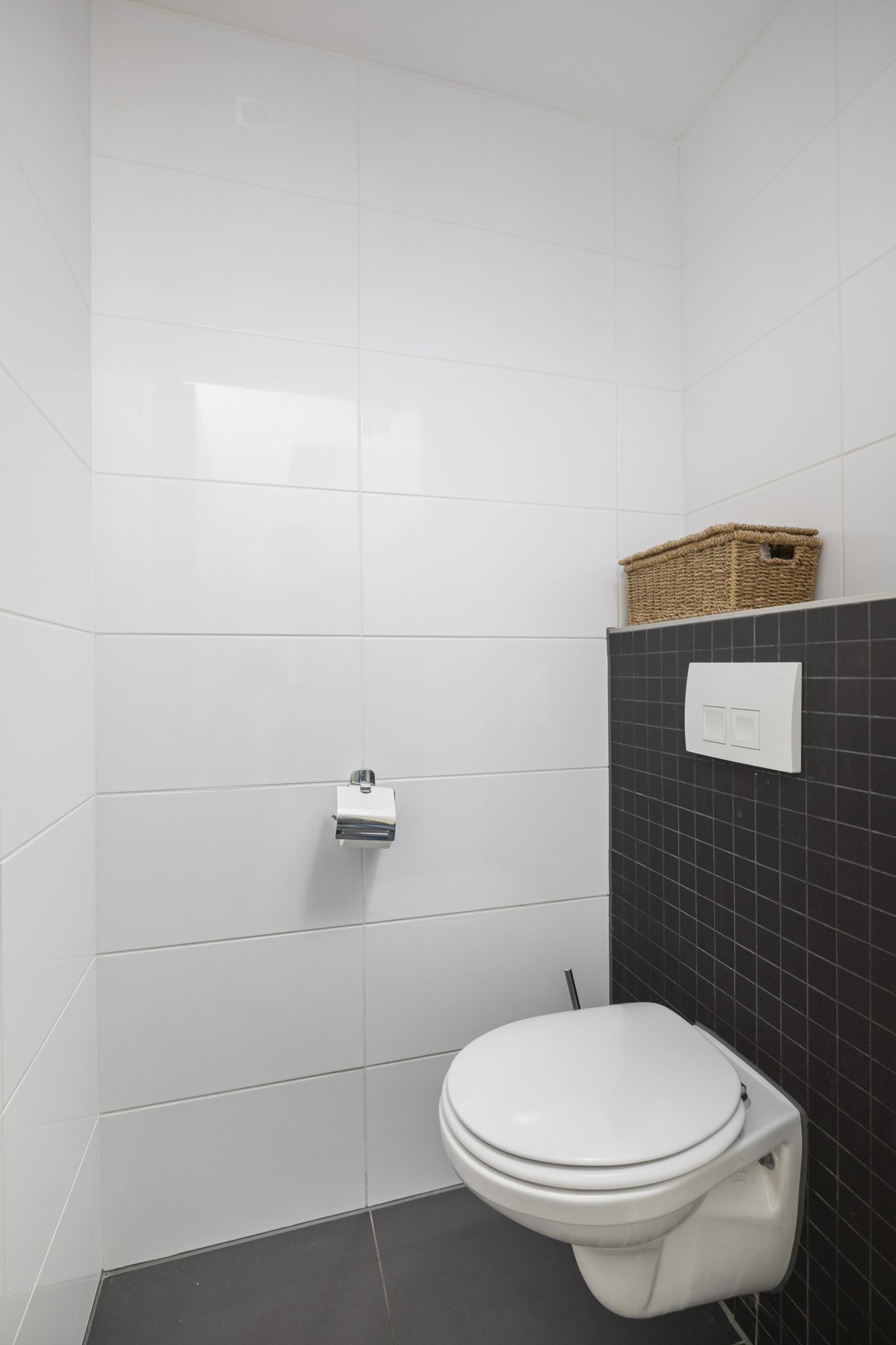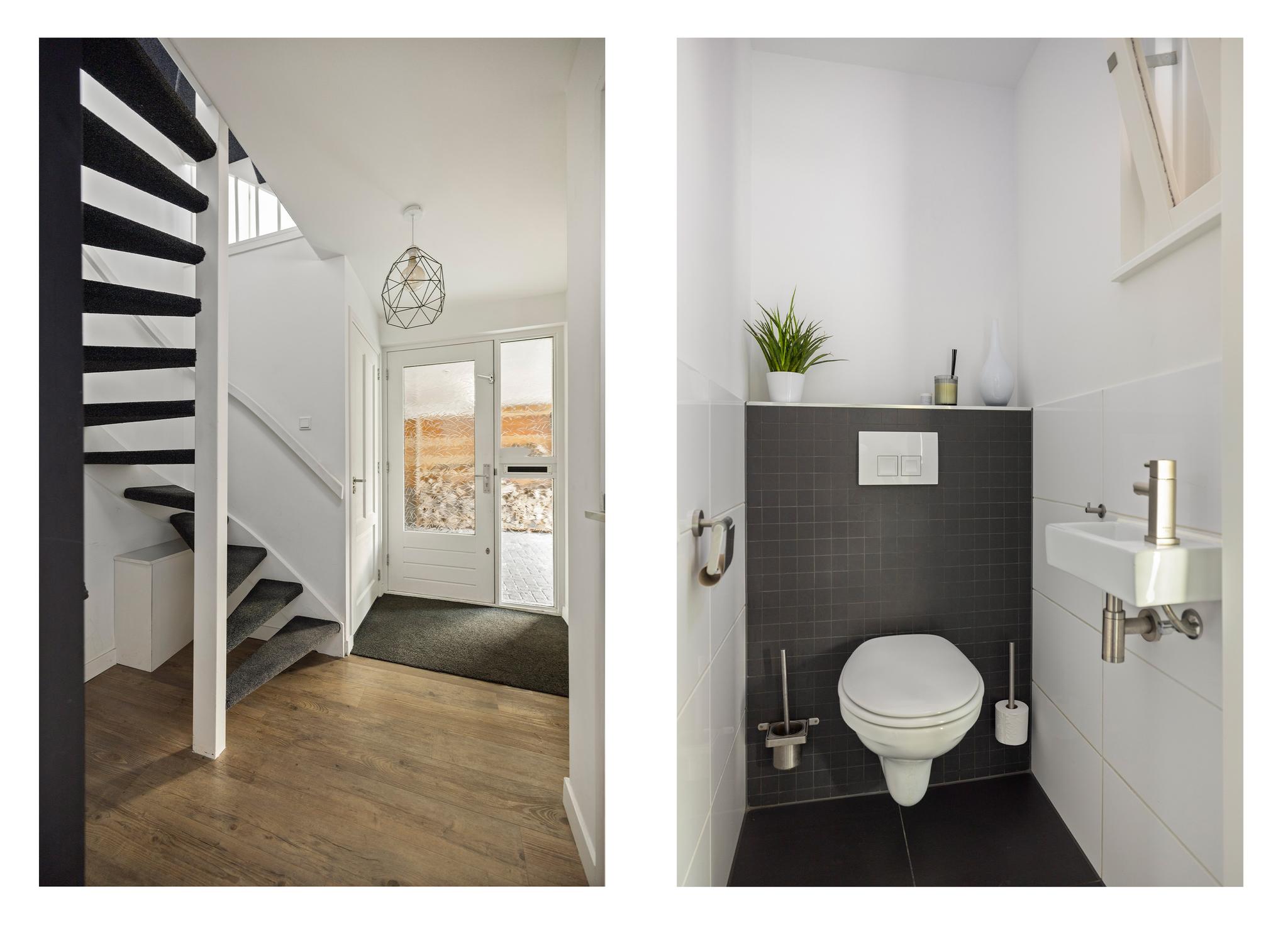 Entree, hal met garderobe, toilet met vrij hangend closet en fonteintje en trap naar de verdieping.