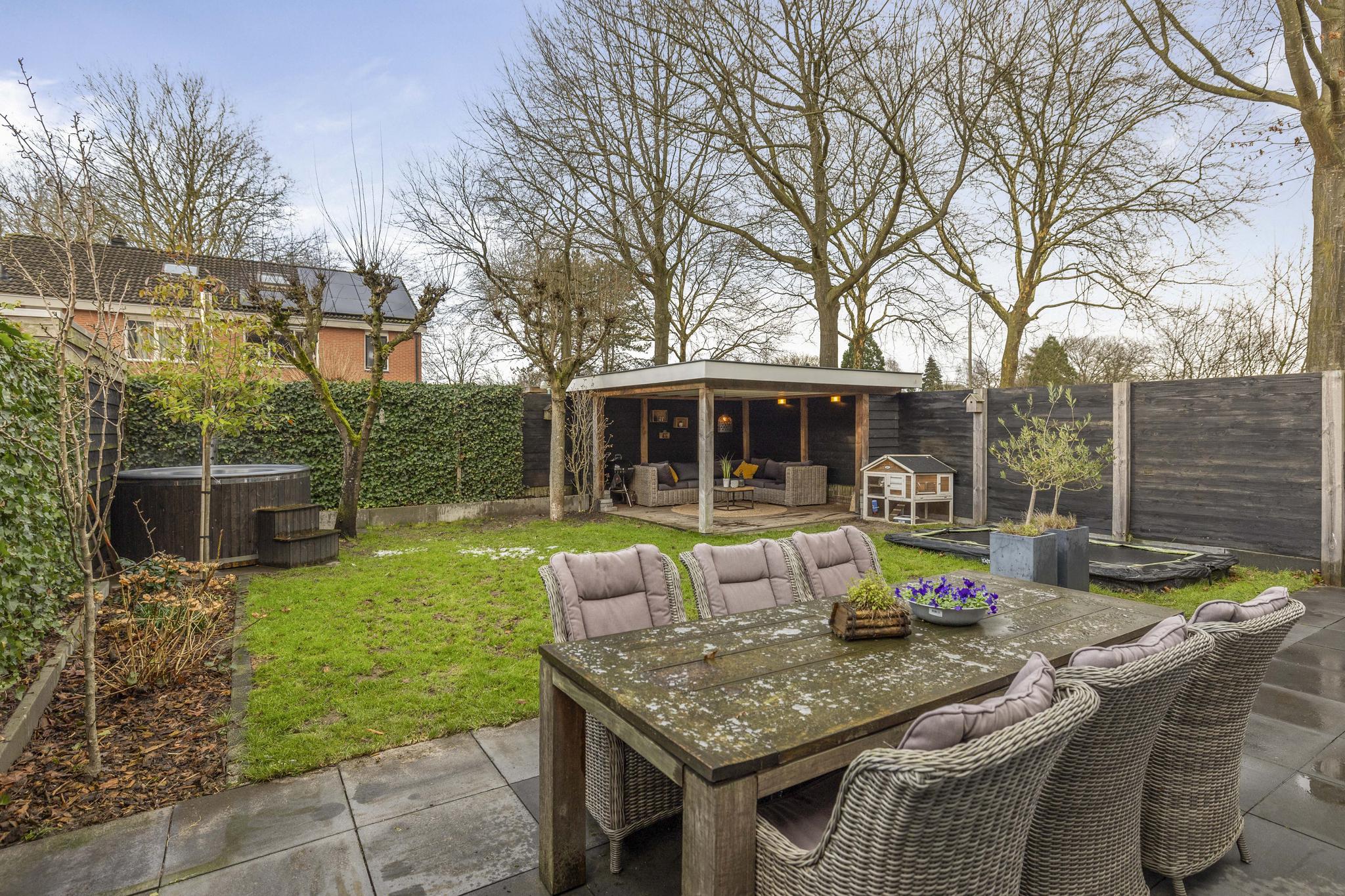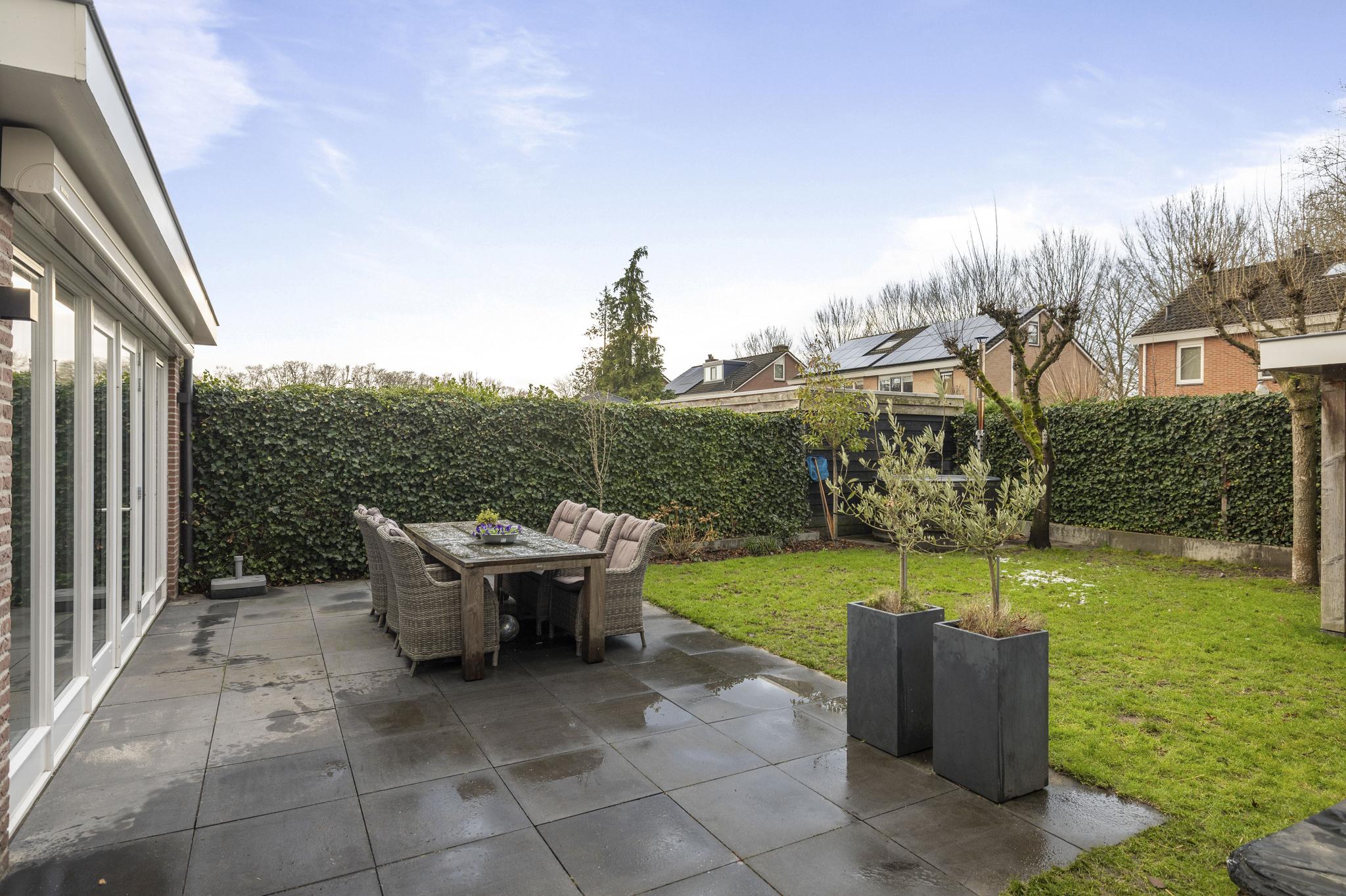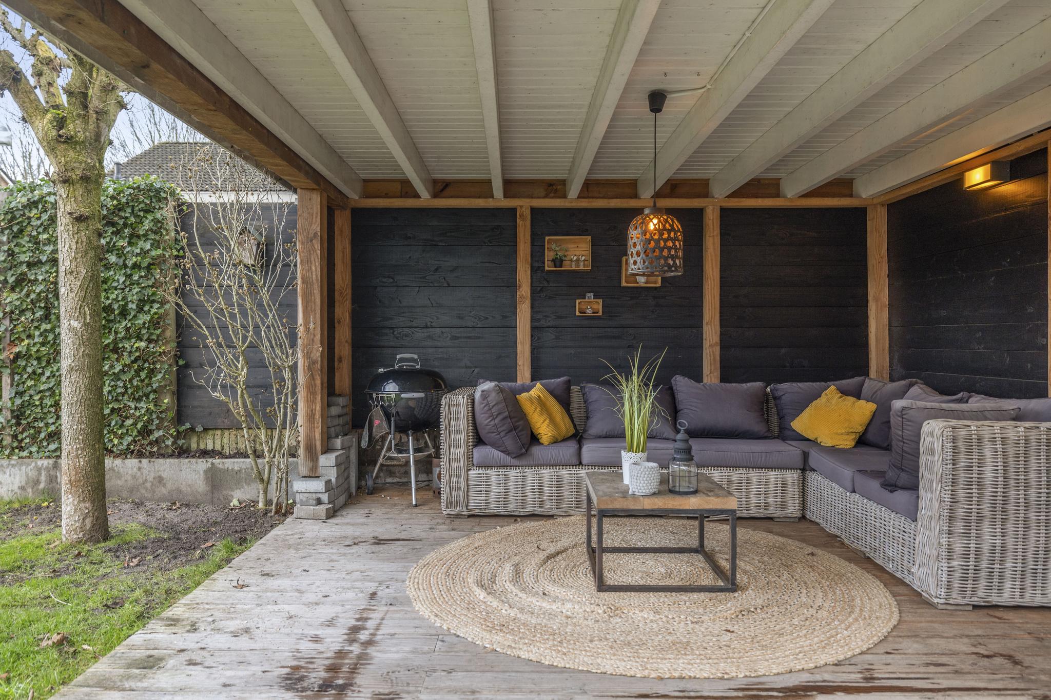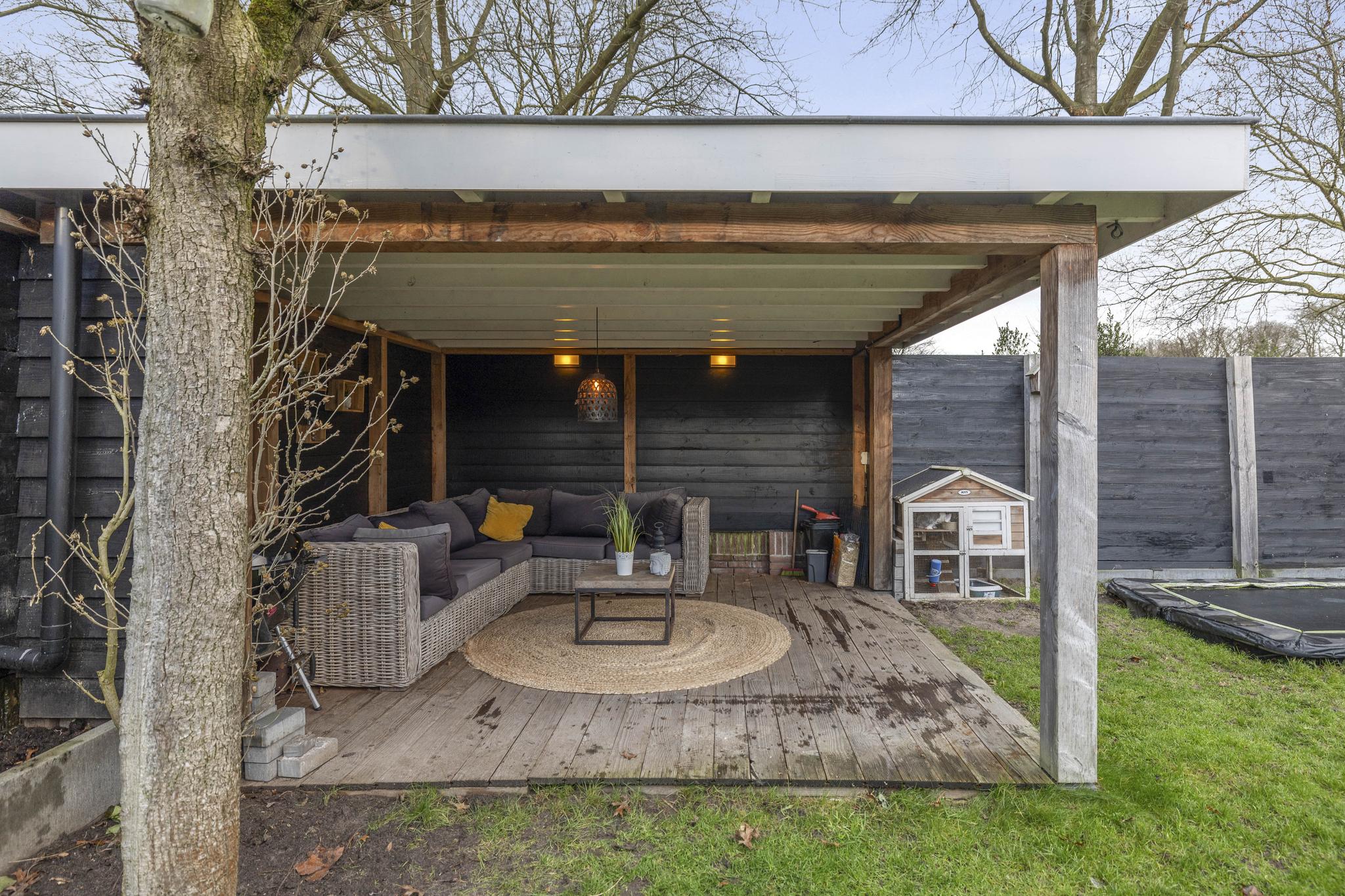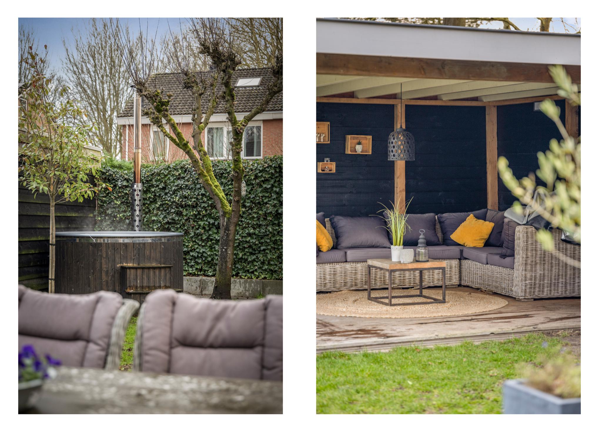 Fraai aangelegde tuin met houten grote stijlvolle veranda (met elektra) waar je heerlijk van het buitenleven kunt genieten.