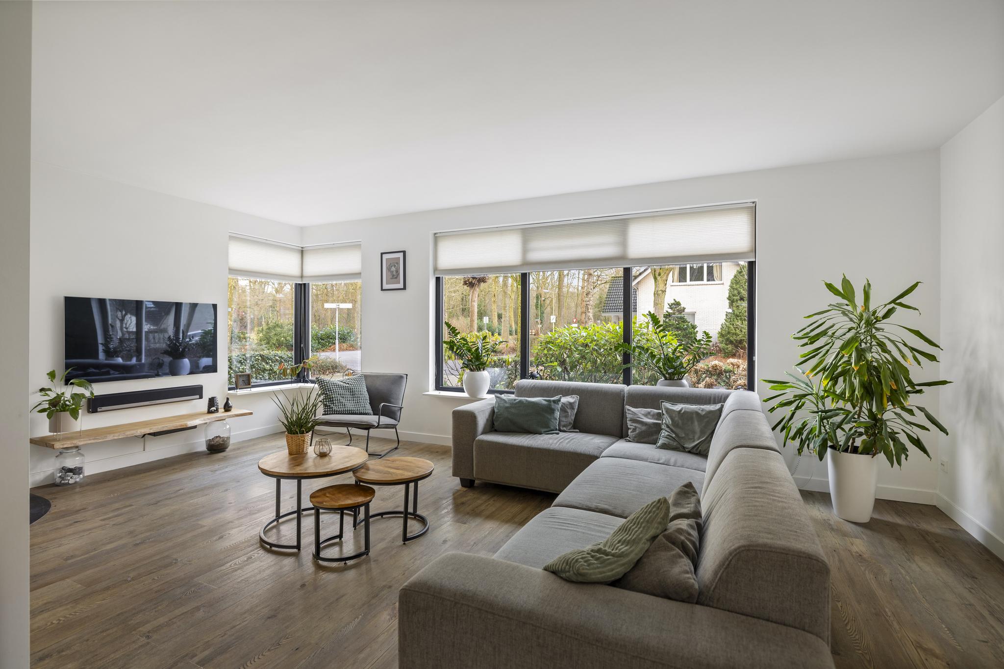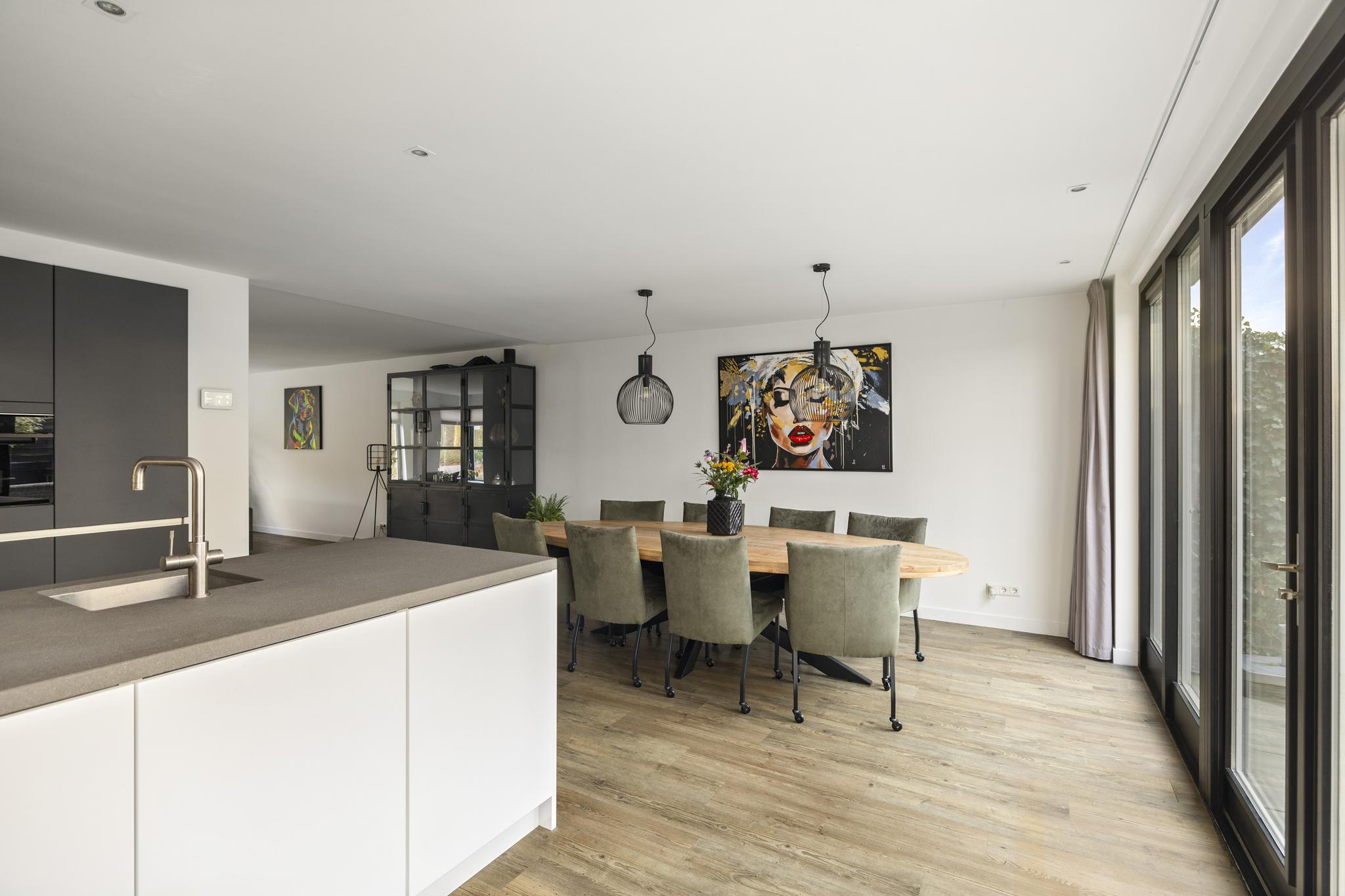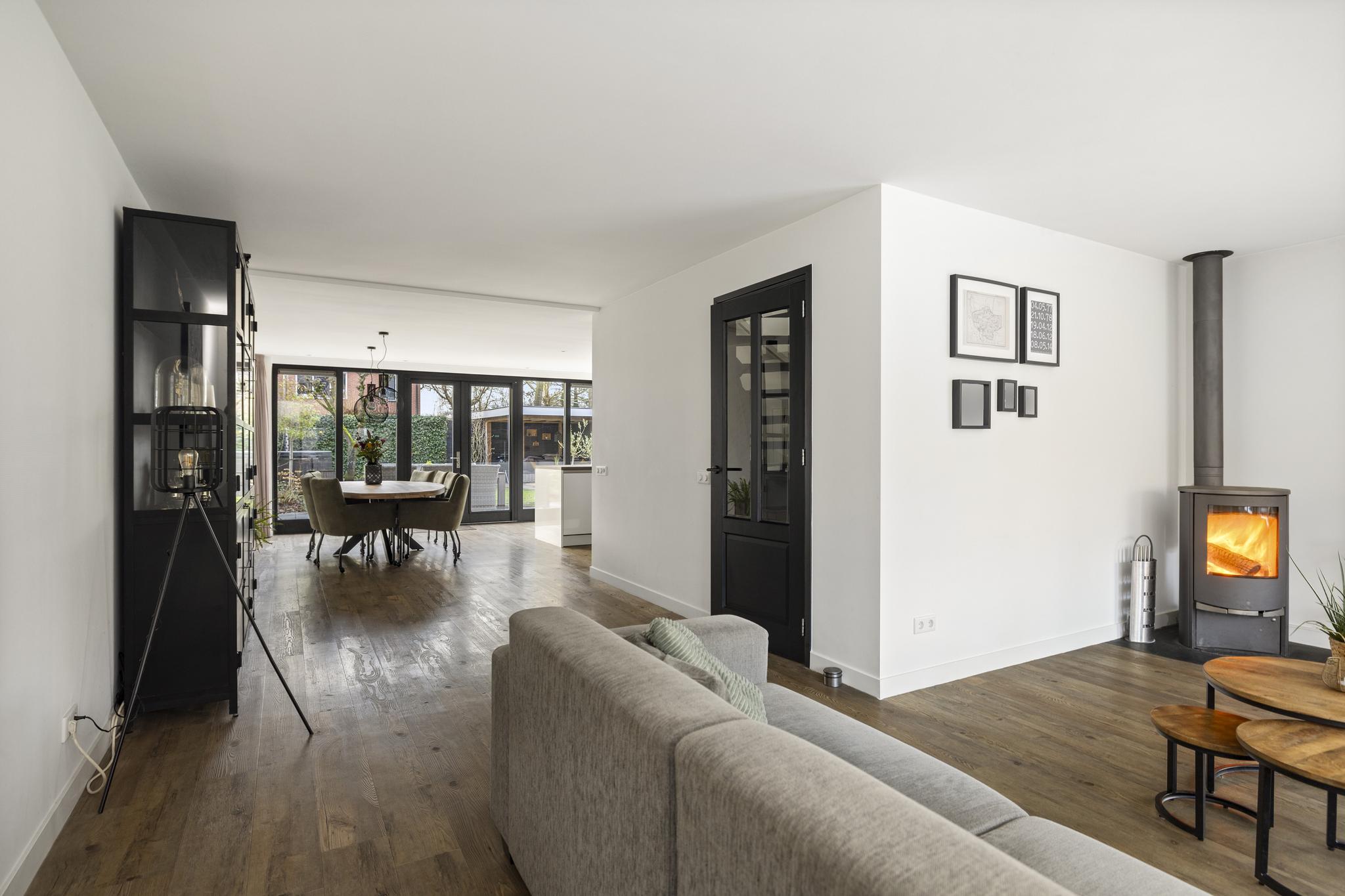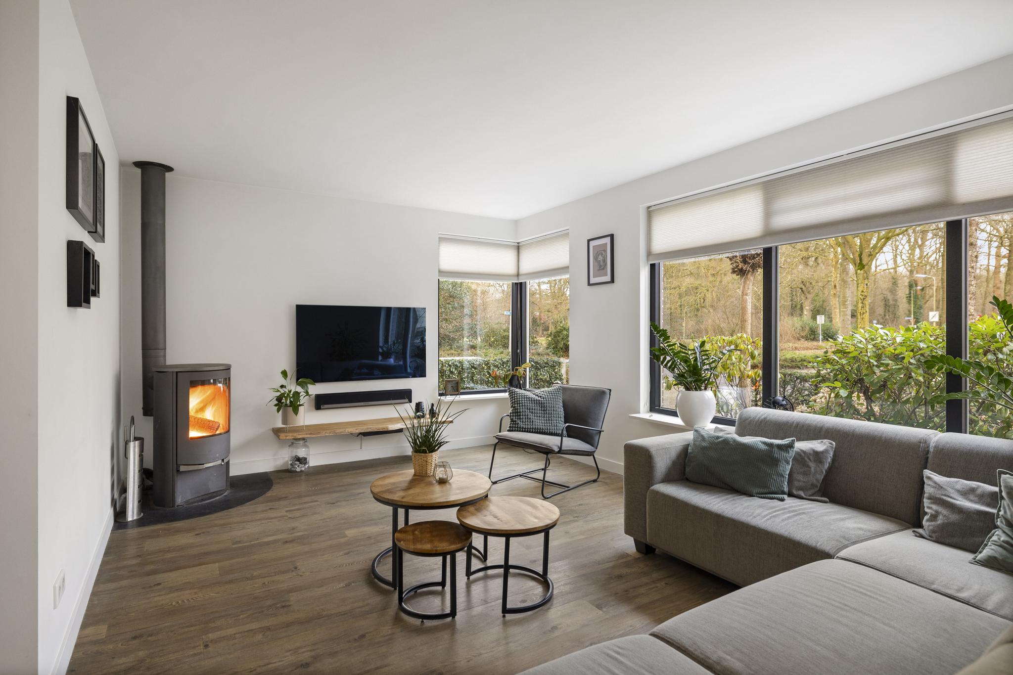 Lichte, sfeervolle woonkamer met houtkachel aansluiting en zicht op het bos aan de overkant van de woning. Aansluitend de zeer ruime uitgebouwde leefkeuken met grote pui met openslaande tuindeuren naar het terras op de zon.