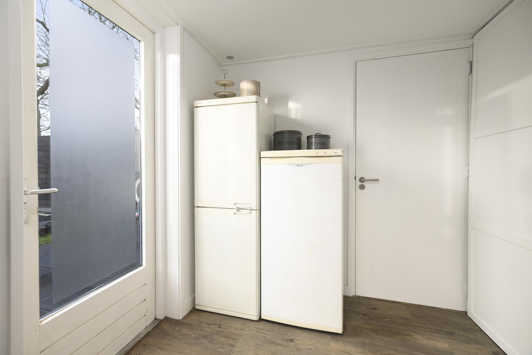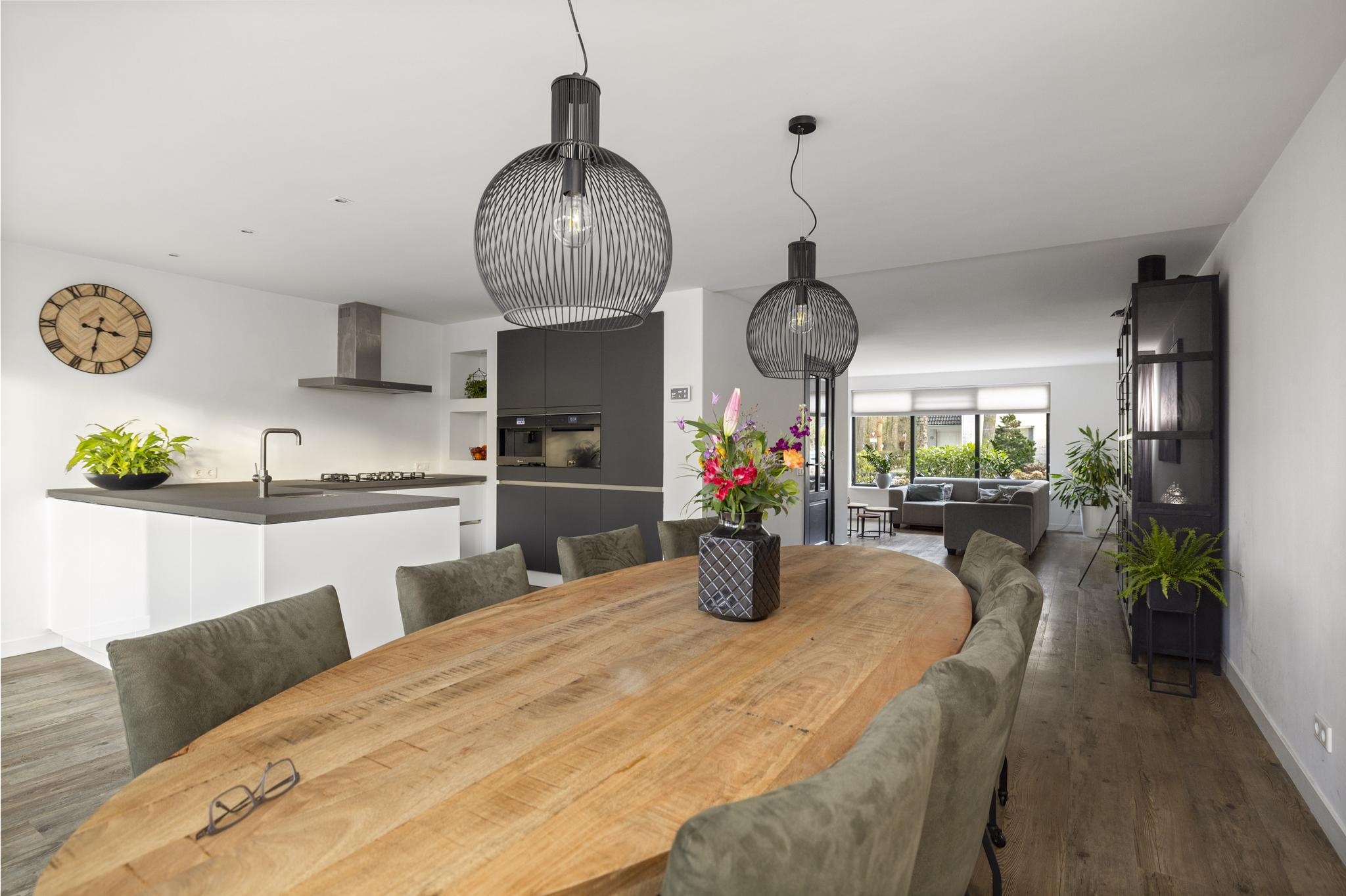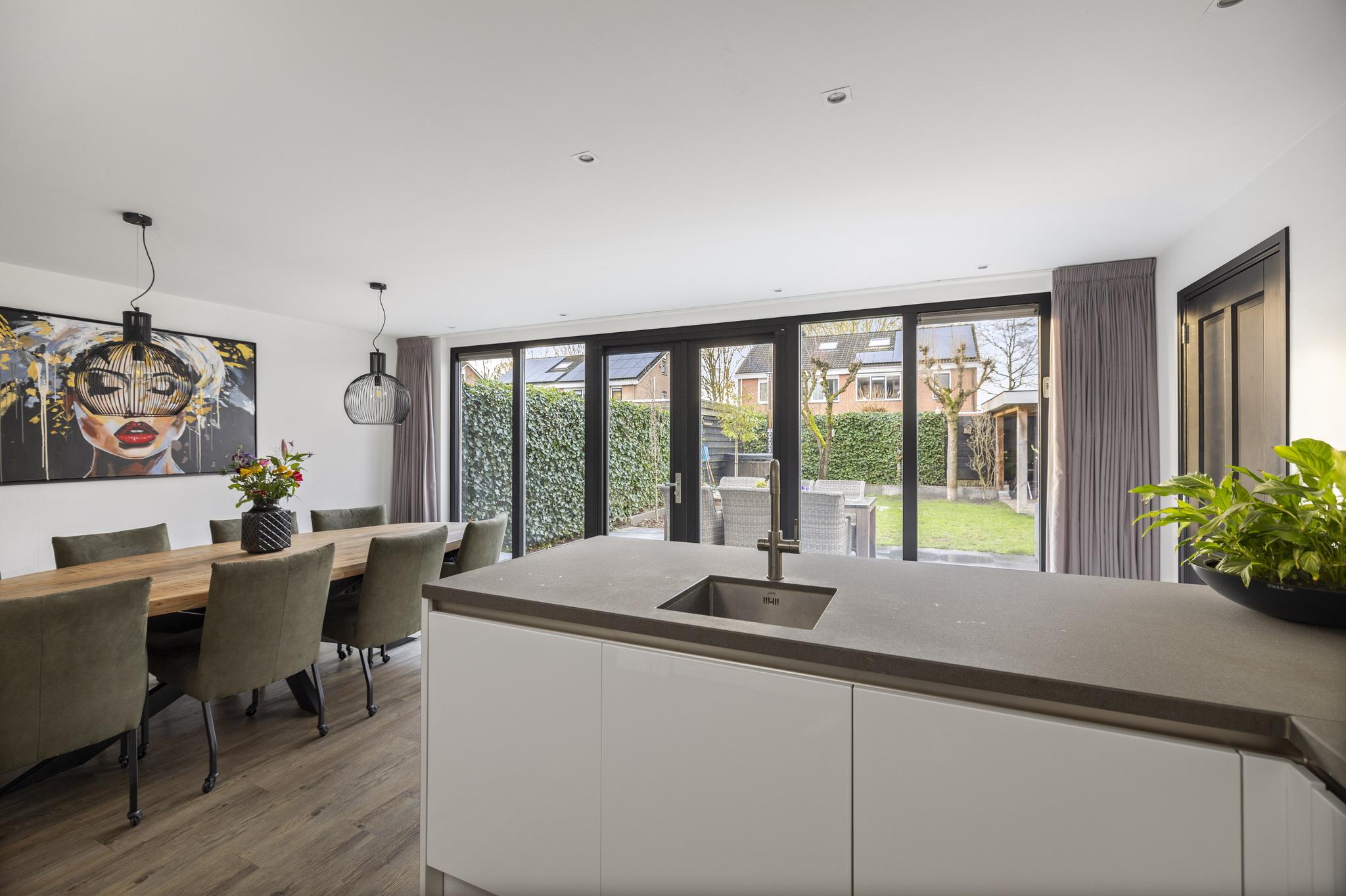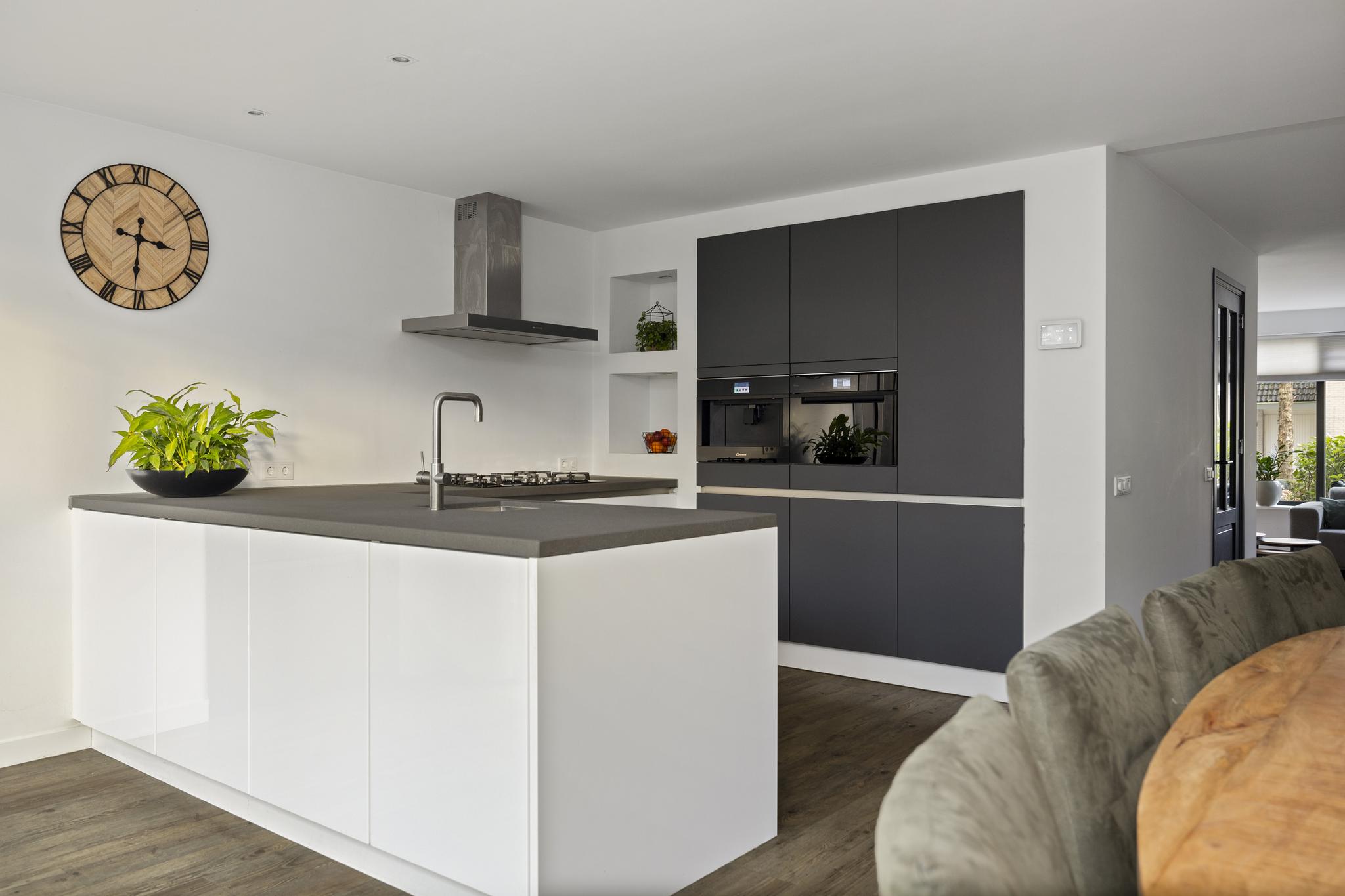 De woonkeuken is maar liefst 32 m² (!) met genoeg ruimte voor een mooie grote eettafel voor 8 personen. De luxe keuken met alle wenselijke inbouw apparatuur zoals o.a.: koffiezetautomaat, quooker, vaatwasser, koelkast en 5 pits gaskookplaat maken het plaatje compleet. De keuken is afgewerkt met een fraai composiet werkblad. Aansluitend de zeer praktische bijkeuken met grote provisiekasten en ruimte voor een extra koelkast en/of vriezer. Vanuit de bijkeuken is de tuin te bereiken en is er een doorloop naar de garage.