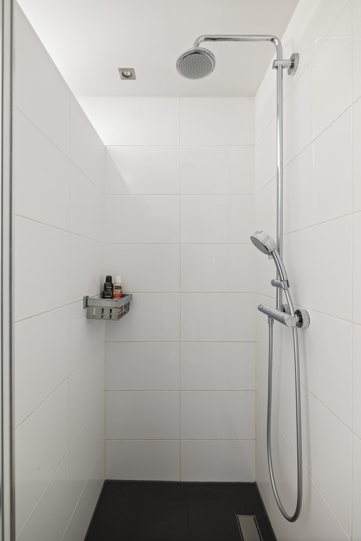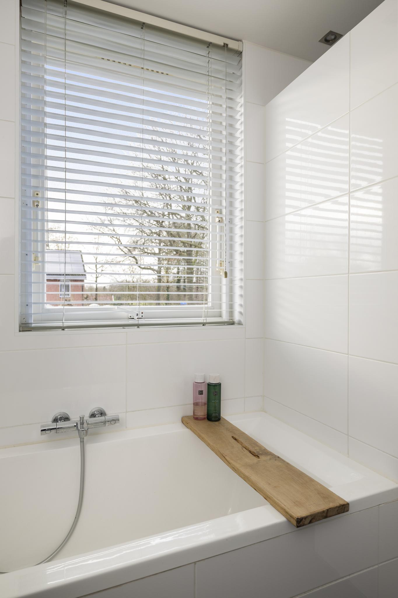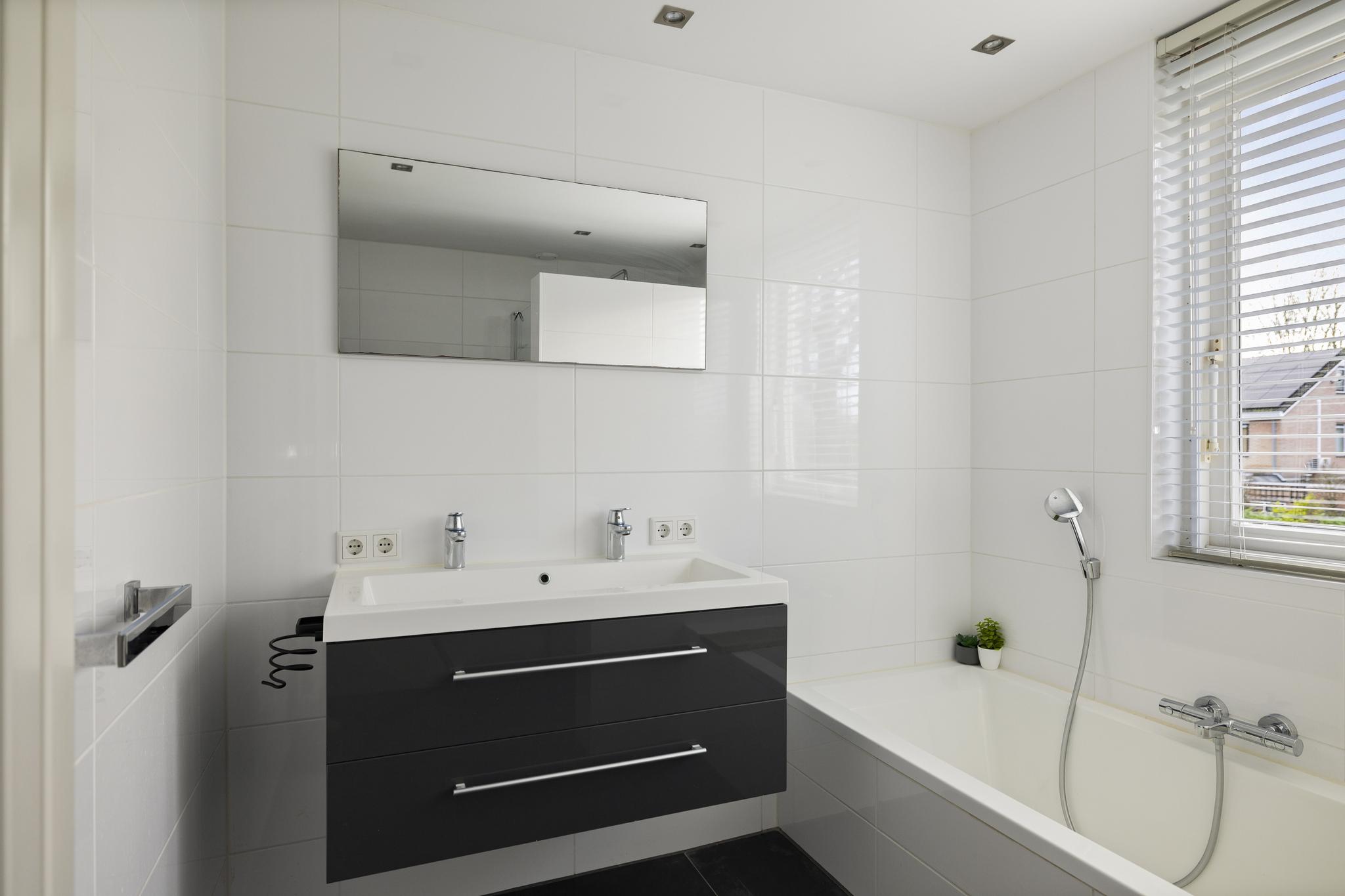 Moderne badkamer met inloopdouche, dubbel wastafelmeubel en ligbad. Er is een separaat toilet op de overloop aanwezig.